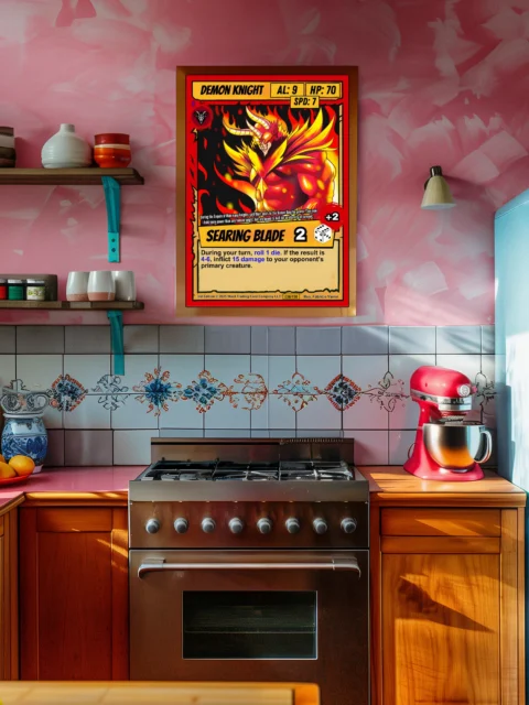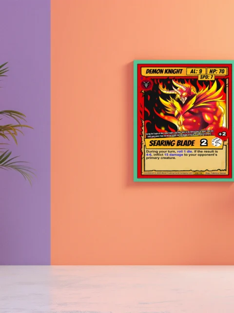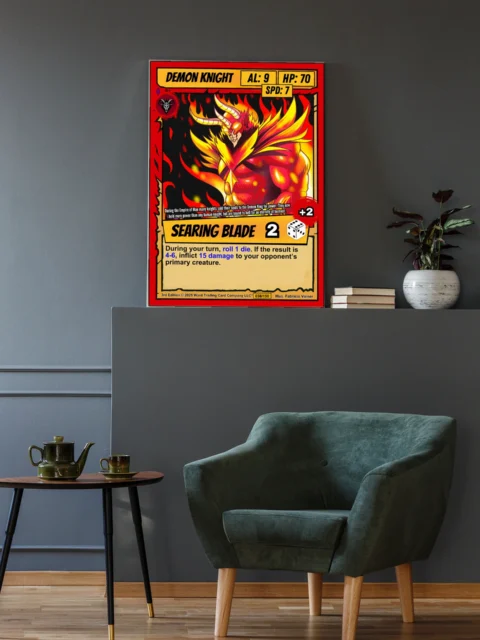 The cel-shaded rendering holds clarity from across the room. Collectors who appreciate high-saturation anime combat art will recognize the bold linework. This demon knight trading card canvas print brings Ward TCG’s signature intensity to wall scale.