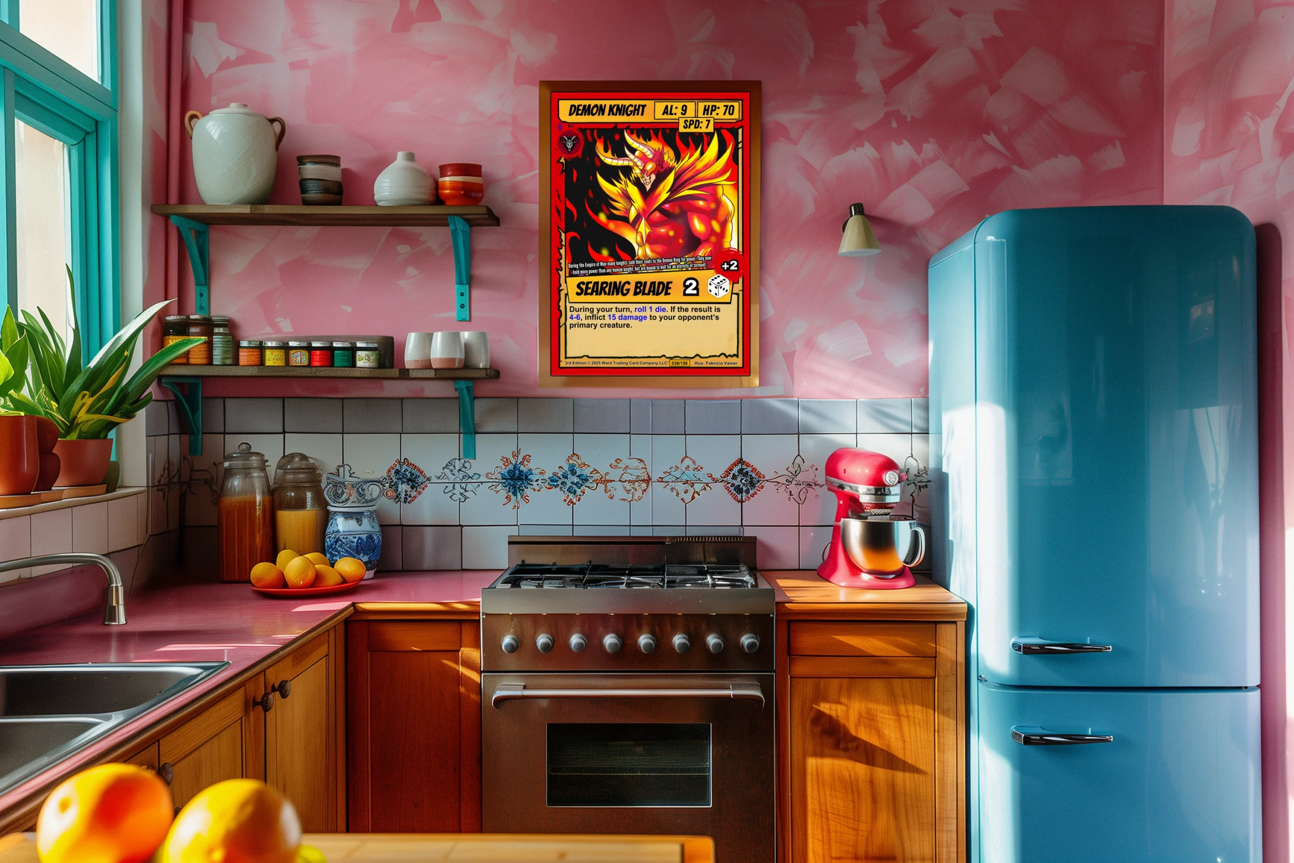 This piece suits game rooms where bold reds and yellows complement existing fantasy artwork. Alternatively, it anchors trading card collections displayed alongside other Ward TCG character prints.