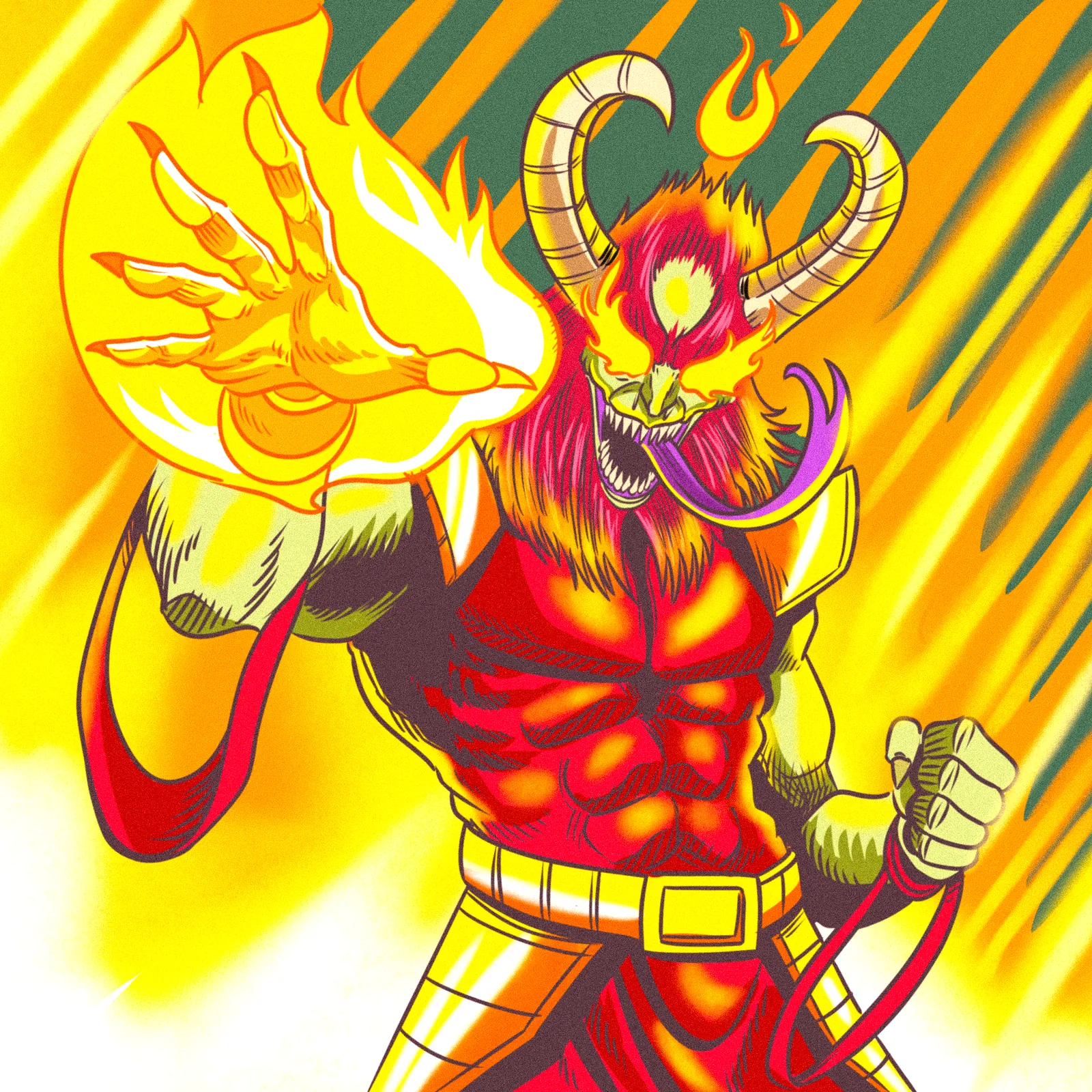 Additionally, diagonal speed lines in teal and brilliant yellow slice across the background. The flat color blocking and bold black outlines create high-contrast separation between the muscular figure and explosive backdrop. The magenta hair and beard also frame the horned face with comic book intensity.