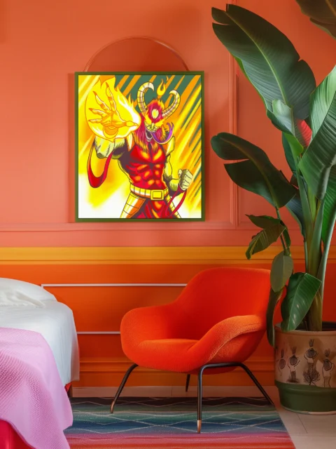 The aggressive composition suits game rooms where fantasy combat art anchors collector displays. Additionally, the bold linework holds clarity in creative studios that favor manga-influenced illustration styles.