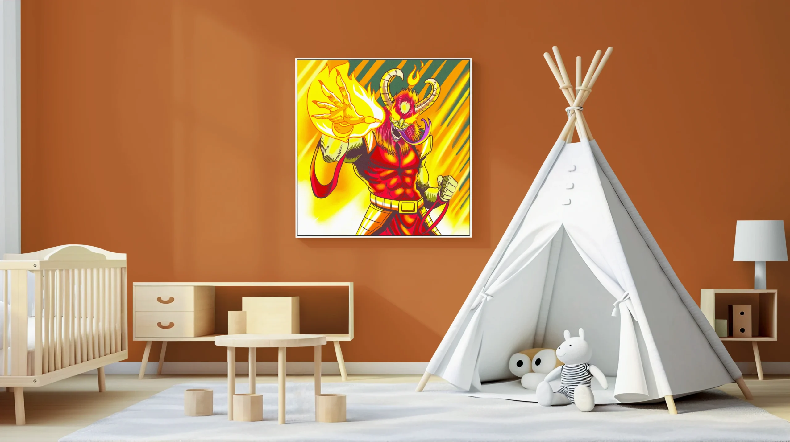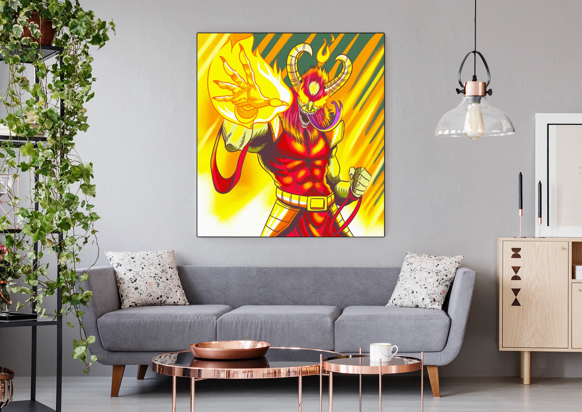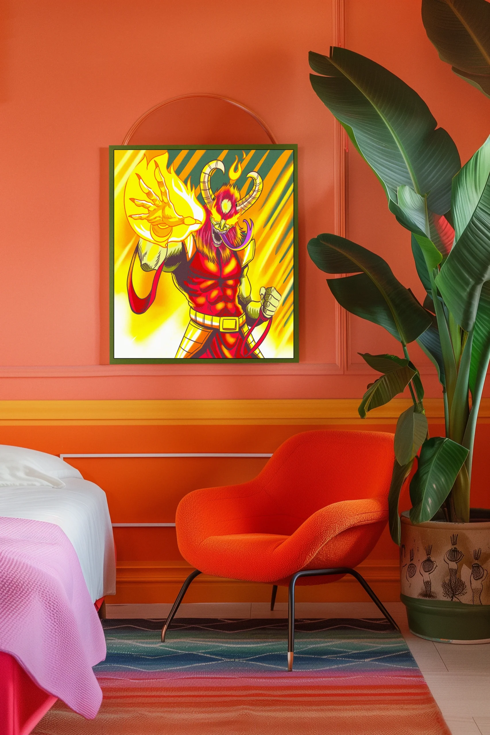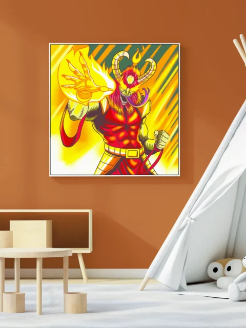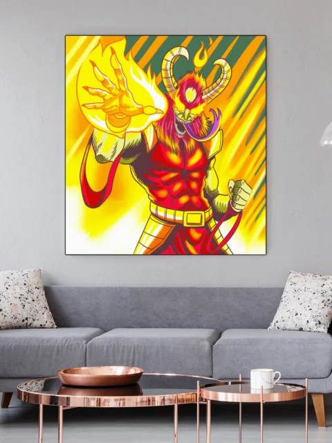 A red-skinned demon raises one clawed hand wreathed in yellow-orange flame. This demon magic art trading card art canvas print captures Fabricio Vainer’s cel-shaded illustration at full scale. The creature’s third eye glows yellow, notably punctuating the aggressive forward stance.