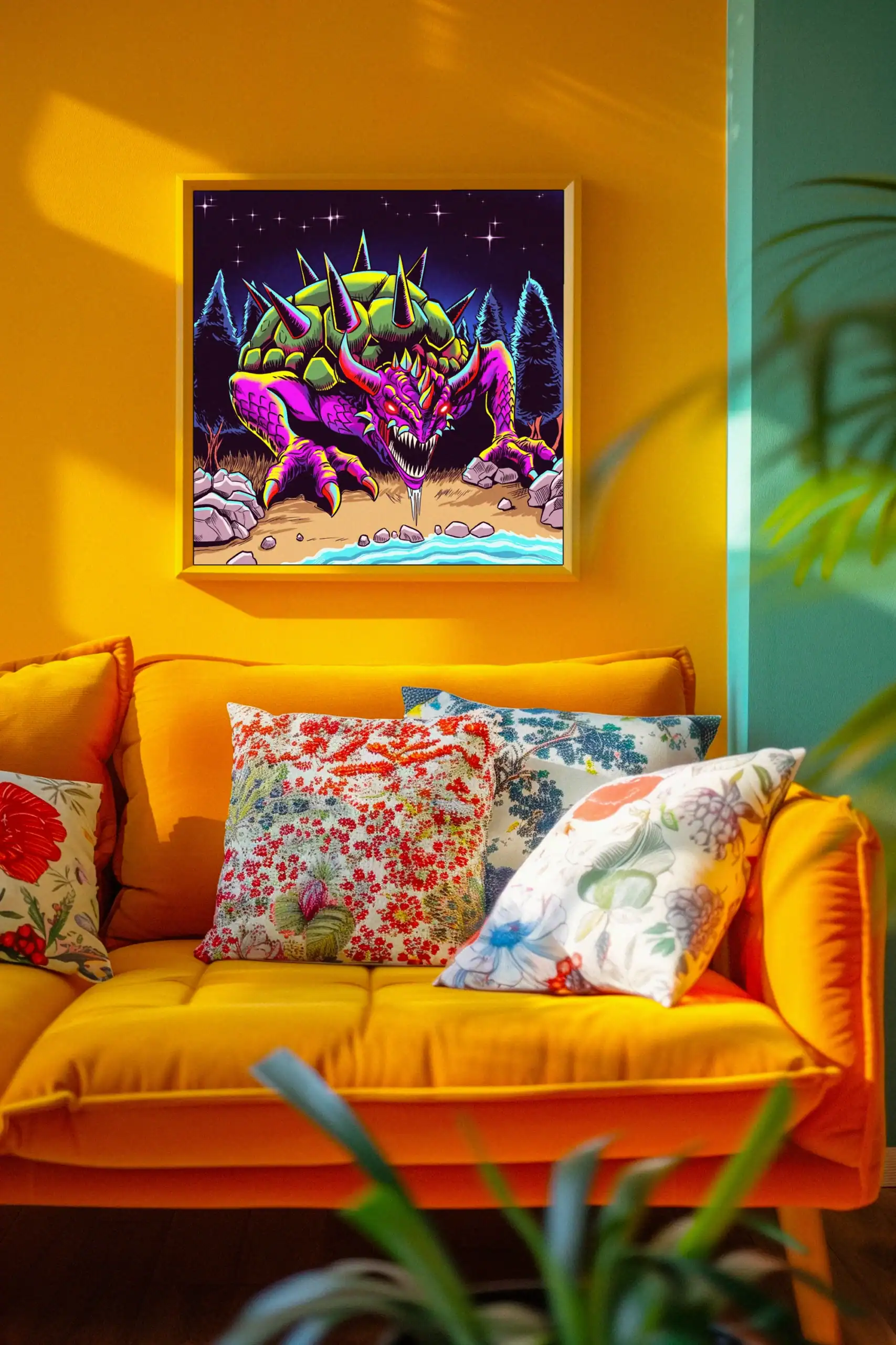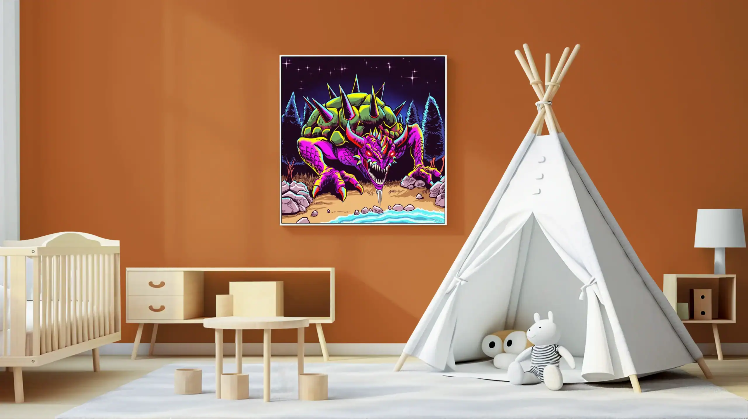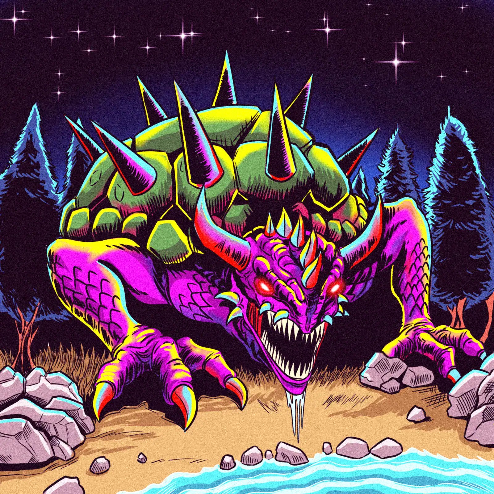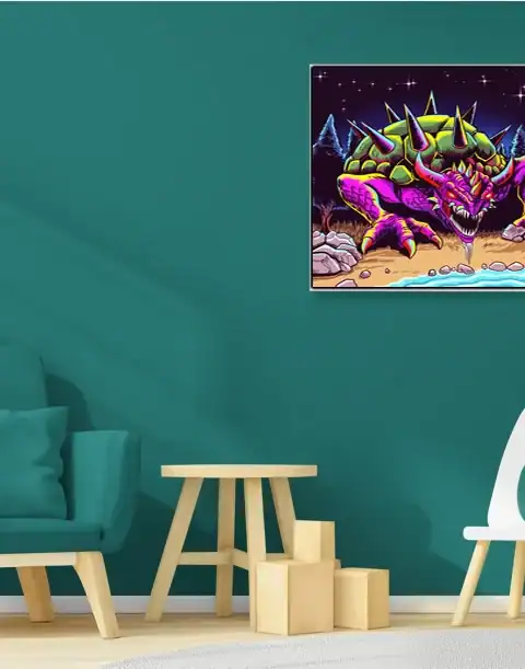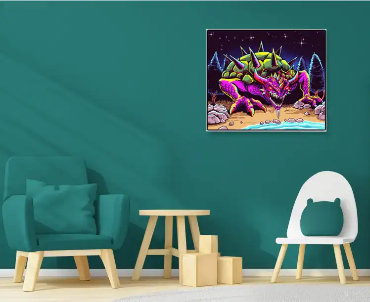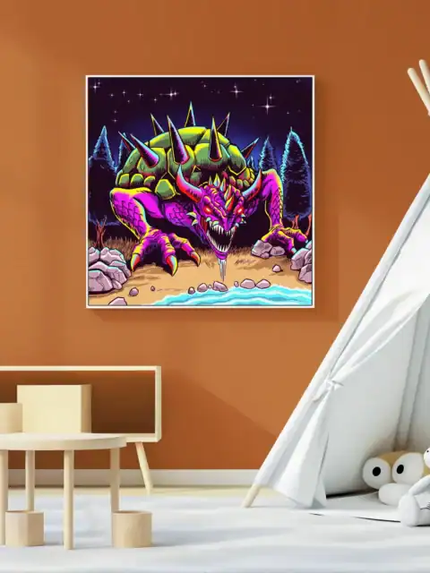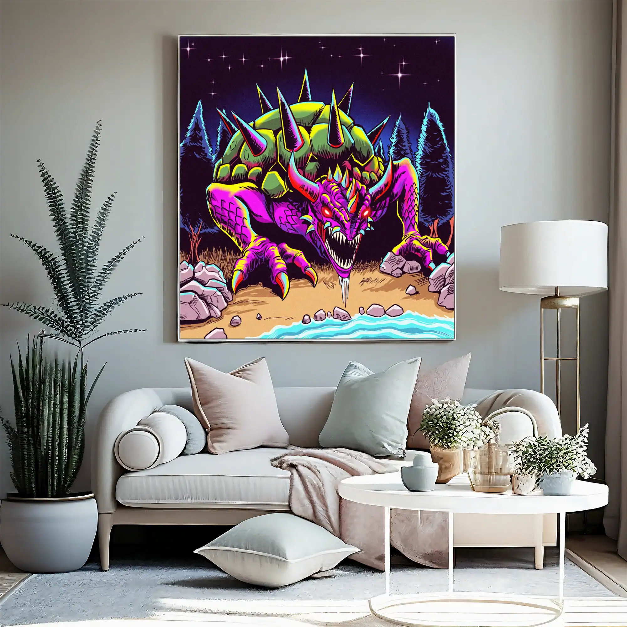 A spiked shell dragon crouches menacingly on sandy shores near turquoise water. Fabricio Vainer’s demonic turtle art trading card canvas print captures Ward TCG’s signature style. Notably, neon pink scales contrast against the deep purple starlit sky.