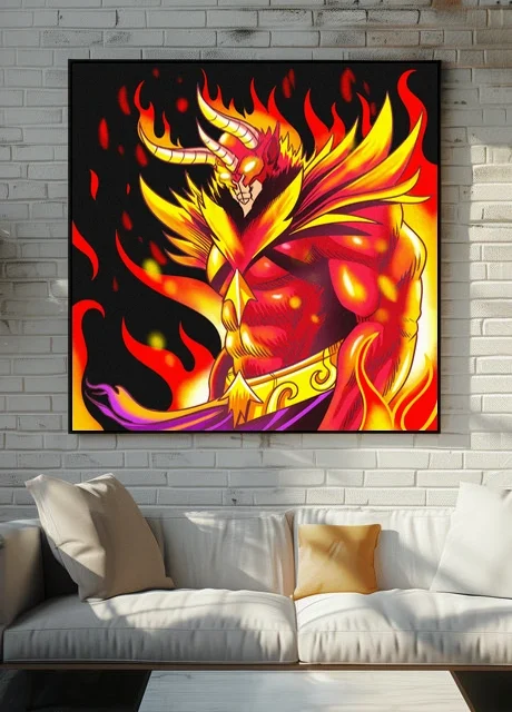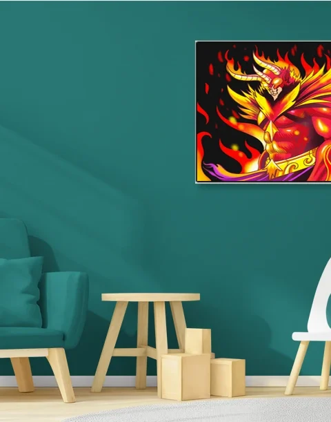 The infernal color scheme suits game rooms or fantasy-themed display walls where dramatic character art belongs. Additionally, the vertical composition works particularly well in narrow wall sections or collector shelving alcoves.