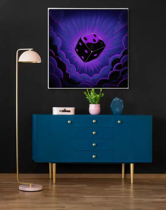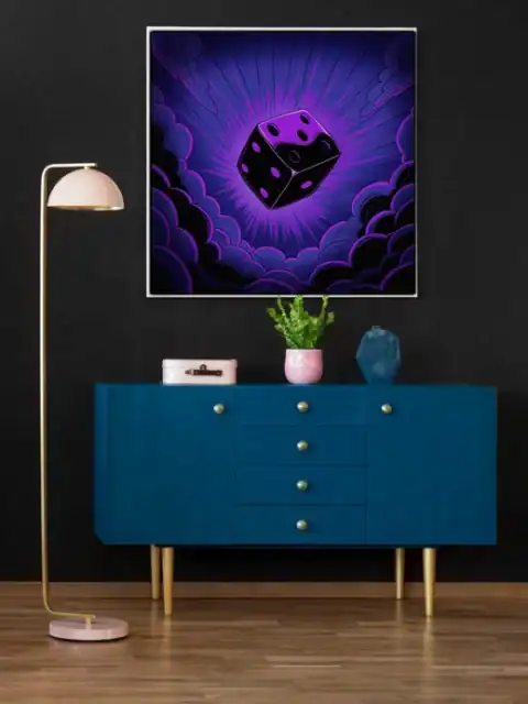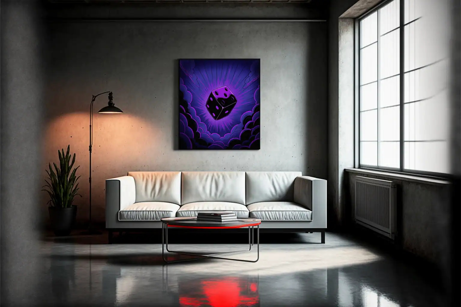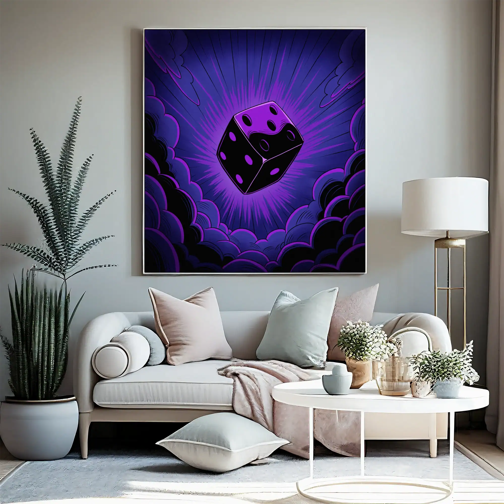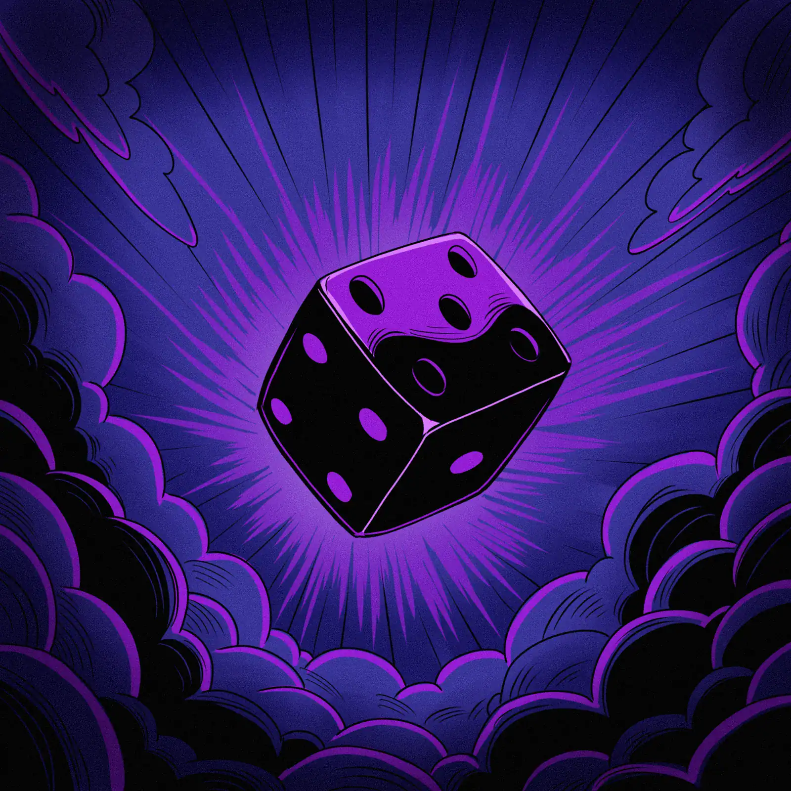 Indeed, stylized clouds frame the composition in deep purple gradients. The limited palette creates striking contrast between black outlines and vibrant purples. Moreover, the cel-shaded technique amplifies the die’s supernatural glow.
