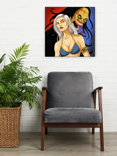 Display this in a game room where the pulp fantasy aesthetic complements TCG collections and comic book art. Additionally, the dramatic color split works well on walls needing a bold visual anchor.