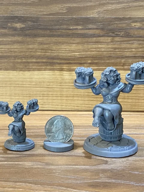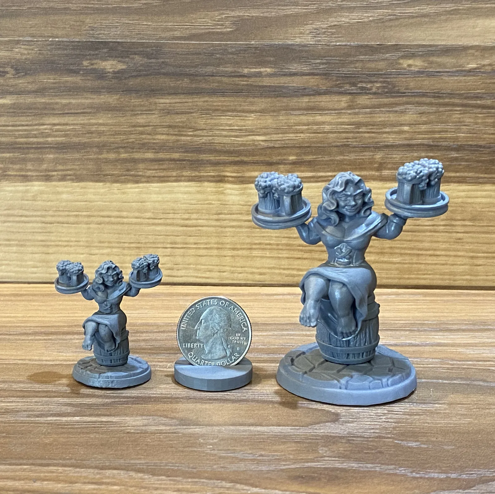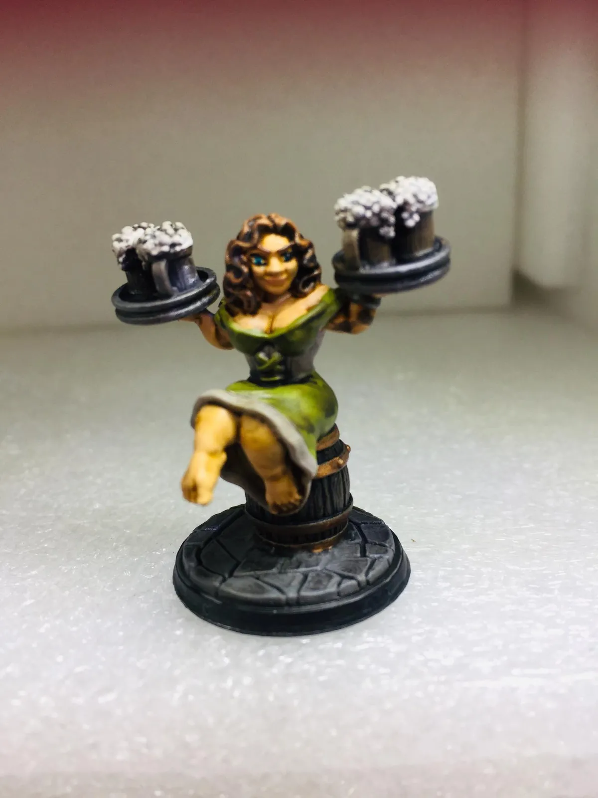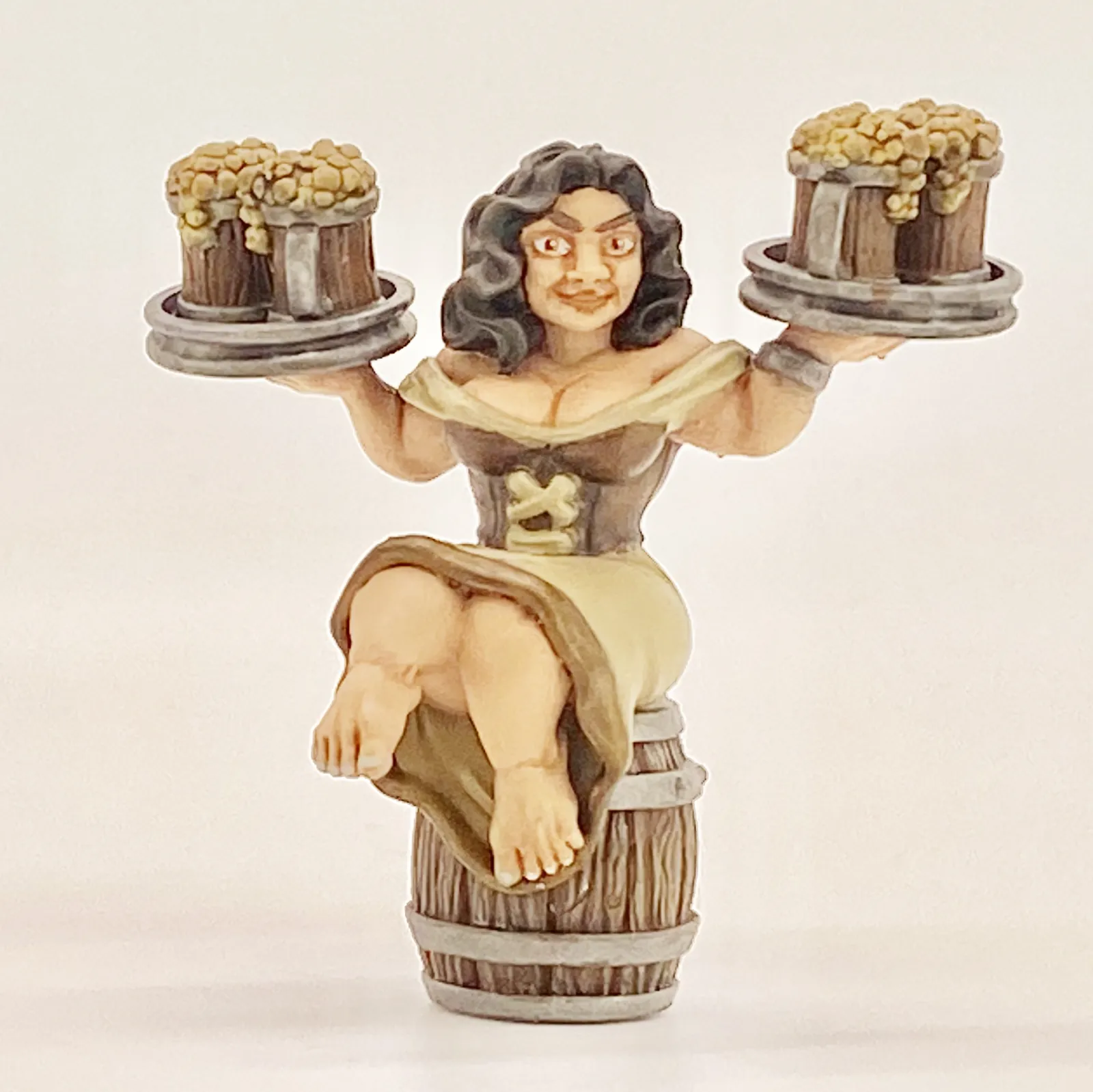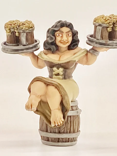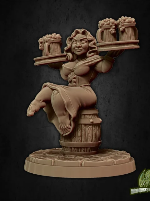 Additionally, the sculpt balances four overflowing steins across raised serving trays without spilling foam. Her voluminous curls cascade past bare shoulders in thick ringlets that frame expressive eyes. Moreover, the barrel seat shows wood grain texture against cobblestone base details.