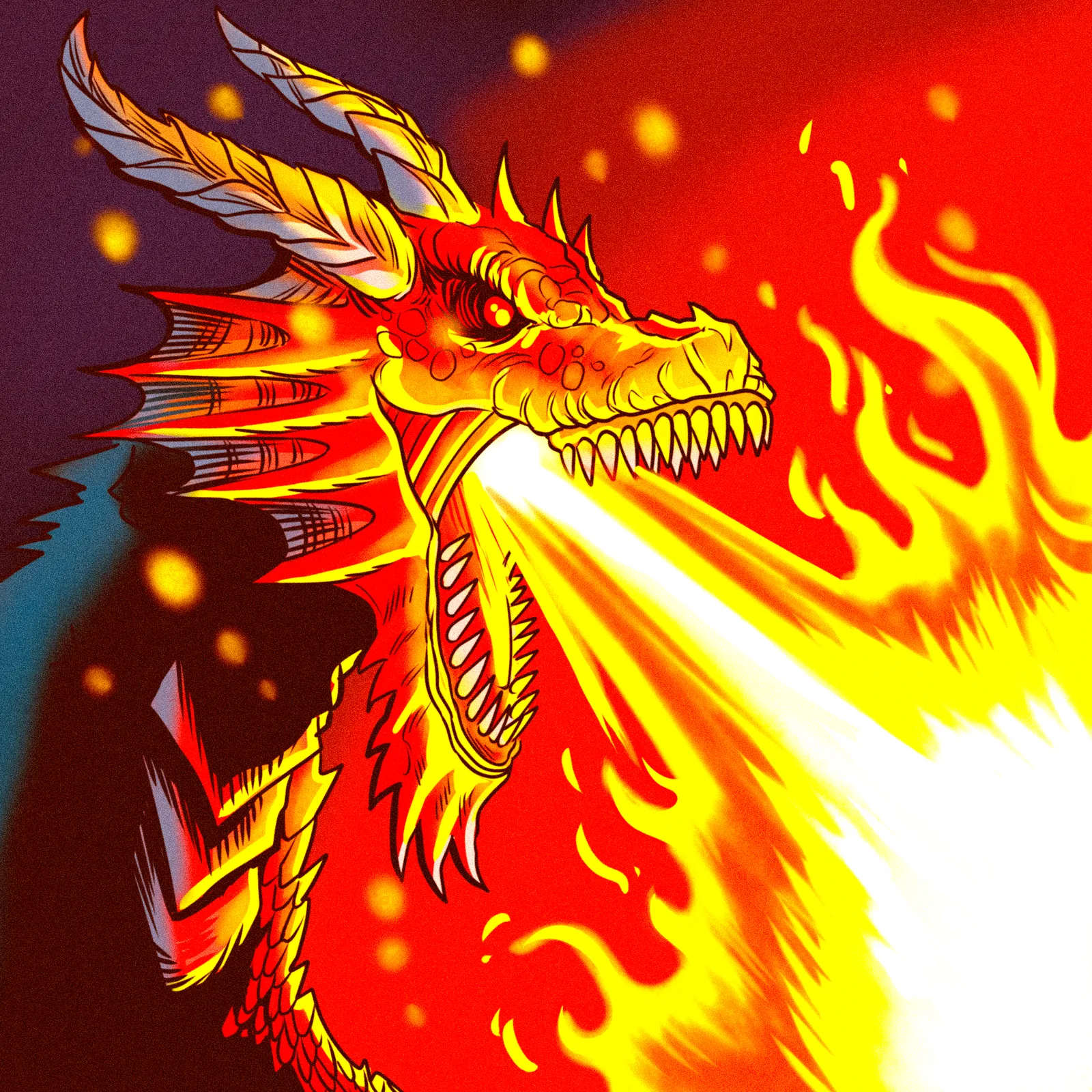 A fire-breathing dragon unleashes white-hot flame in pure profile. This dragon fire art trading card art canvas print captures Fabricio Vainer’s cel-shaded illustration at full scale. The segmented horns curve backward, notably ridged with golden highlights.