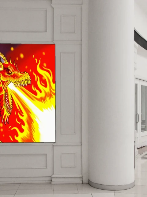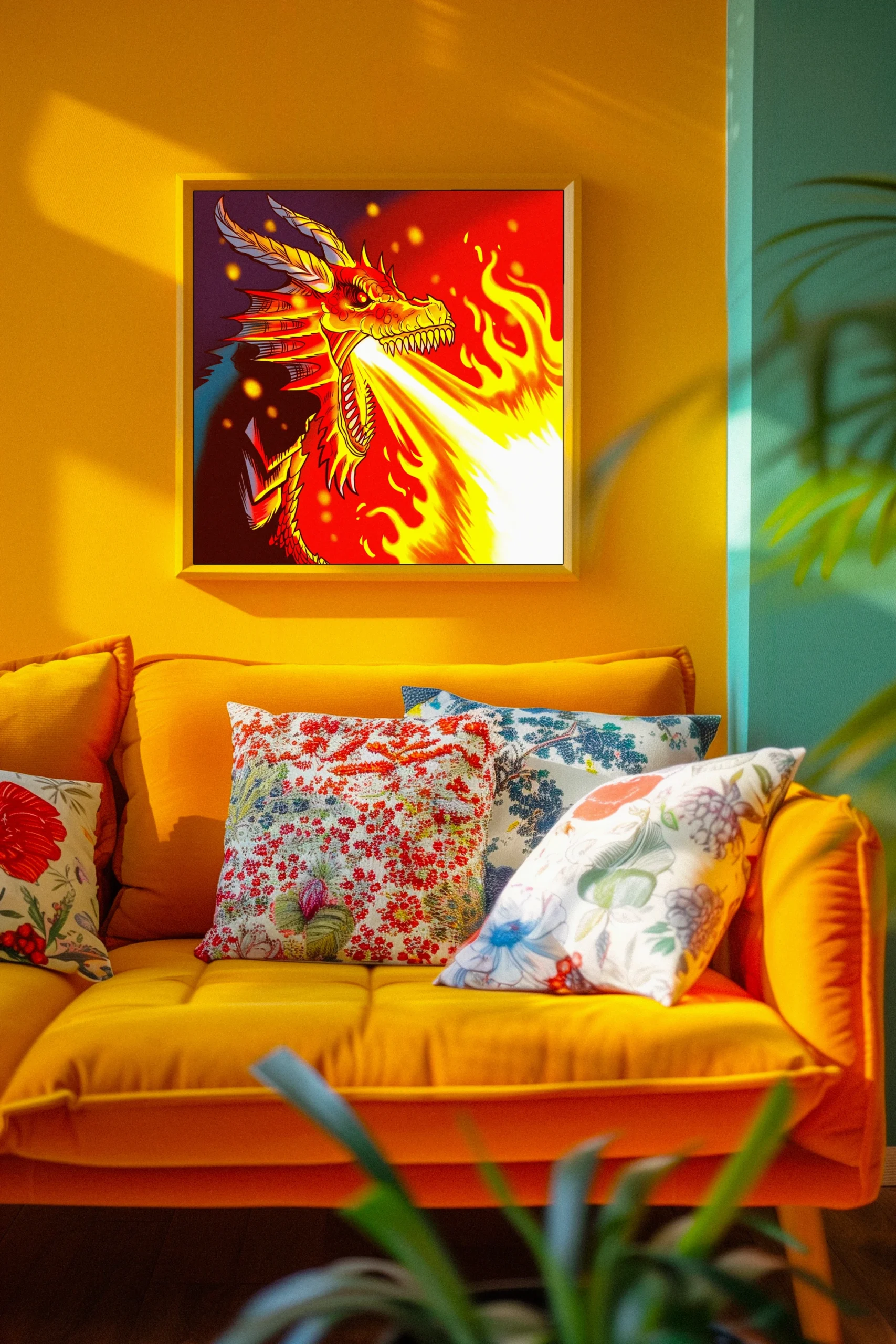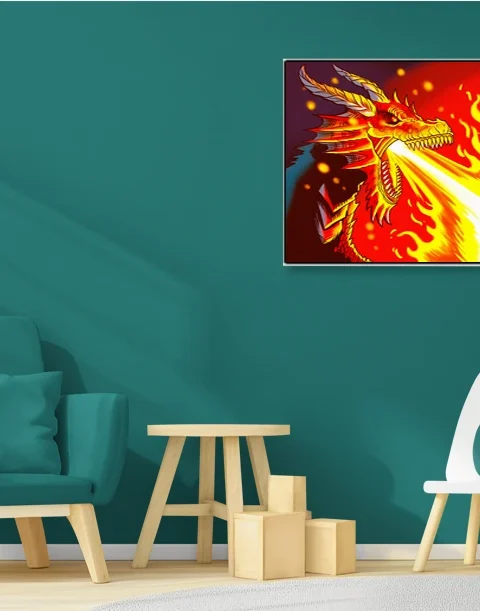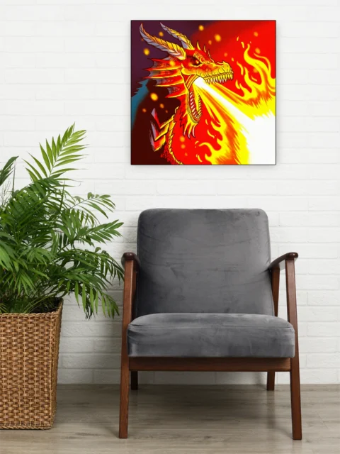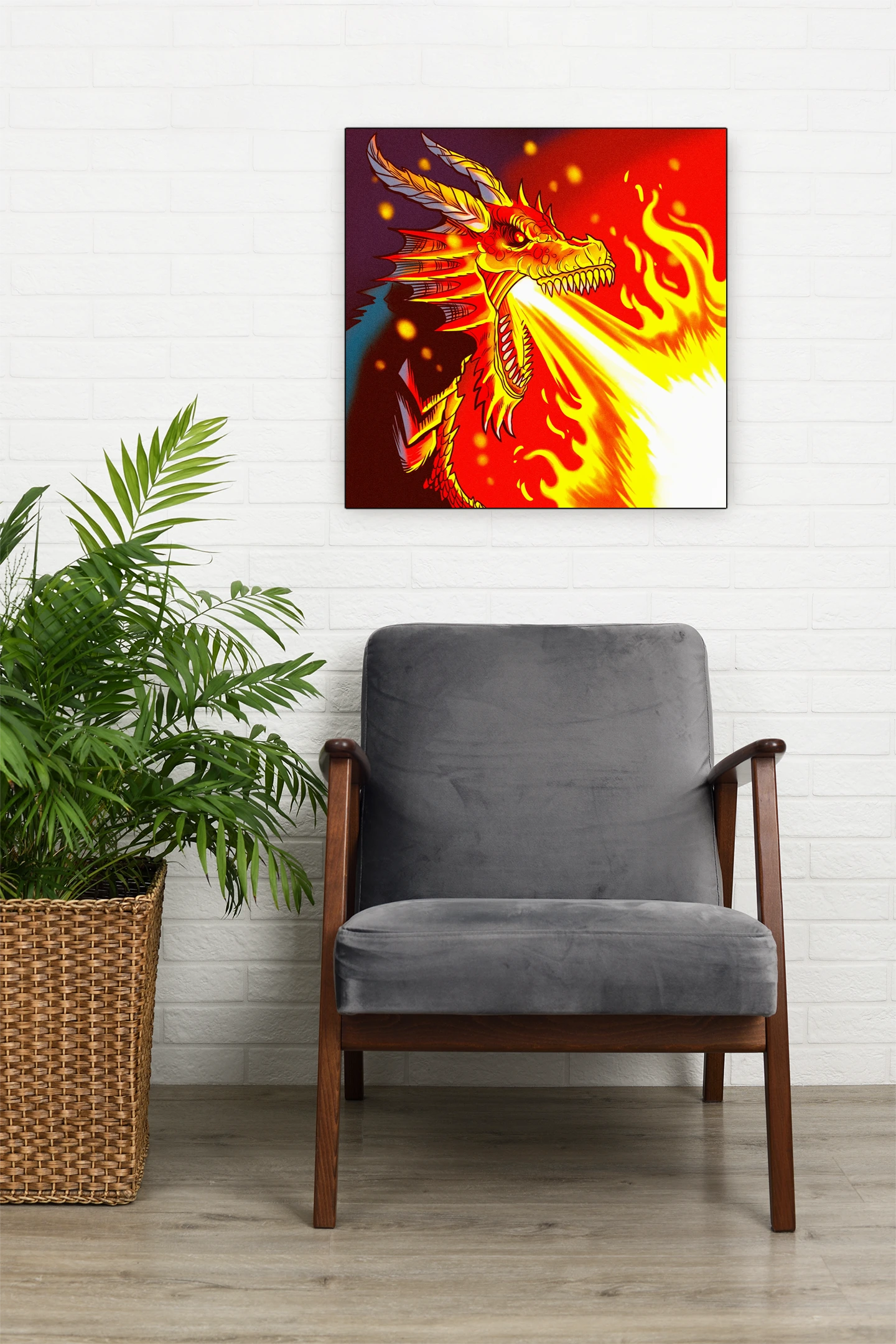 On the wall, the white-hot flame cone holds visual weight a smaller print cannot deliver. Ward TCG collectors and dragon art enthusiasts both recognize Vainer’s bold linework and high-contrast shading. This dragon fire art trading card art canvas print displays the full illustration without card borders.