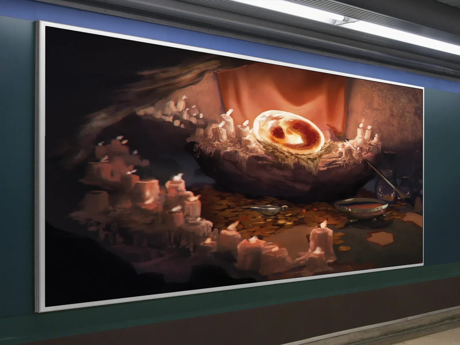 Finally, atmosphere defines the impact. Consequently, layered shadows, textured stone, and muted gold tones give the piece strong wall presence, rewarding closer viewing with environmental detail and narrative tension suited to lair-focused fantasy scenes.