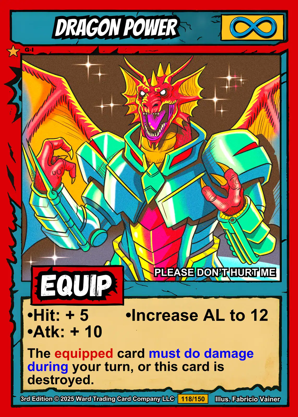 Beyond that, white sparkle effects dance across the dark brown background. The red border frames cyan header text and beige mechanics boxes. Meanwhile, heavy black outlines define every armored plate and wing membrane.