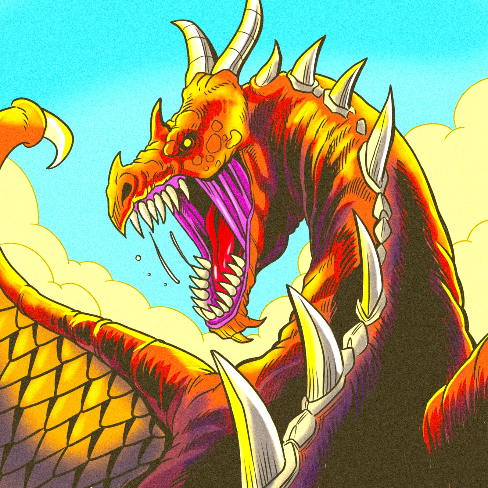 Additionally, the orange-gold scales contrast sharply against cyan sky and yellow-orange clouds. Heavy black ink outlines define every muscle, horn, and spine with deliberate cross-hatching. The composition crops tight on the creature’s head, moreover emphasizing its aggressive forward thrust.