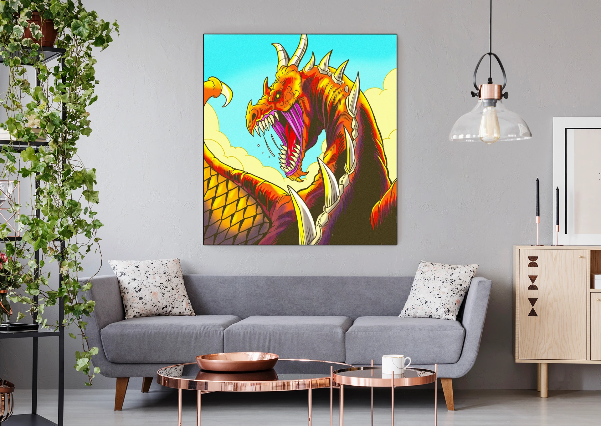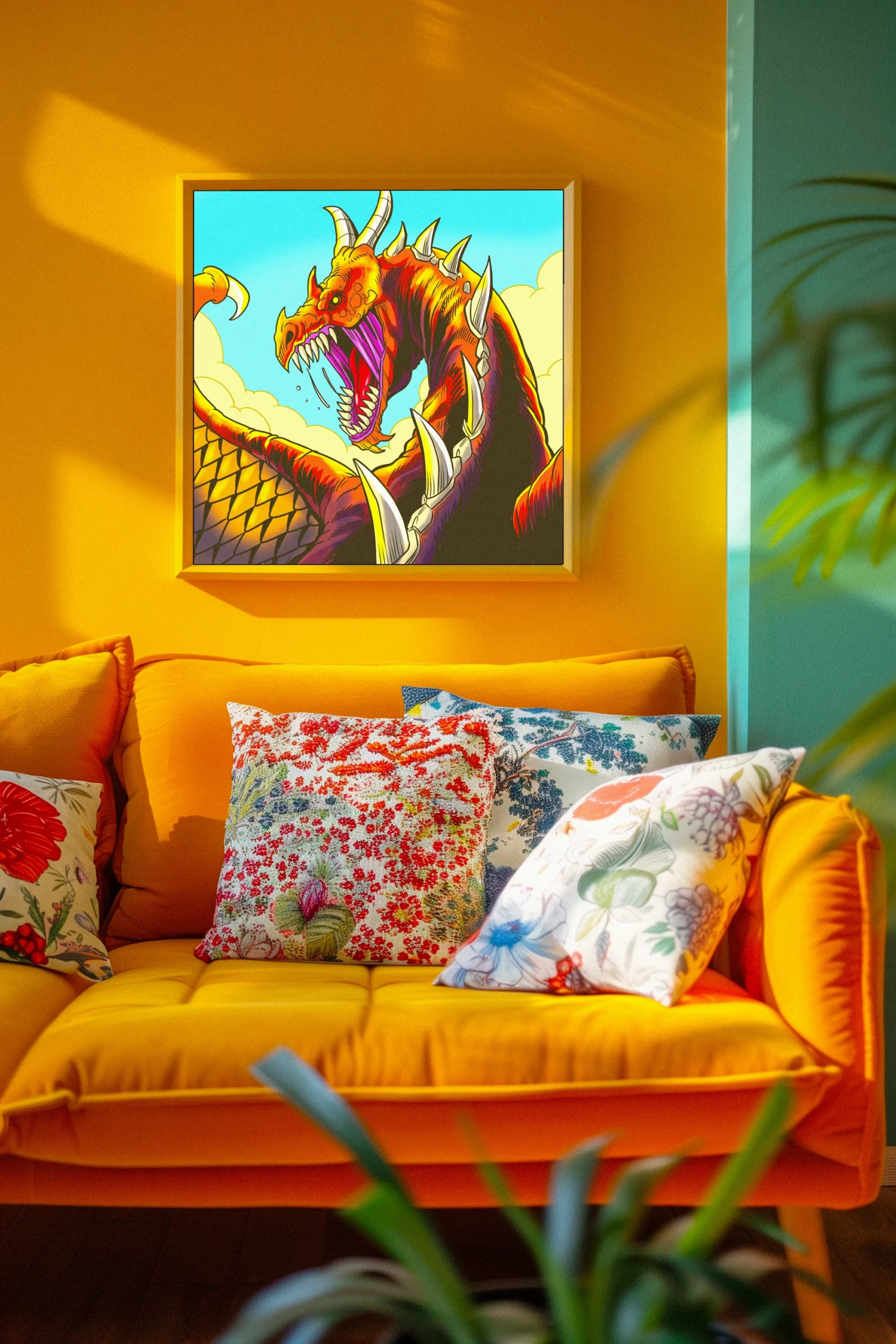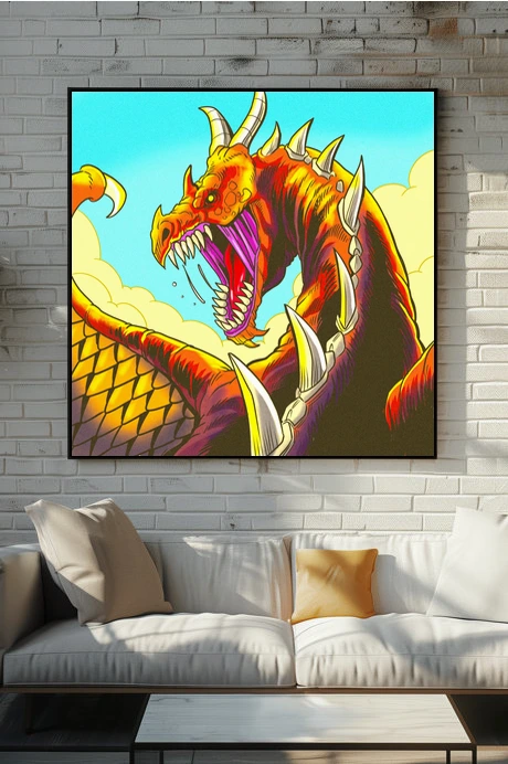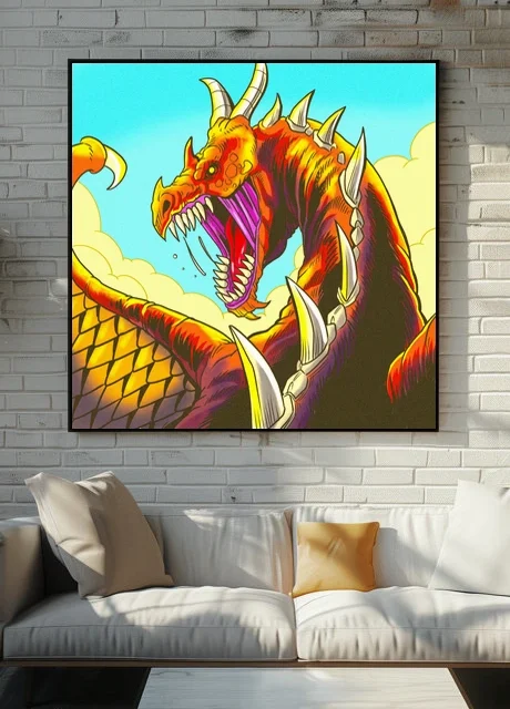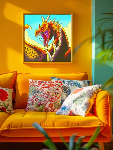This works in game rooms where bold creature art anchors the space. Additionally, it pairs well with other comic-style fantasy illustrations in collector displays.