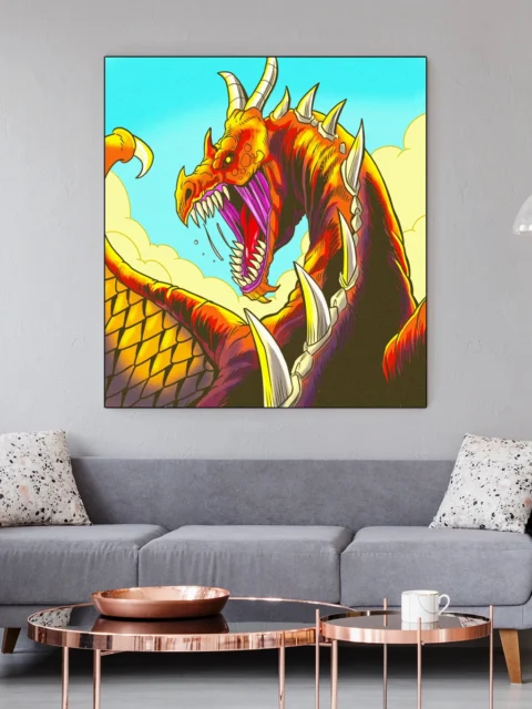 On the wall, the saturated palette holds intensity a small print cannot. This appeals to Ward TCG collectors and comic book creature art enthusiasts equally. The dragon rage art trading card art canvas print delivers Vainer’s linework at gallery scale.