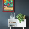 This piece anchors a game room wall where bold comic art belongs. Indeed, the high-contrast palette holds attention in spaces with competing visual elements.