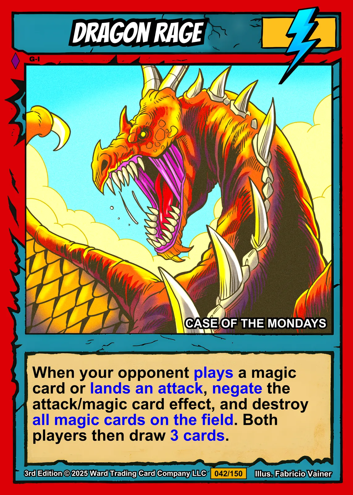 Additionally, the bright red border features jagged black accents framing the artwork. A yellow banner at top displays ‘DRAGON RAGE’ in stylized black text. The yellow lightning bolt symbol sits in the upper right corner.