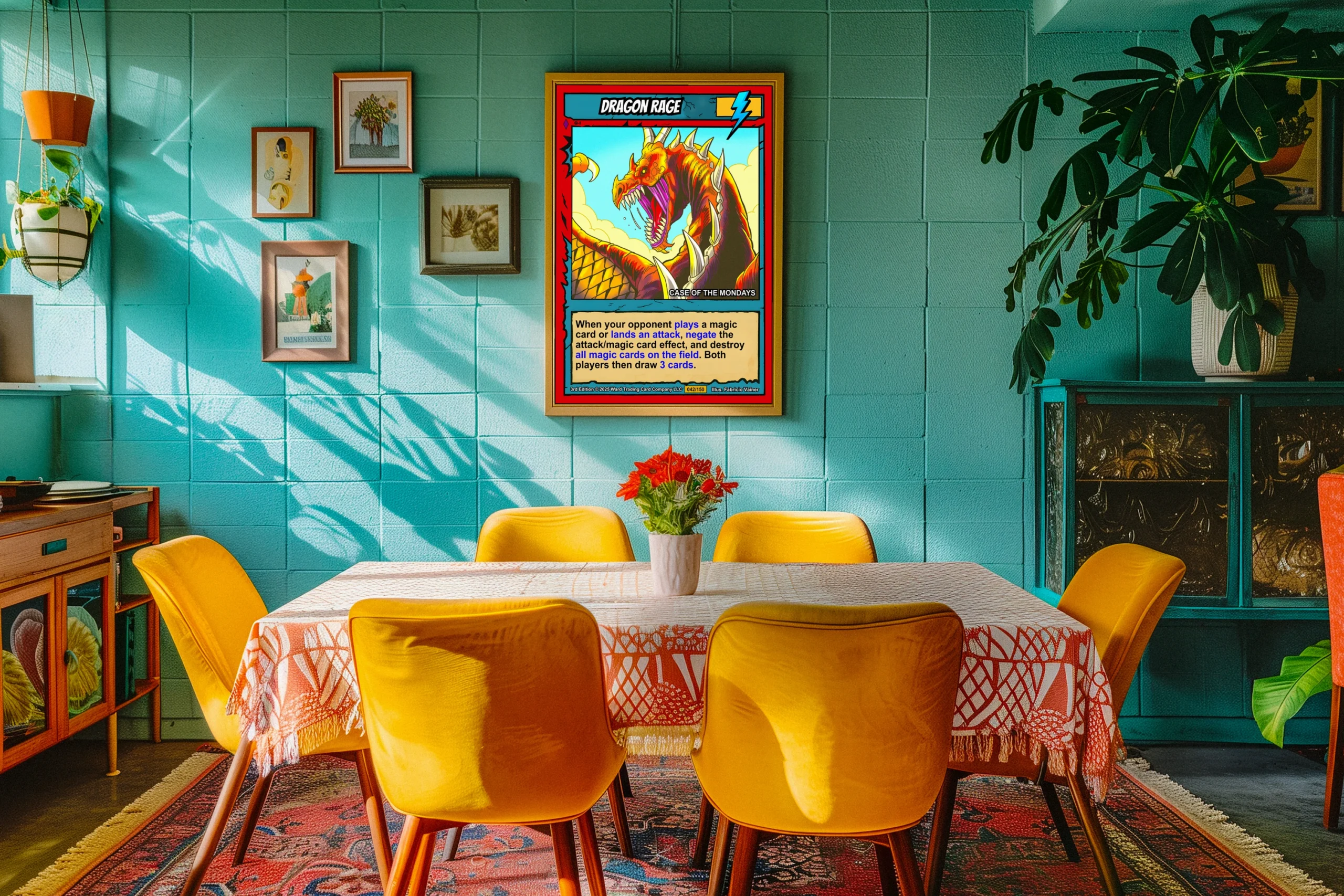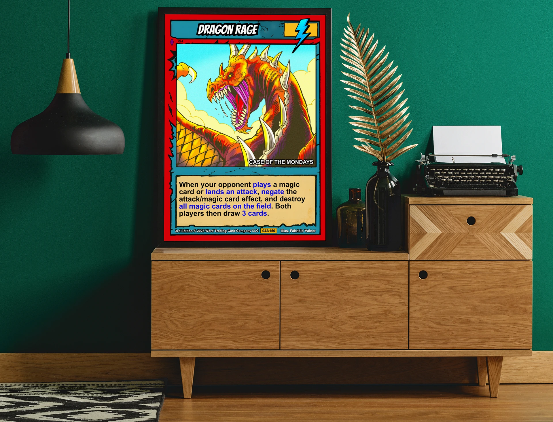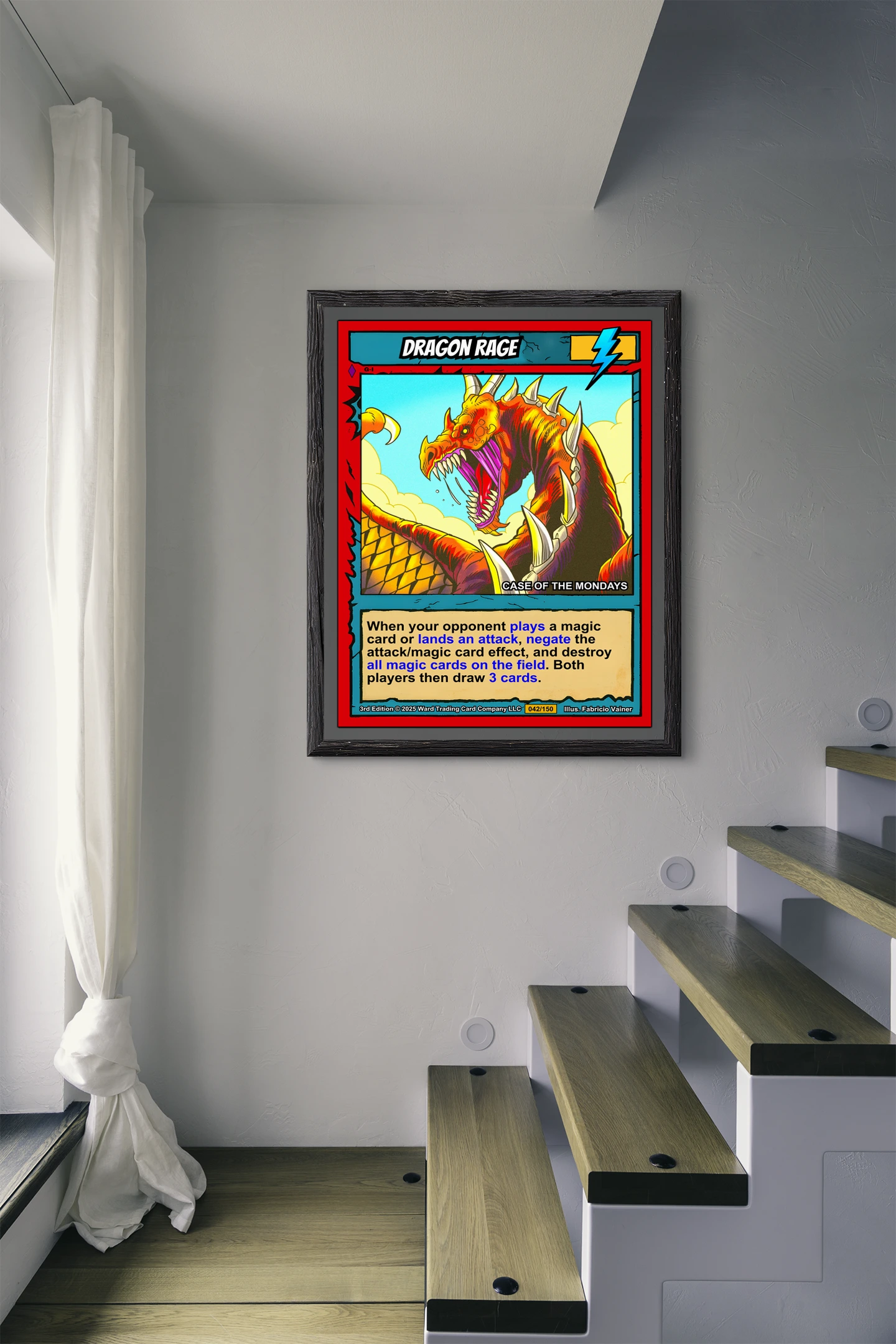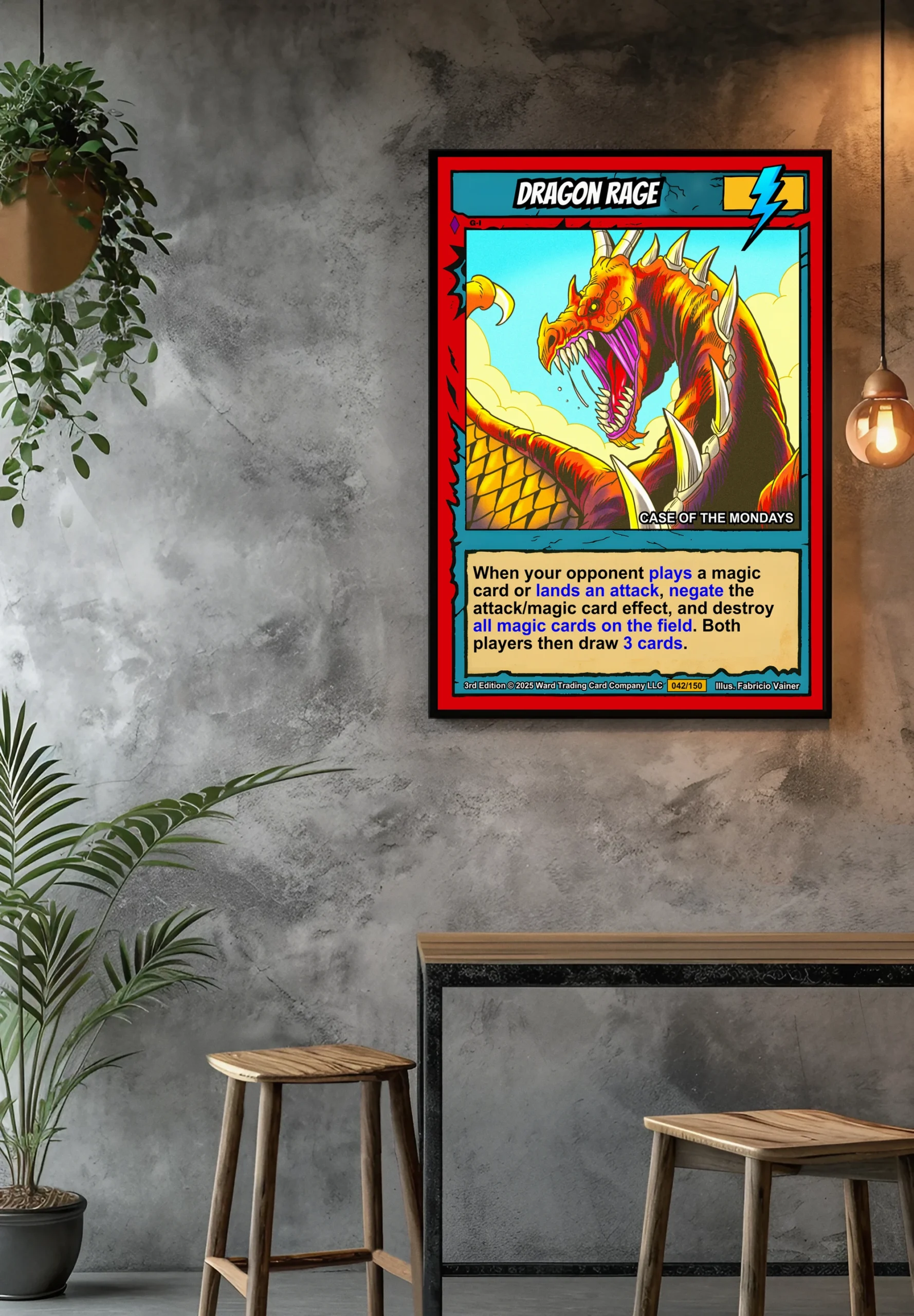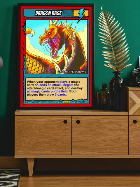 At room scale, the cel-shaded illustration reads as pure aggressive energy. TCG collectors recognize the 3rd Edition card number 042/150 from across the room. This dragon rage trading card canvas print delivers that iconic Ward TCG aesthetic collectors want on the wall.