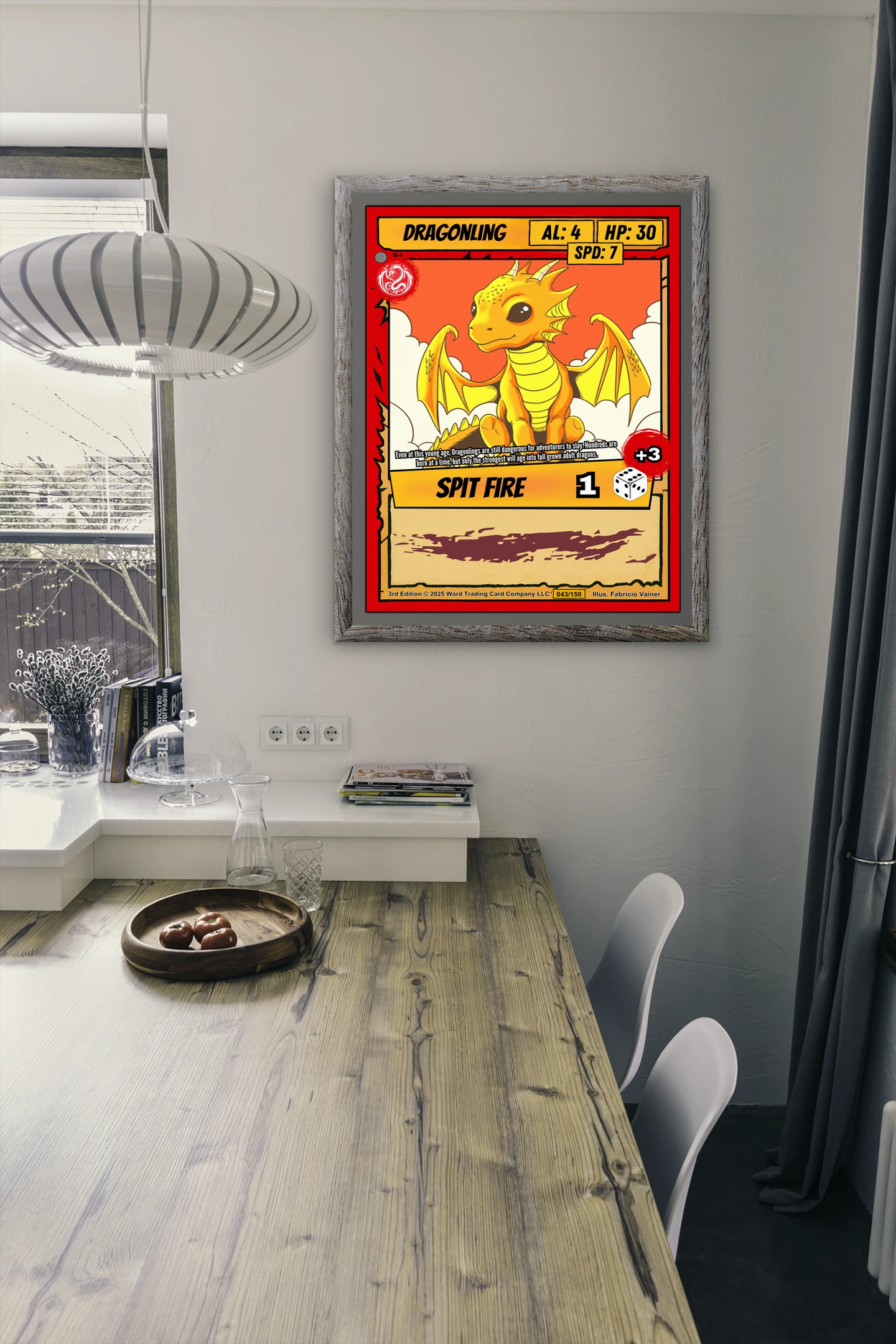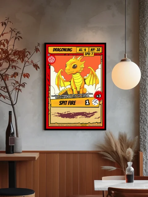 Game rooms gain authentic trading card atmosphere when framed above gaming tables. Moreover, the playful dragon energy suits campaign planning areas perfectly.
