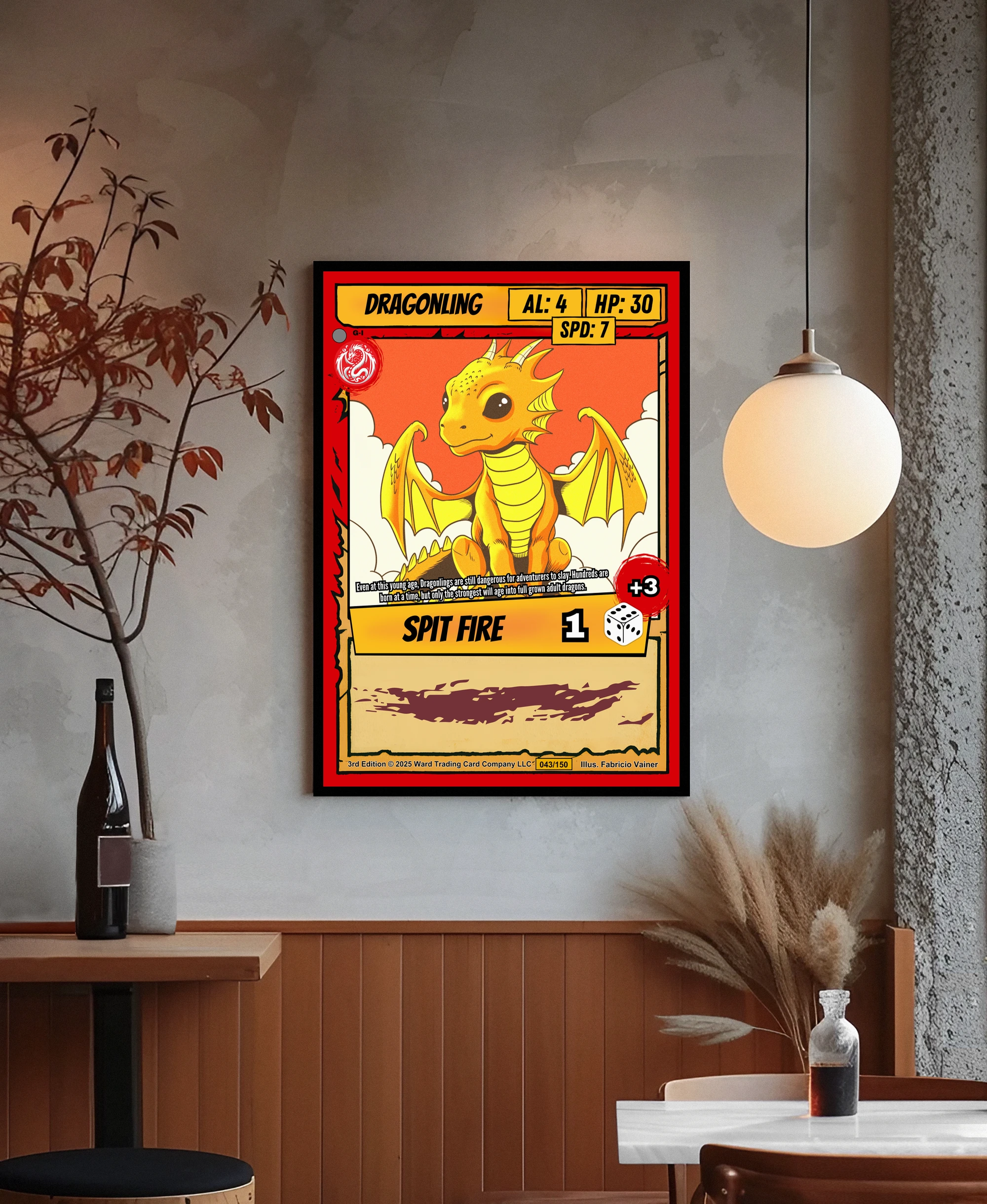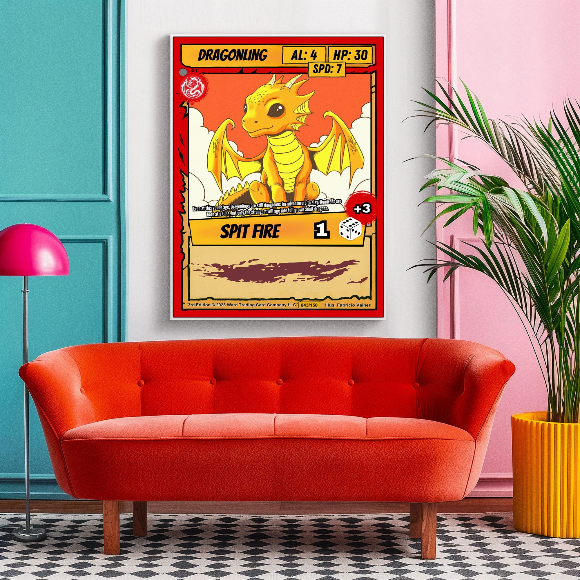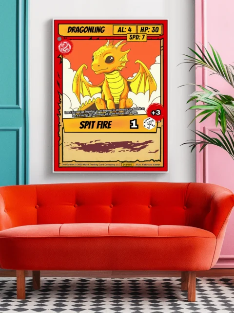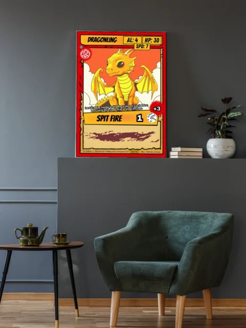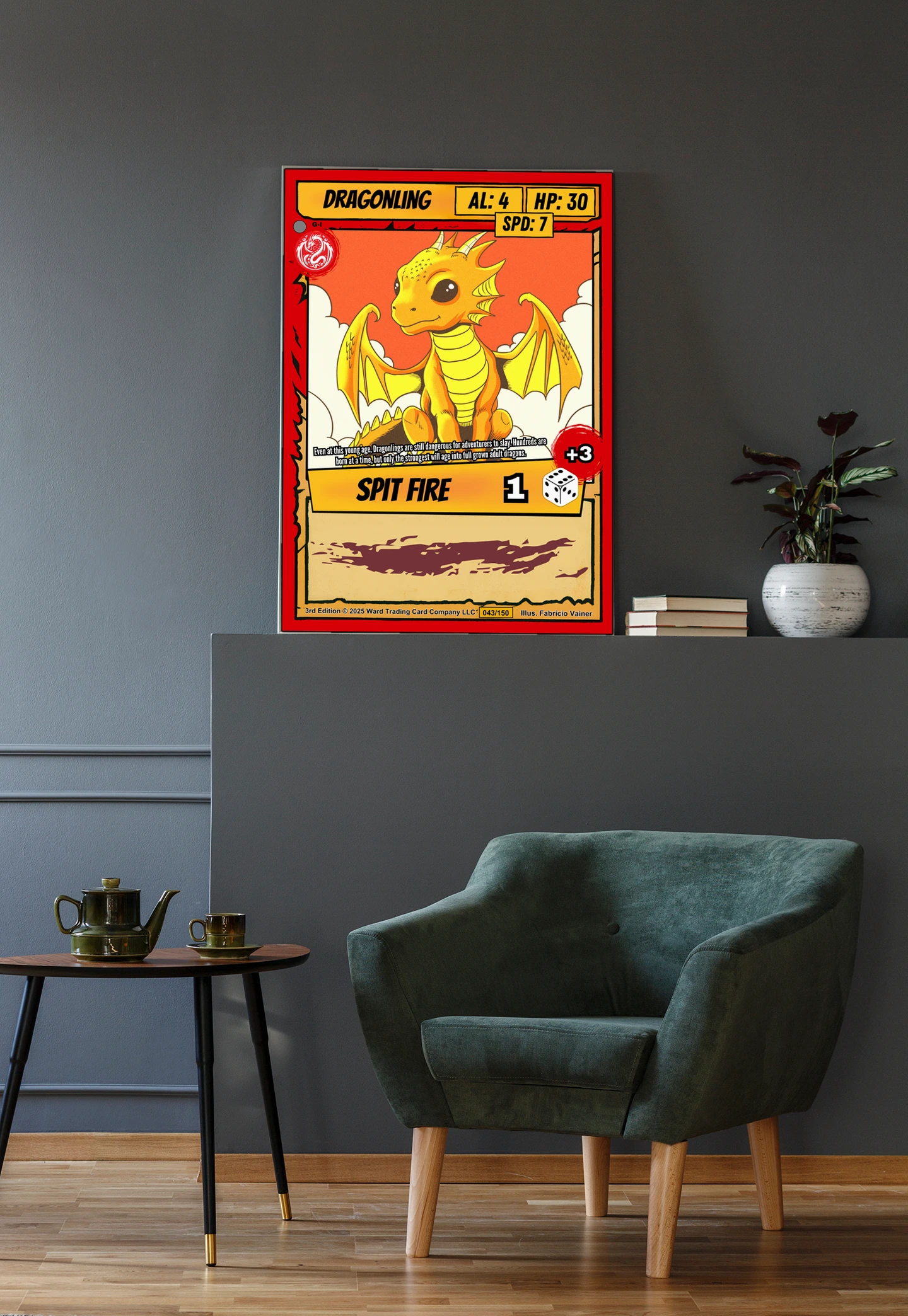Those oversized brown eyes reveal the illustrator’s comic-book character design mastery. TCG collectors recognize quality cel-shading when they see it displayed properly. Particularly, this dragonling trading card canvas print delivers that nostalgic pack-opening excitement.