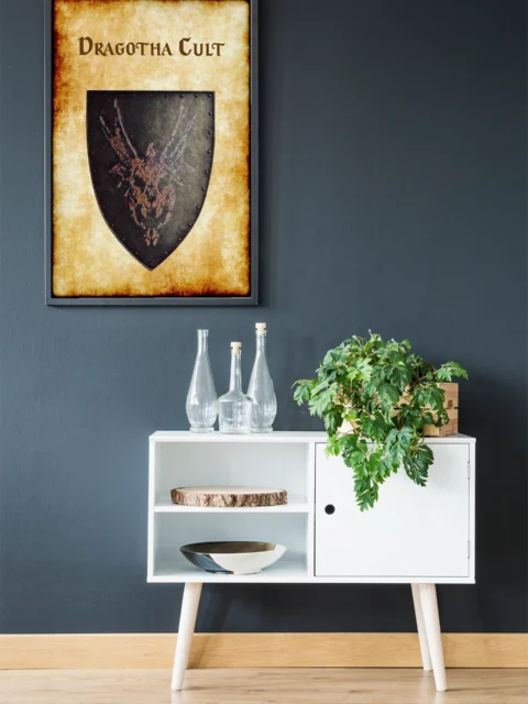 A skeletal dragon spreads corroded wings across a triangular black shield. This dragotha cult aged Greyhawk heraldry canvas print captures the undead wyrm’s menace. Notably, mottled red and orange bones emerge from weathered metal edges.