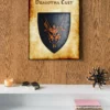 Home office walls benefit from heraldry that speaks to strategic thinking. The ominous symbolism particularly suits creative workspaces focused on campaign development.