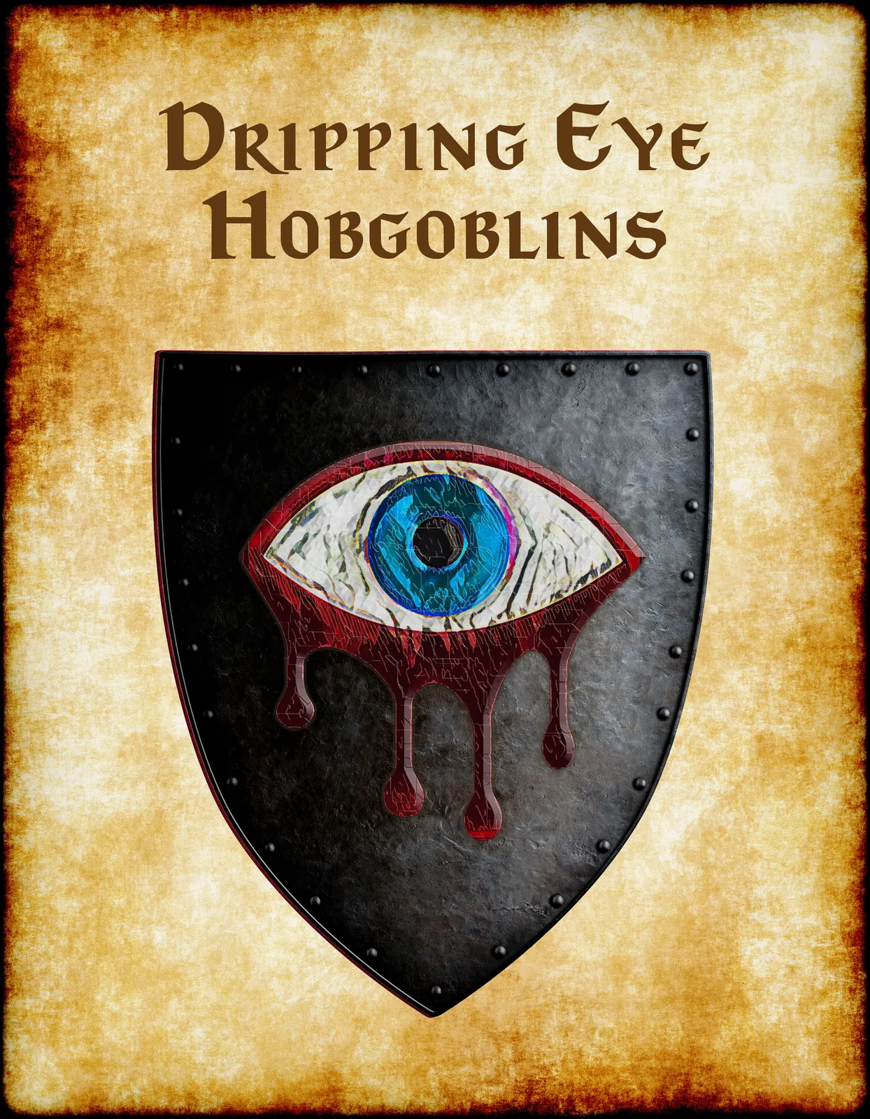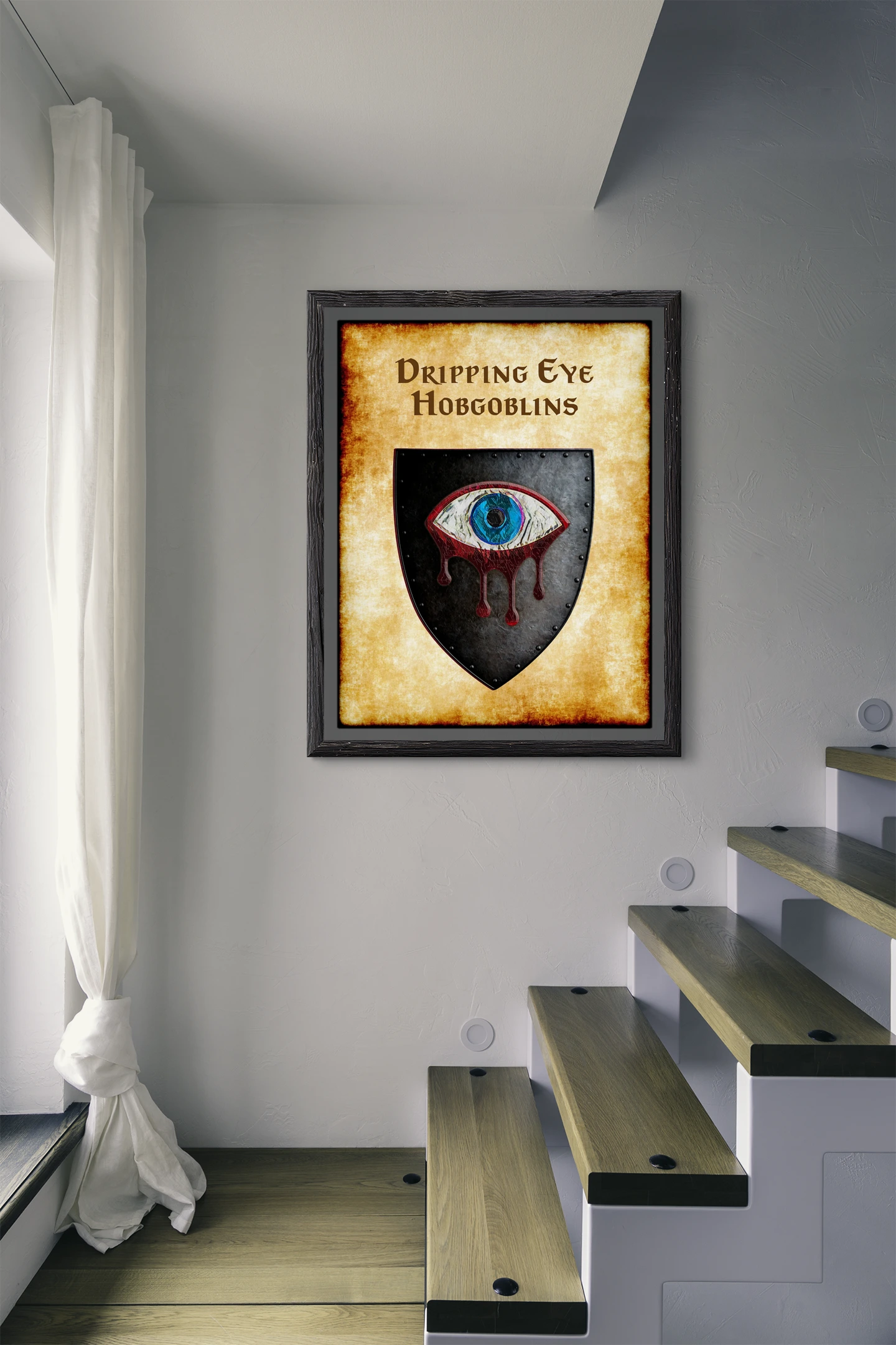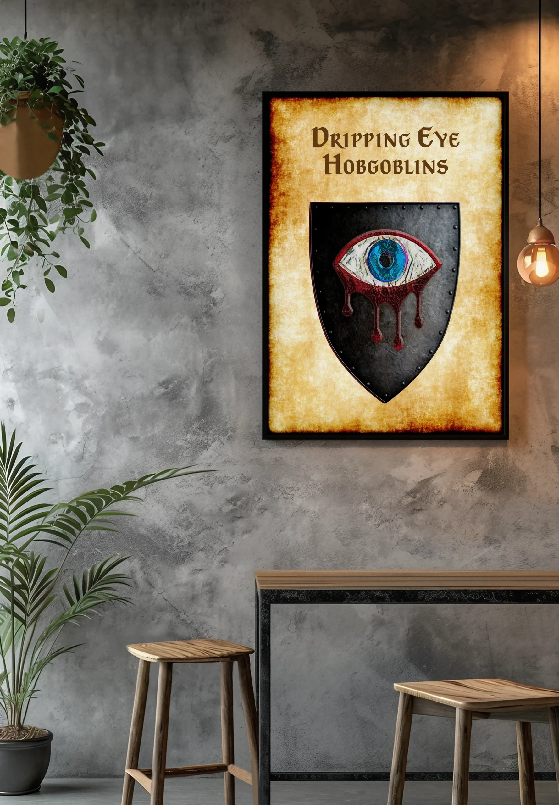 A grotesque eye weeps blood across black heraldic steel. This dripping eye hobgoblins Greyhawk heraldry canvas print captures martial brutality. Notably, crimson streams trace deliberate paths down the shield’s dark surface.