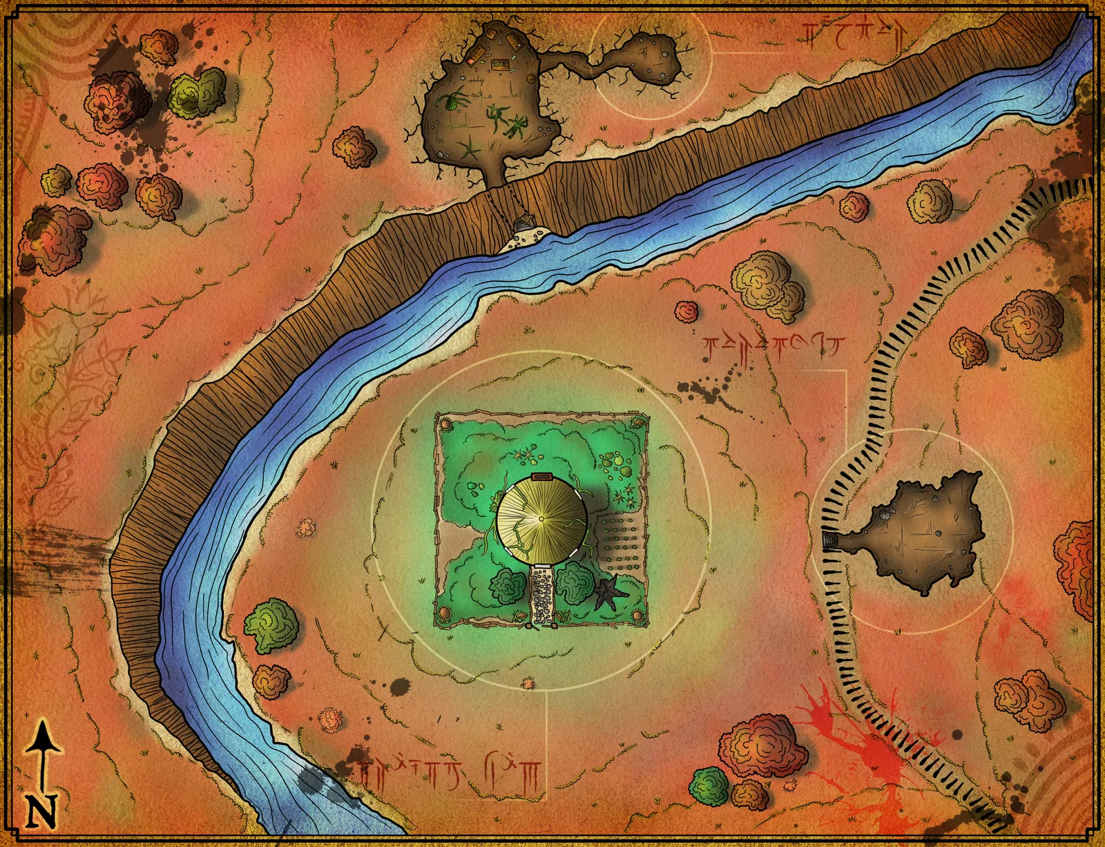 A golden domed hut sits within concentric earthen rings at the center of a desert oasis. This druid s hut fantasy battle map canvas print shows a river cutting diagonally through rust-colored terrain. Scattered trees bloom in autumnal reds, oranges, and yellows across the sandy expanse.