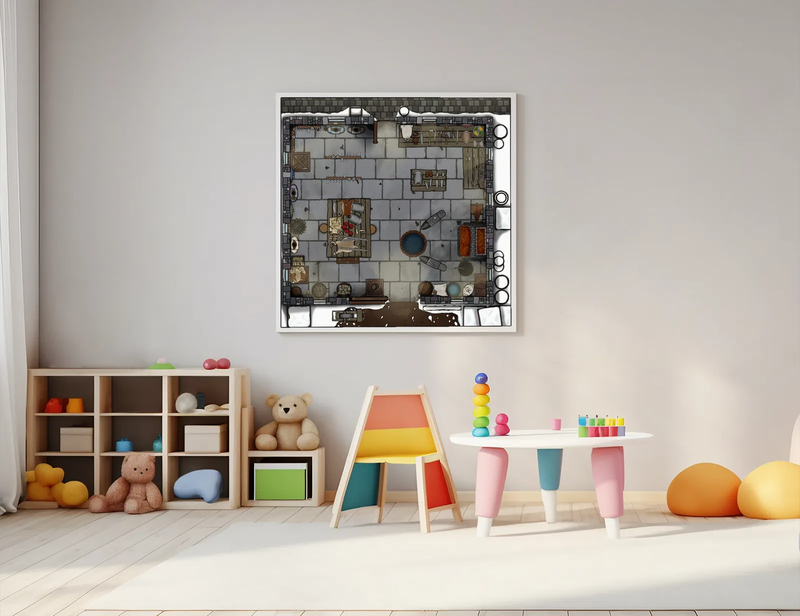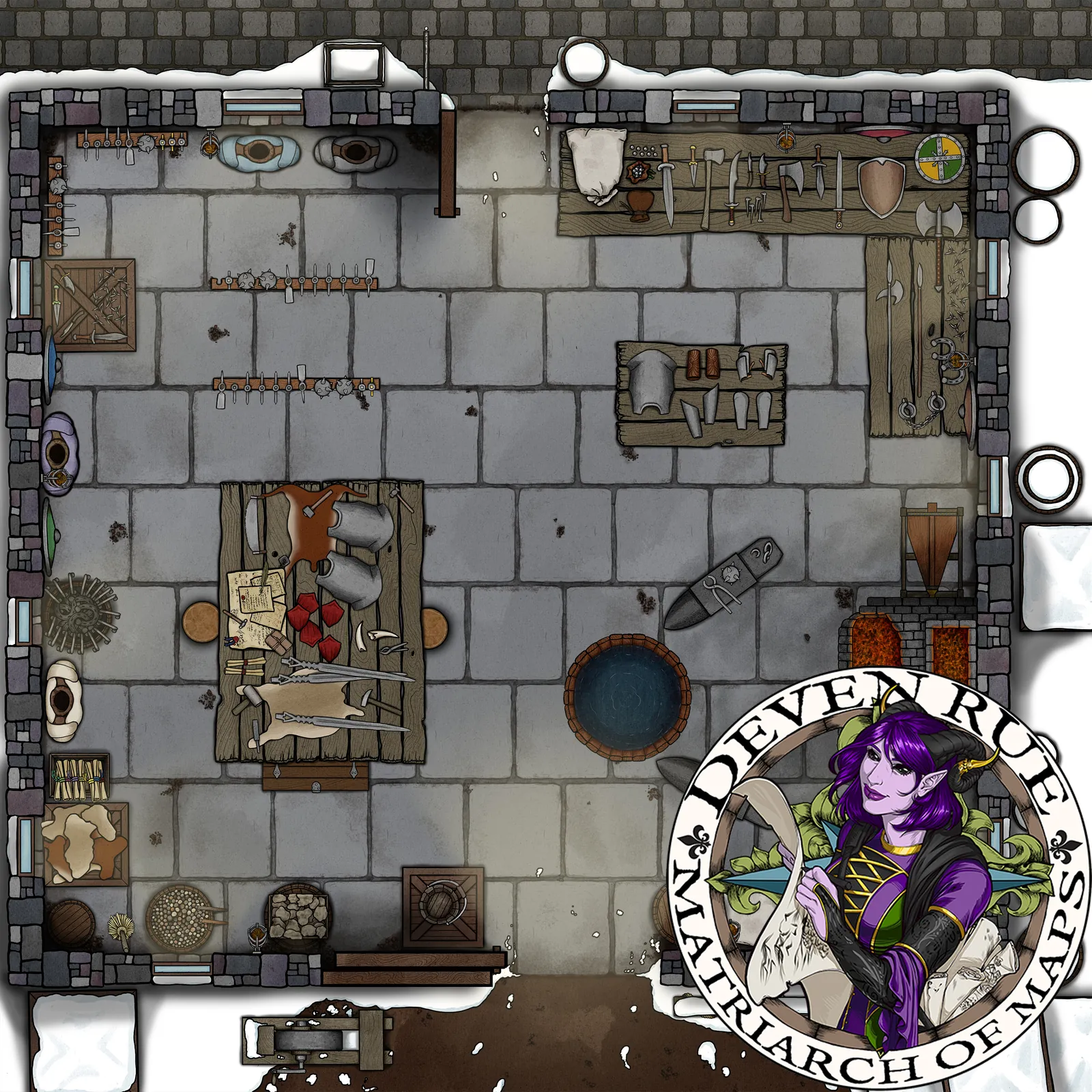 Dueling Anvils Map Winter Day Canvas Print from Deven Rue shows a forge interior quieted by cold light and drifting snow, where worktables and tools sit in patient order. This artwork beautifully captures a Dueling Anvils Winter Day Forge Scene Illustration. Moreover, the wintry setting suggests resilience and preparation, as if the forge remains active despite harsh conditions. The implied threat is environmental, shaped by endurance rather than haste.