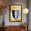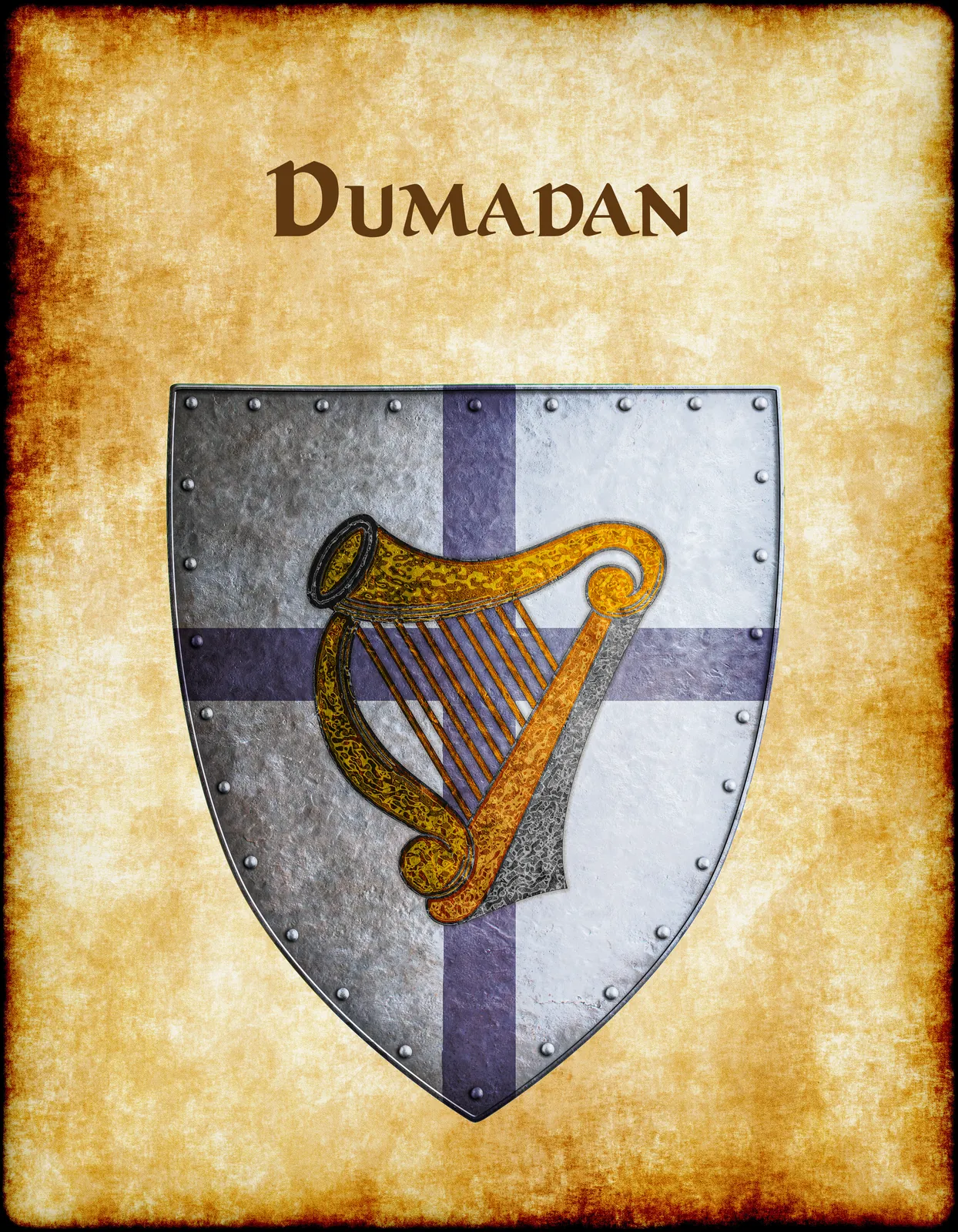 A quarterly shield displays alternating silver and purple fields beneath a golden harp. This dumadan Greyhawk heraldry canvas print captures the bardic realm’s musical heritage. Notably, antiqued gold texturing gives the central harp authentic medieval character.