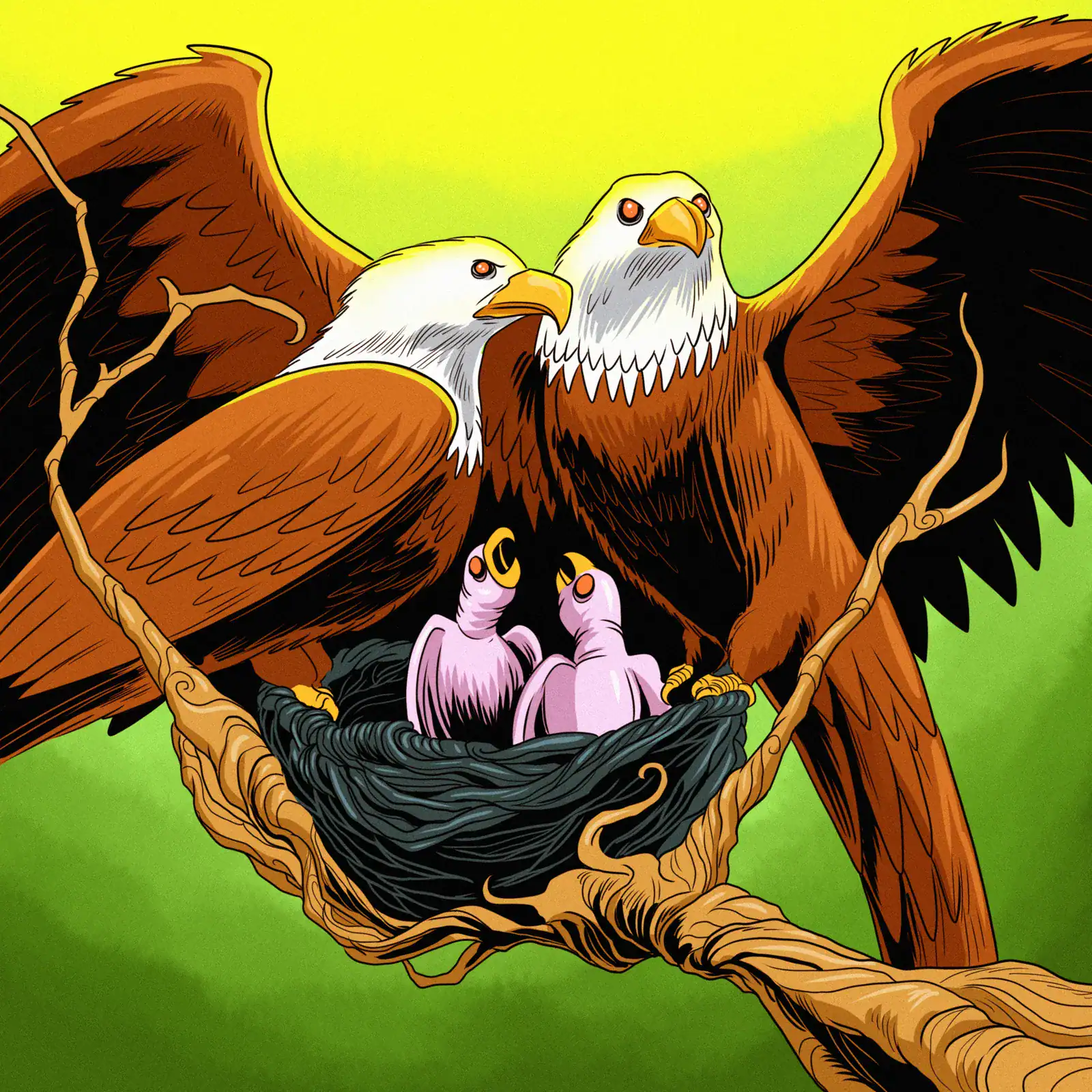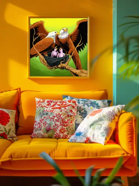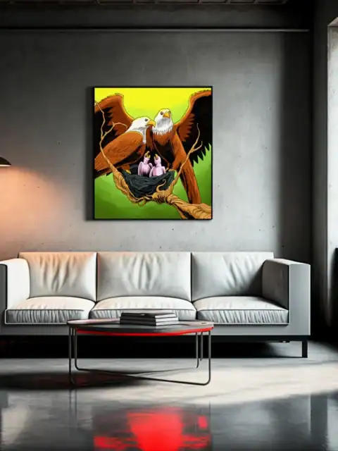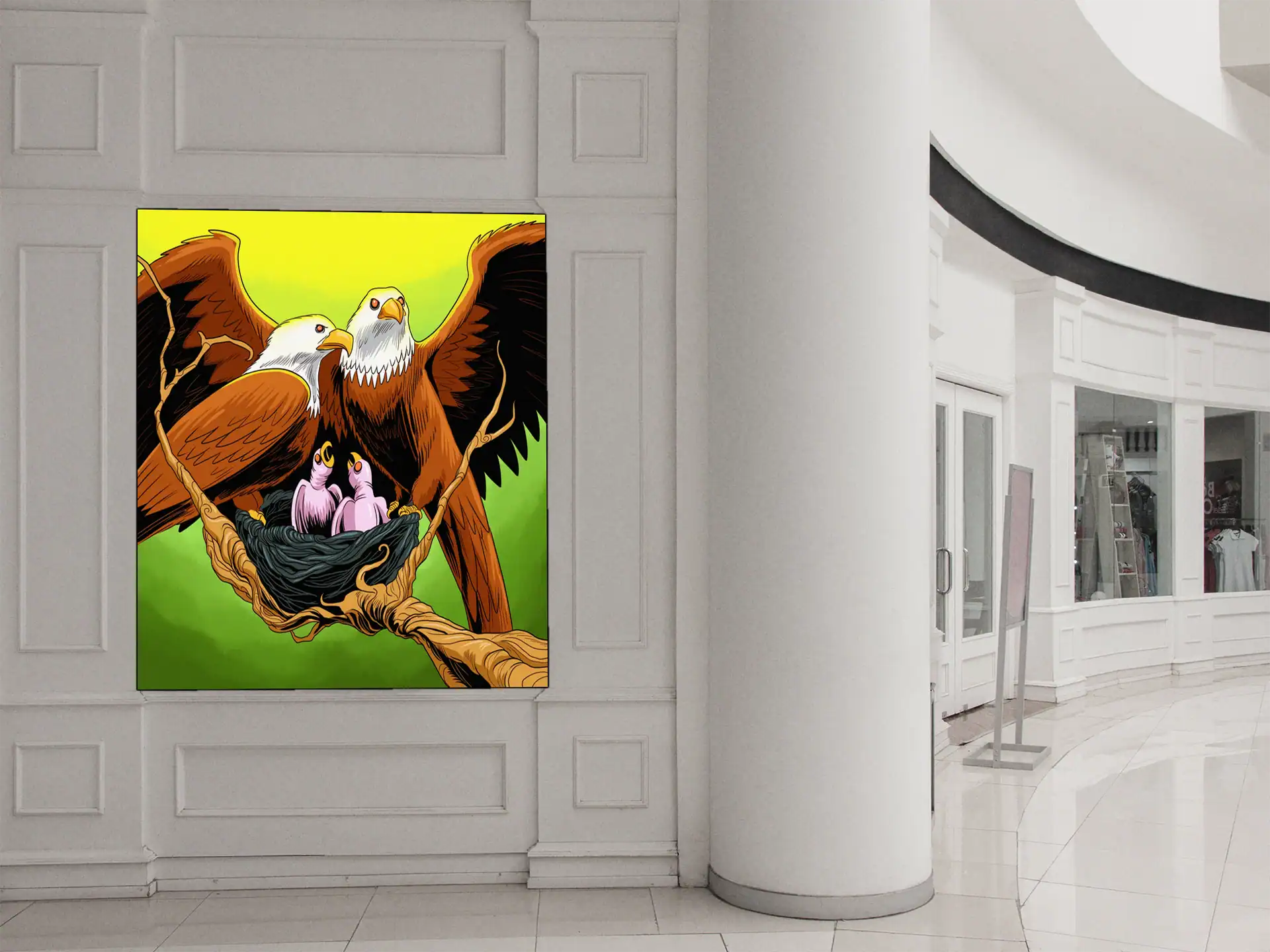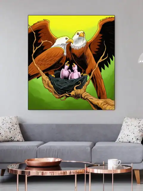 Two adult eagles spread massive wings over their nest of pink eaglets. This eagle family art trading card canvas print showcases Fabricio Vainer’s bold 1990s comic illustration style. Notably, the white-headed parents display fierce orange eyes and protective intensity.