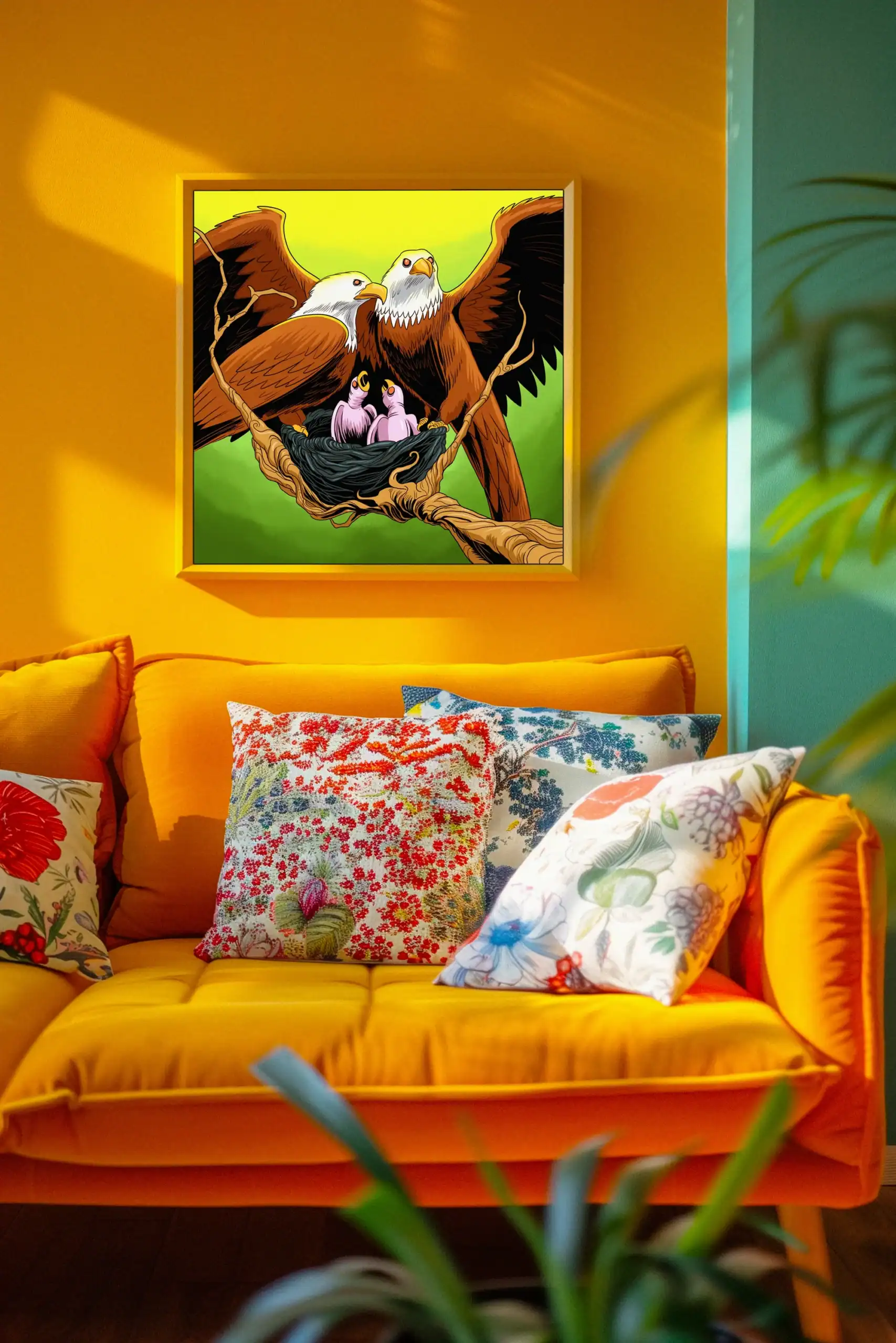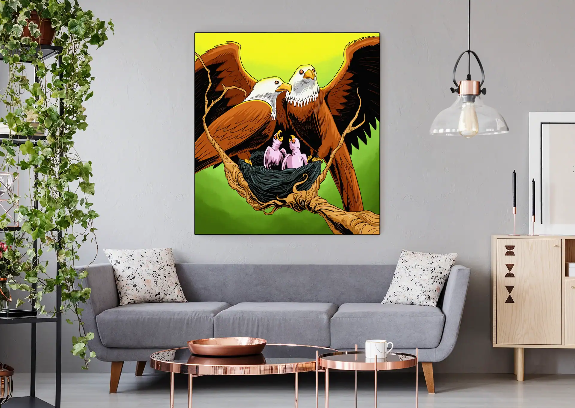 Protective family bonds rendered in classic comic book style separate this from typical wildlife art. TCG collectors and fantasy enthusiasts value artwork that captures both nature and narrative drama. Particularly, this eagle family art trading card canvas print bridges natural beauty with gaming nostalgia.