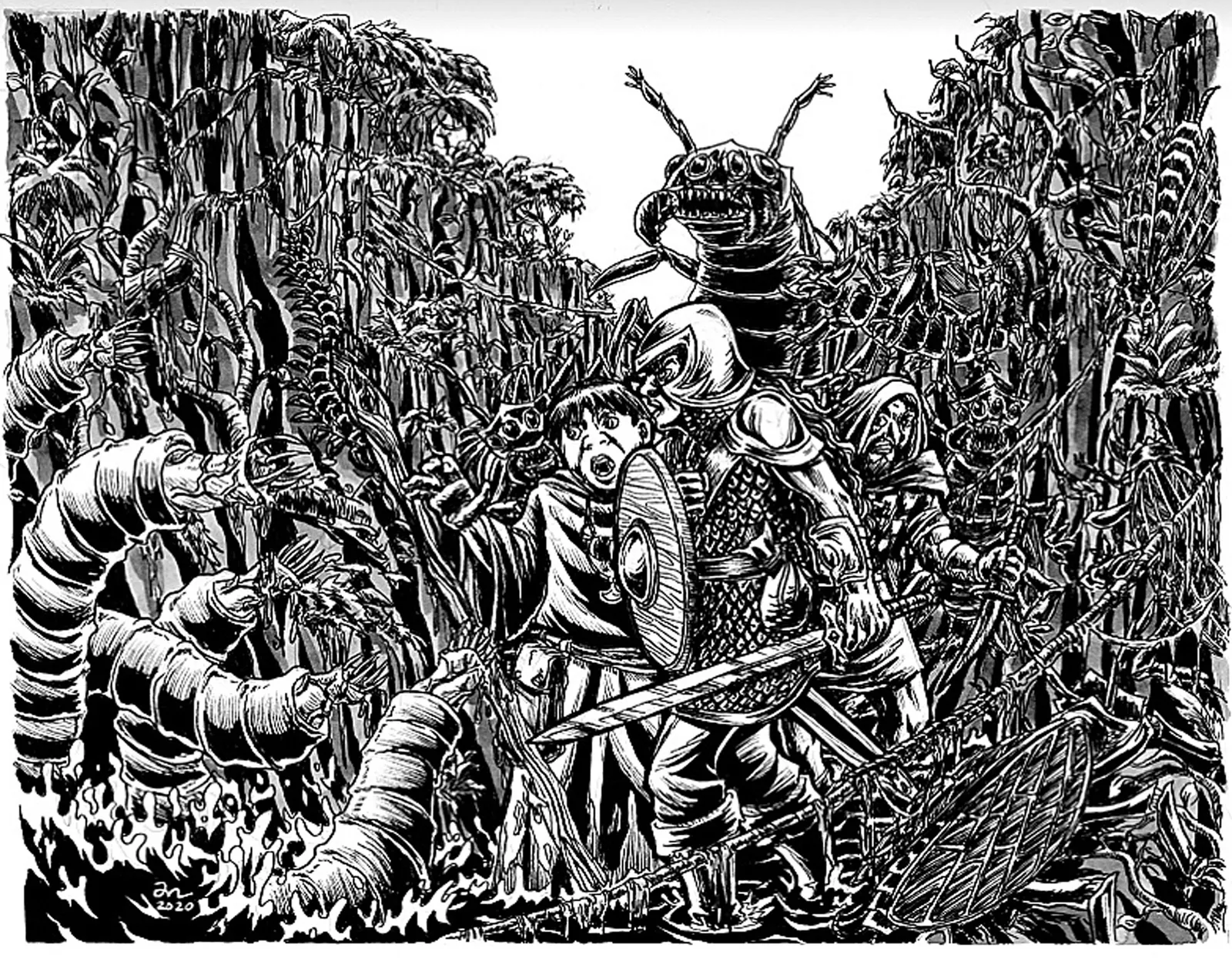 Additionally, the composition compresses figures, weapons, and monsters into a tight collision of bodies. This drives frantic motion across the scene. However, layered depth and intersecting lines keep the chaos readable. They guide the eye through panic, resistance, and failing defenses.