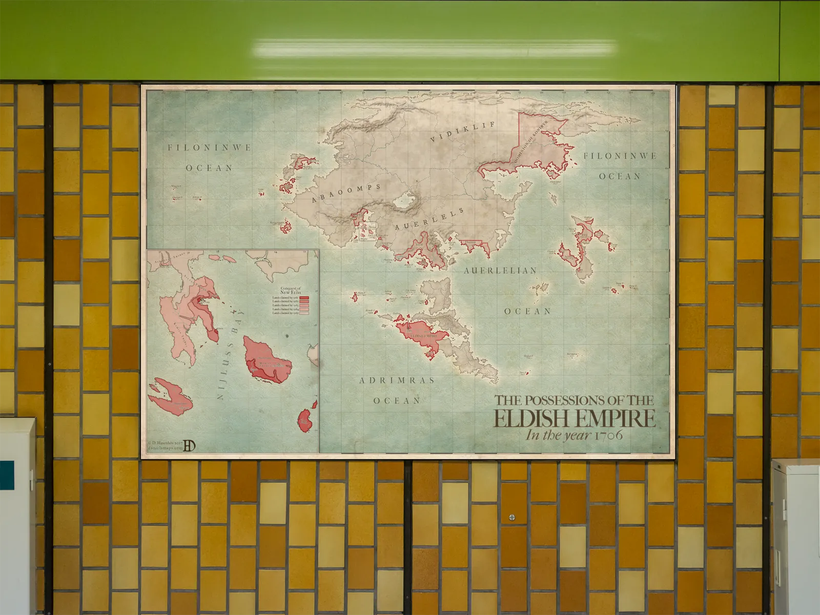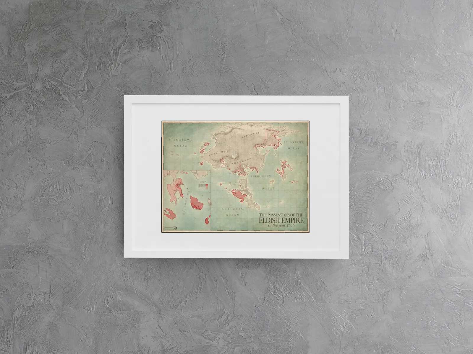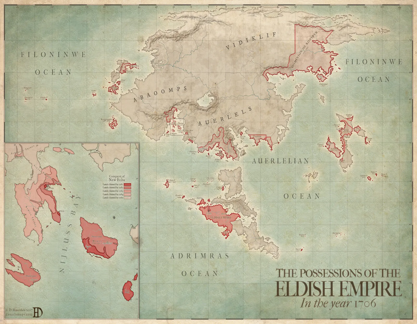 The Elda – Possessions of the Eldish Empire Fantasy Map presents a sweeping political view of a vast fantasy world shaped by conquest and expansion. Coastlines, island chains, and continental regions are clearly defined, while red borders mark the territorial reach of the Eldish Empire in the year 1706. As a result, this Elda fantasy map communicates power, scale, and historical momentum at a glance.