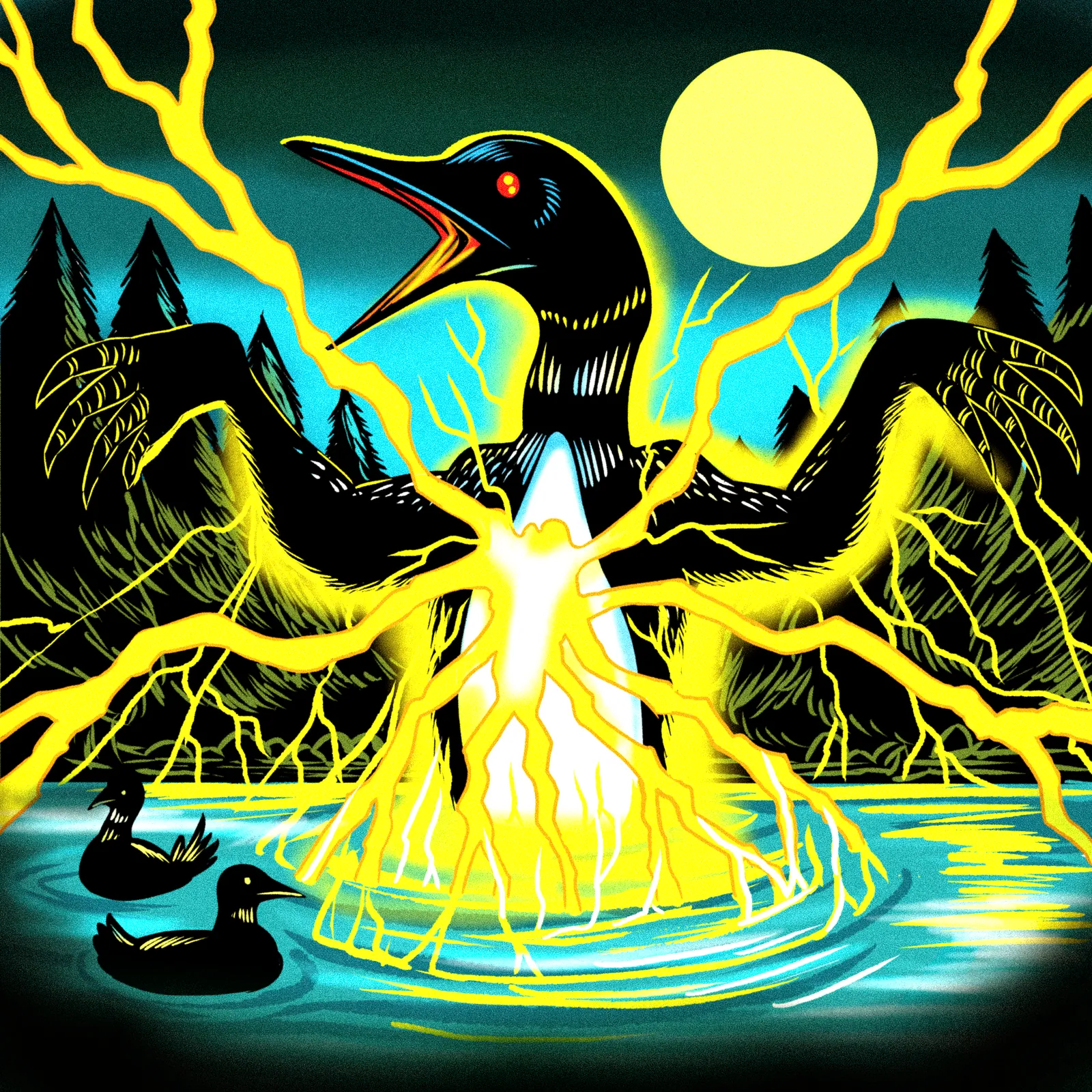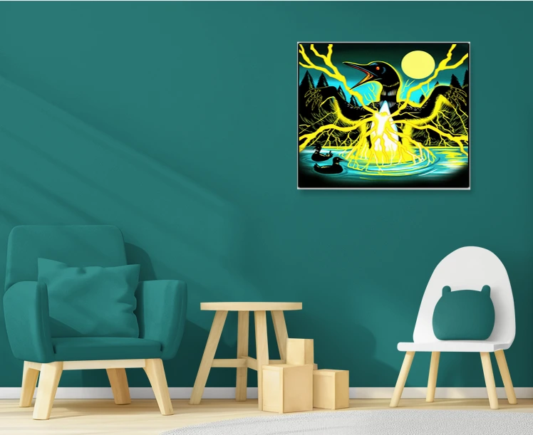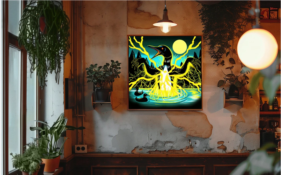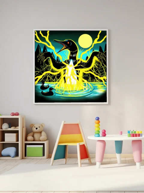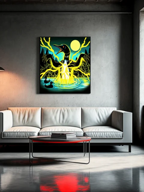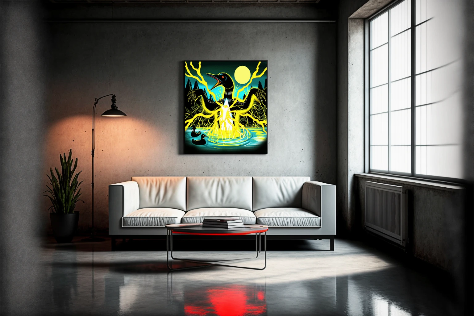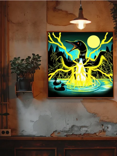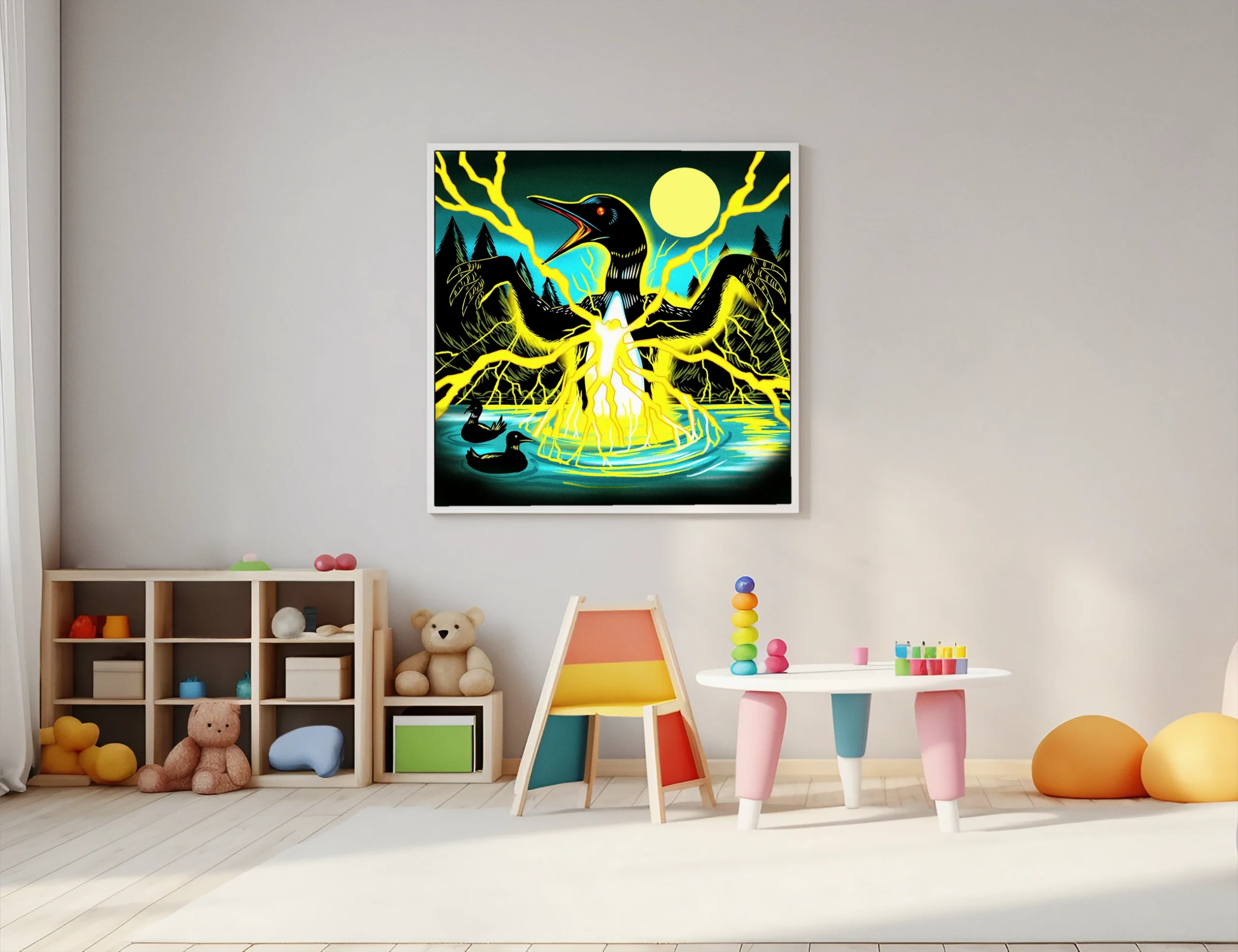 A black loon spreads its wings wide with yellow lightning erupting from its chest. This electroloon art trading card art canvas print showcases Fabricio Vainer’s bold illustration in full scale. Notably, two smaller waterfowl silhouettes float on turquoise water below the dominant figure.