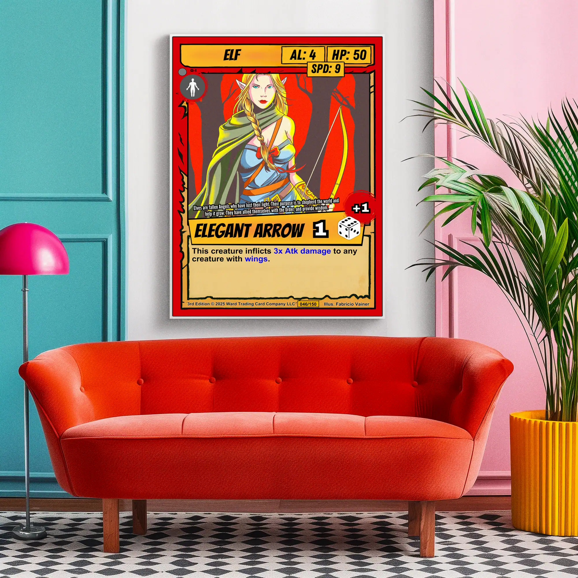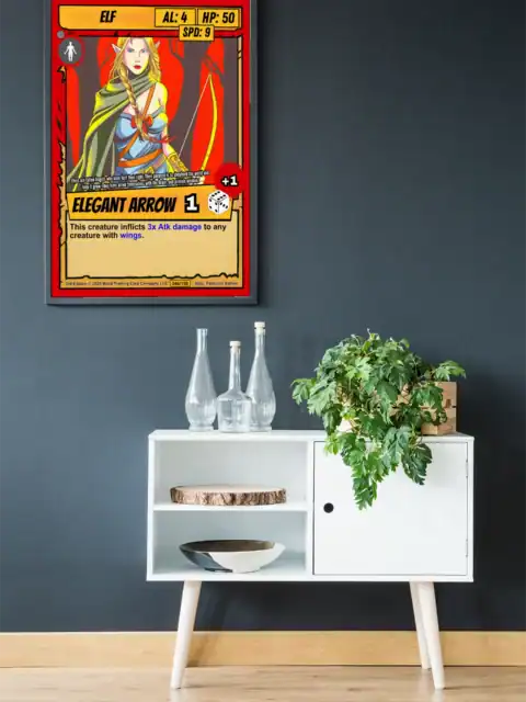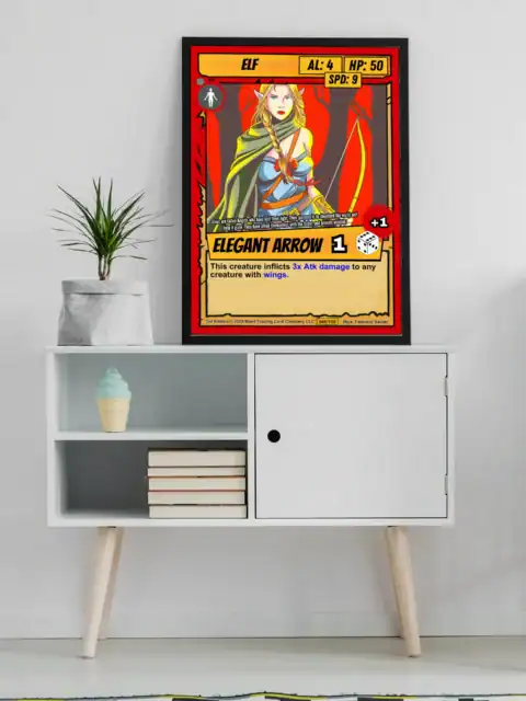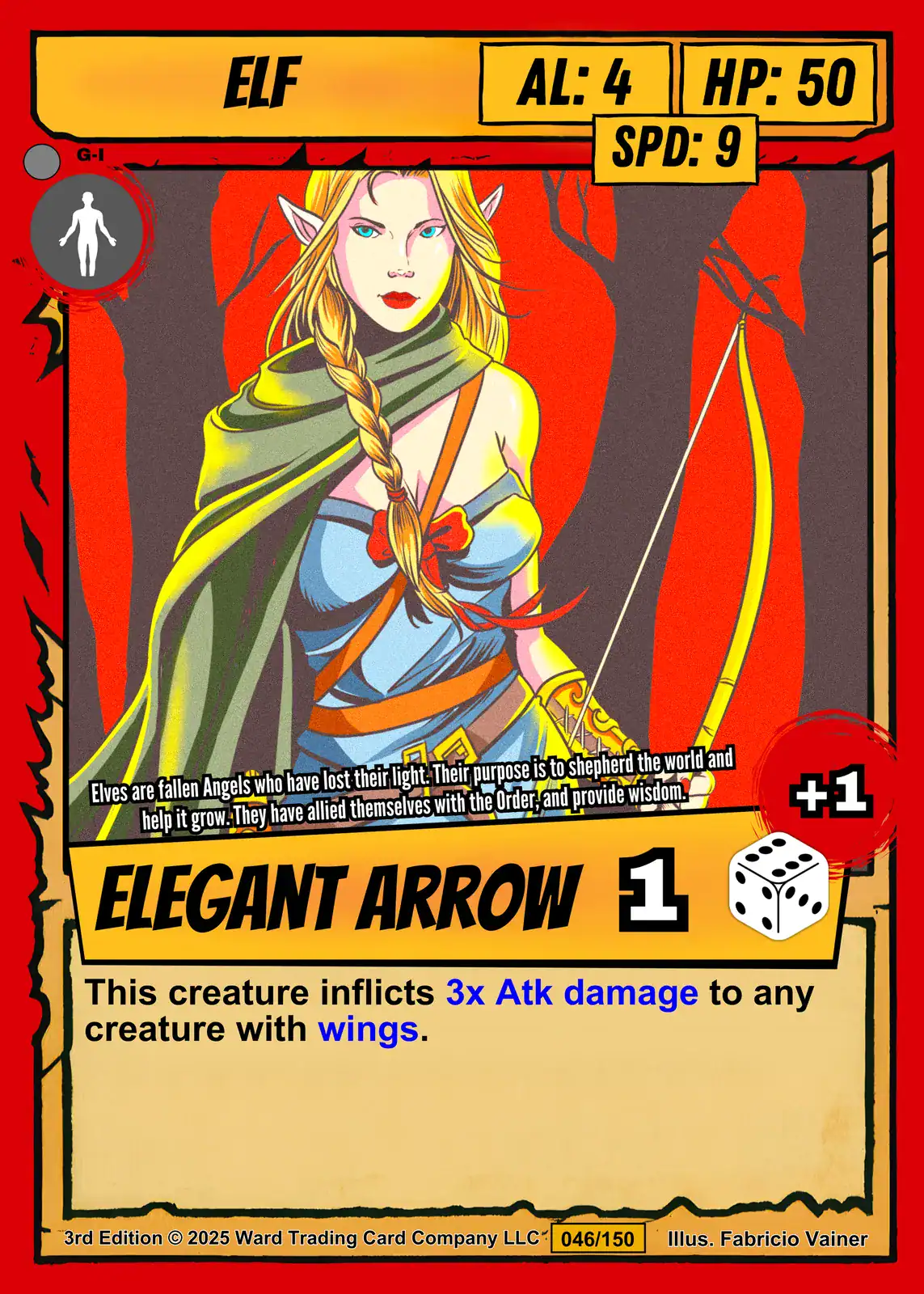 Additionally, the card features a bold red border with torn parchment-style edges. Yellow stat boxes display creature type ELF with AL: 4, HP: 50, and SPD: 9. A yellow banner reads ELEGANT ARROW with a dice icon showing +1.