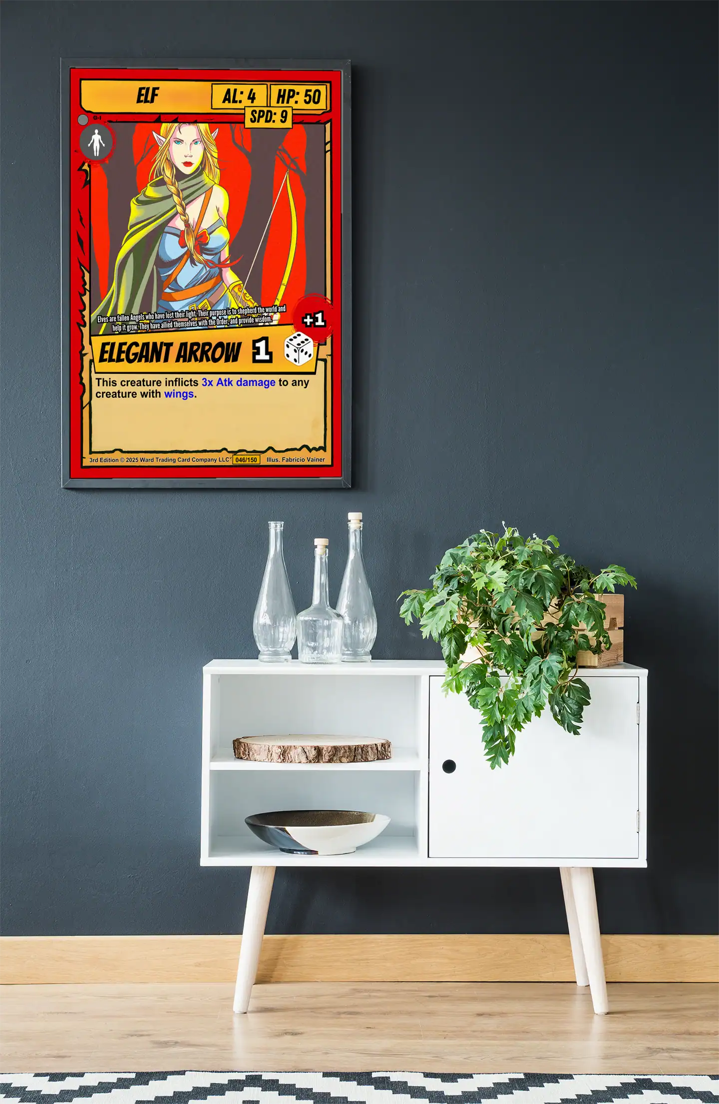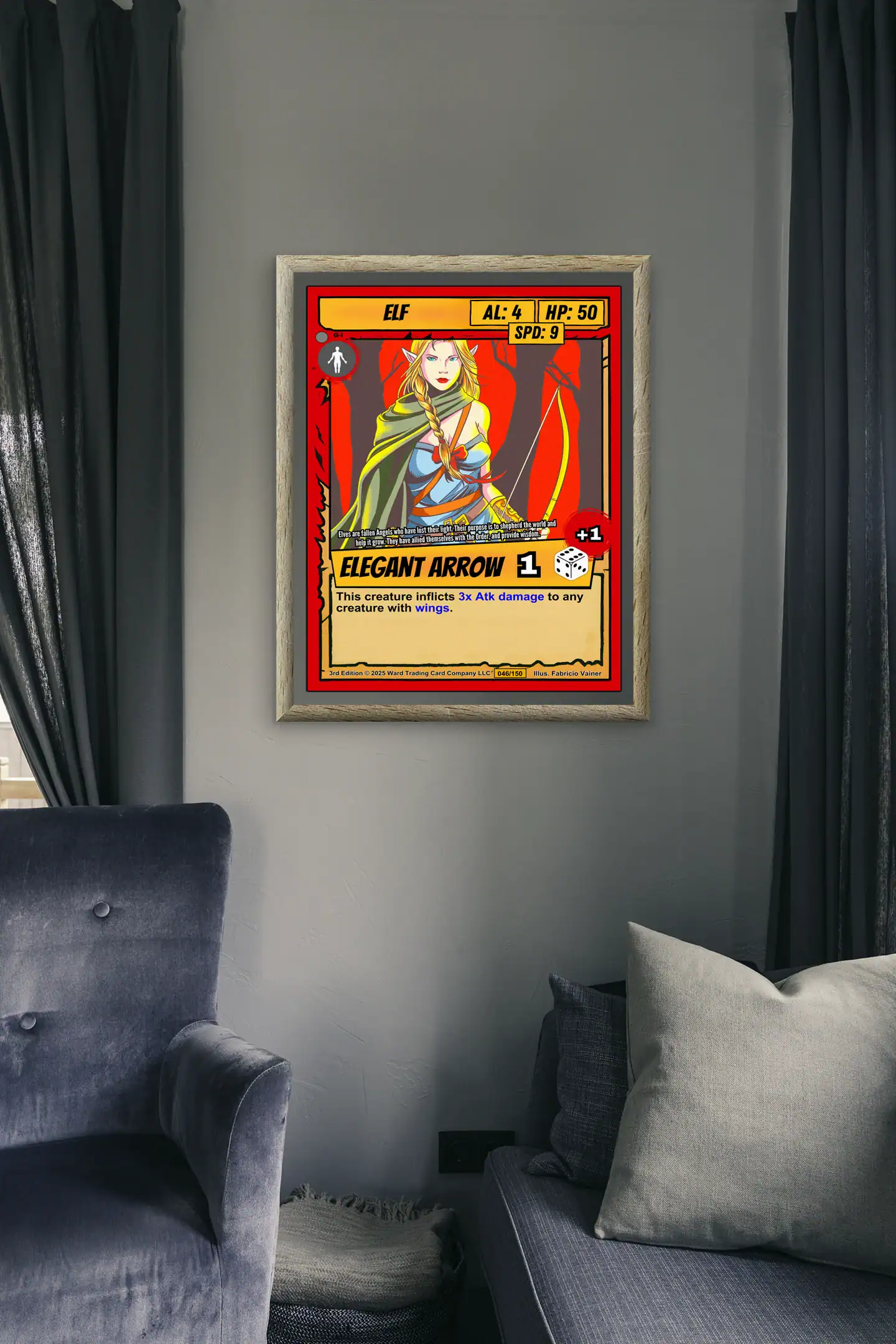 The comic book illustration style uses heavy black outlines and cel-shaded coloring throughout. Collectors of Ward TCG artwork will recognize the humanoid silhouette icon and flavor text about fallen angels. This elf trading card canvas print captures the determined heroism of the original card art.