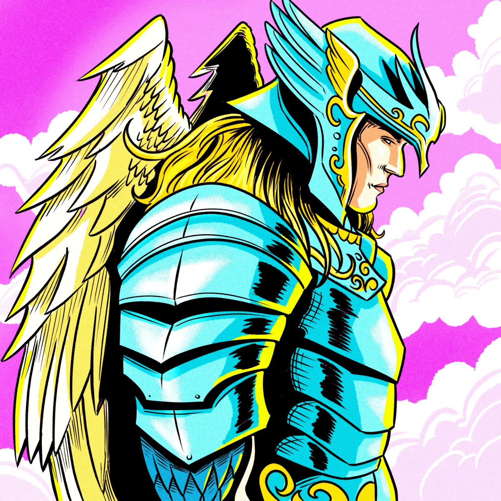 Additionally, heavy black ink outlines define every form with comic book precision and clarity. Golden filigree scrollwork decorates the armor plates in ornate geometric patterns throughout. The cream and yellow wing feathers moreover echo the flowing blonde hair.