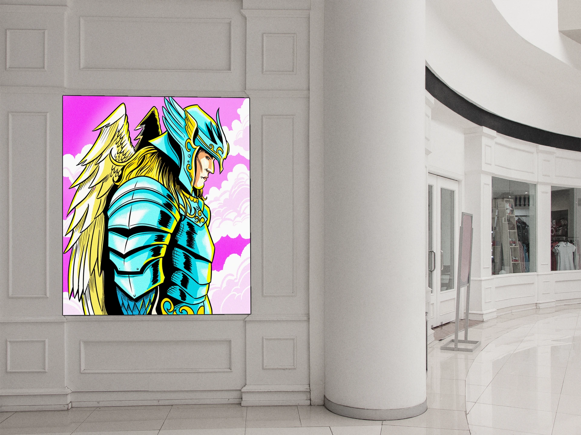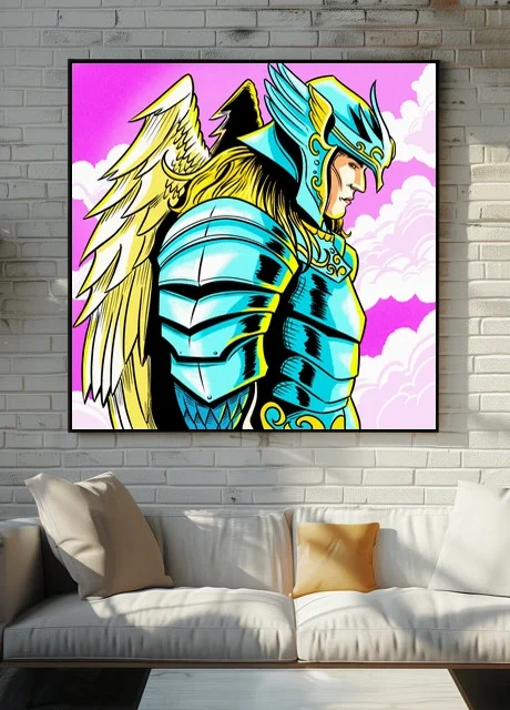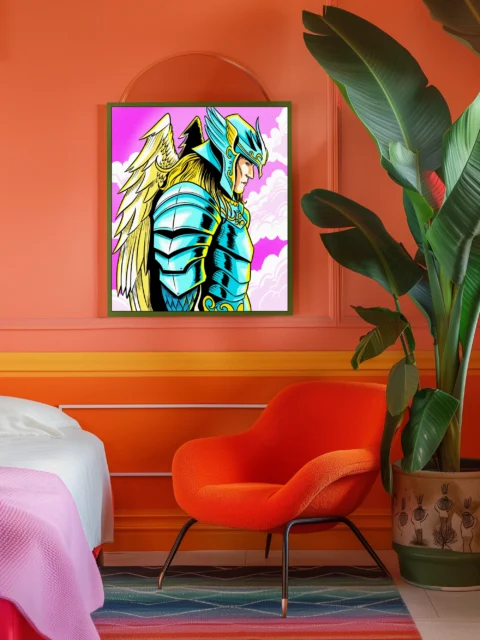 On the wall, the bold color palette holds intensity a card-sized version cannot. Ward TCG collectors and comic art fans gain a gallery-ready warrior piece. This elte angel art trading card art canvas print delivers heroic scale without borders.