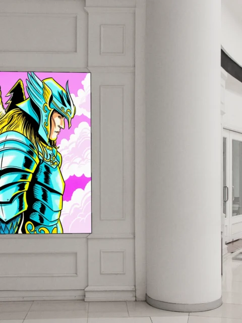 Display in game rooms where bold color schemes and fantasy warrior imagery anchor collector walls. Additionally, the retro comic aesthetic pairs with illustrated fantasy art collections and pop art displays.