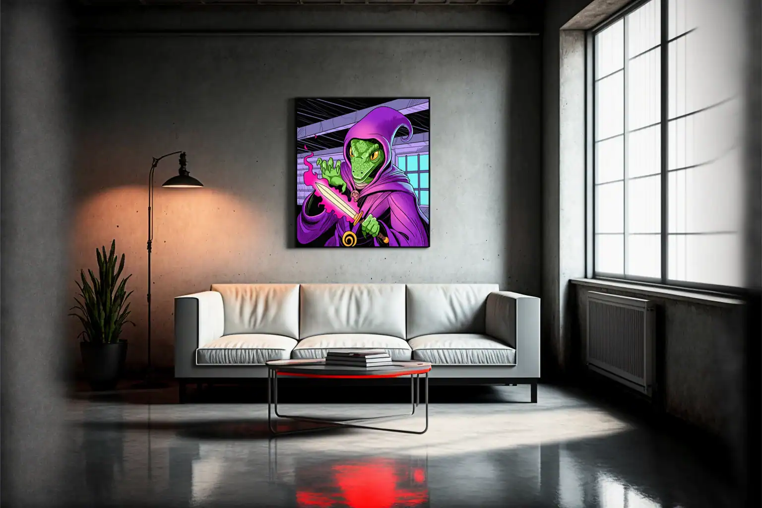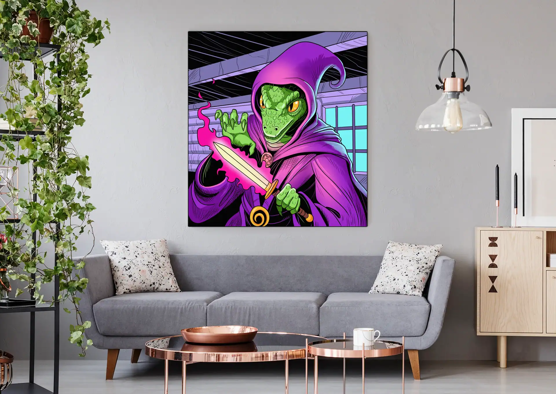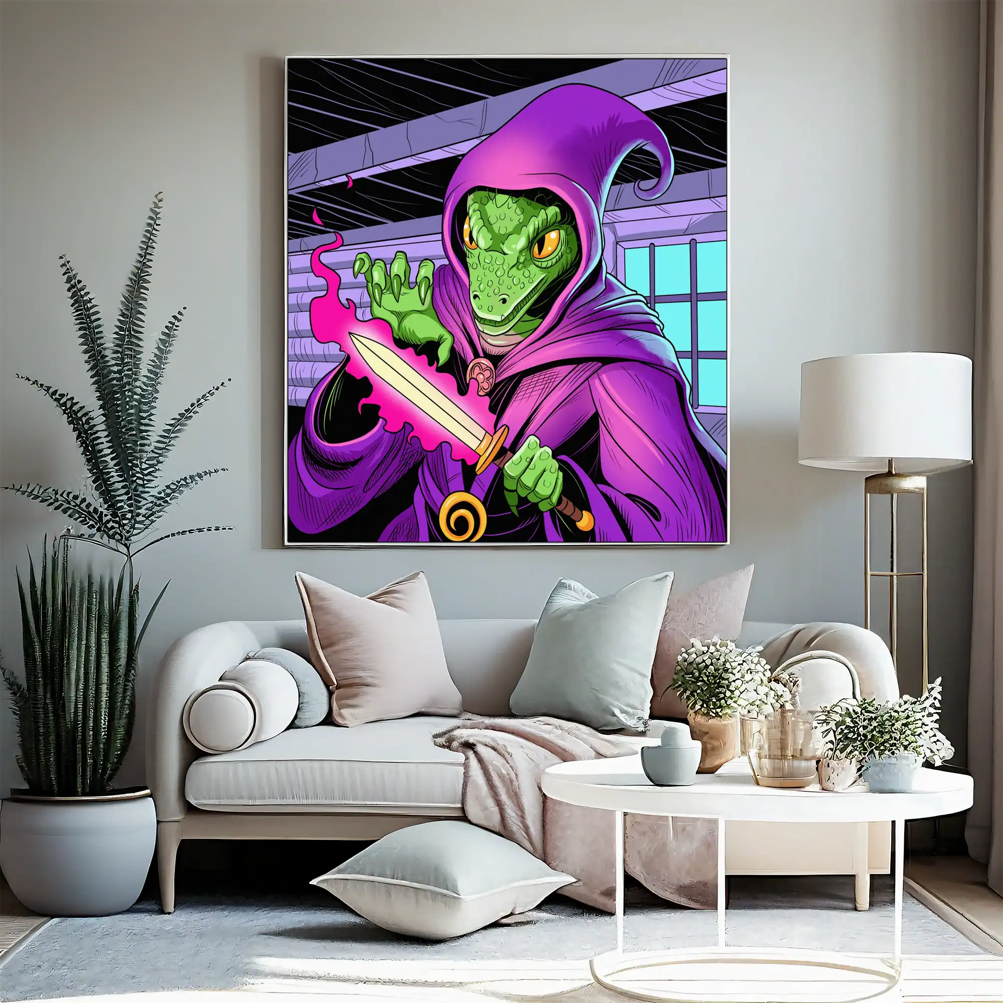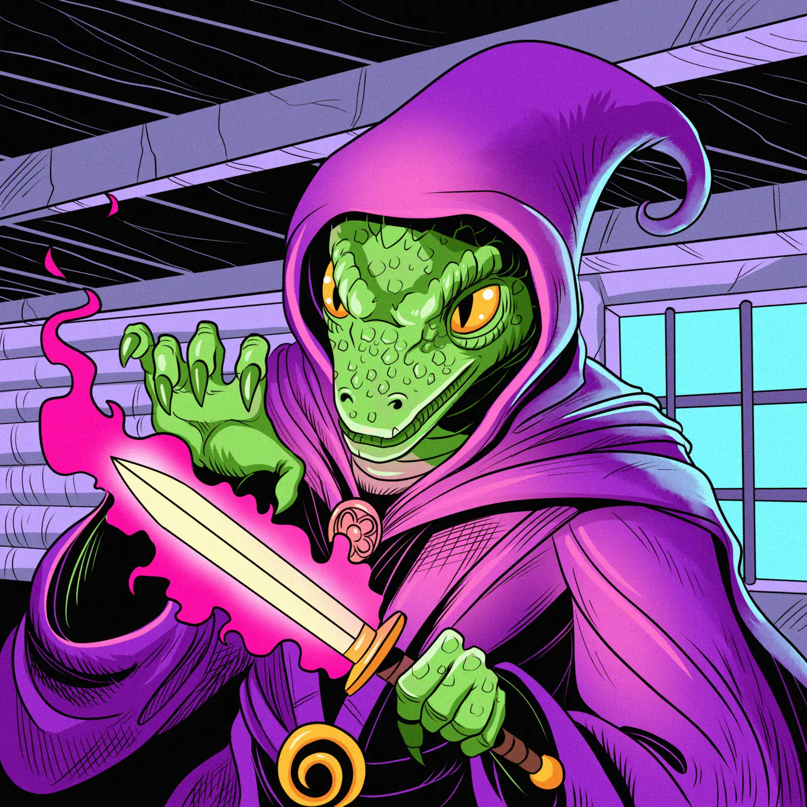 Indeed, exposed ceiling timbers create architectural depth throughout the composition. The vibrant purple robes contrast sharply against scaly green skin. Moreover, cyan window light balances the warm magical energy.