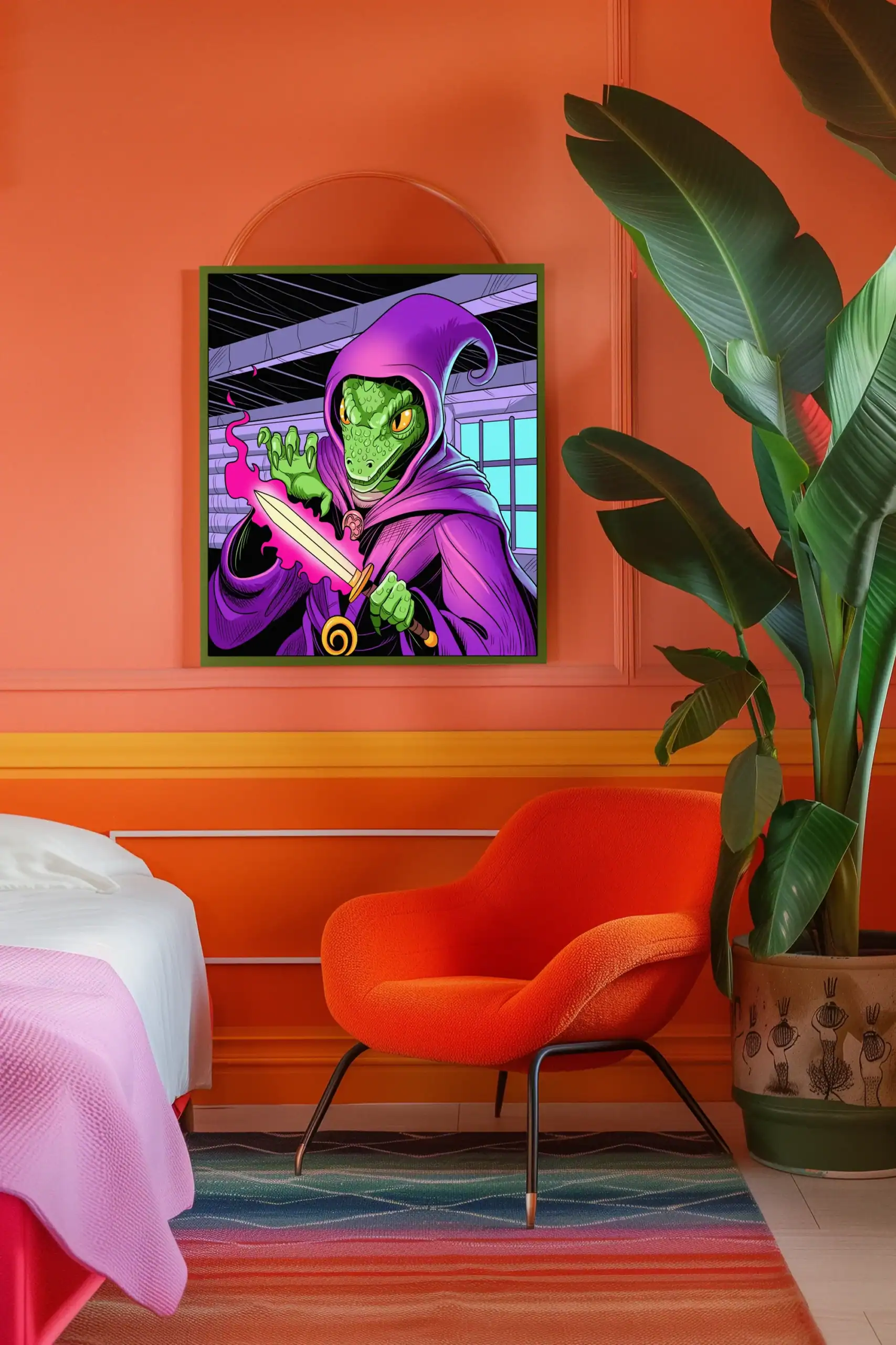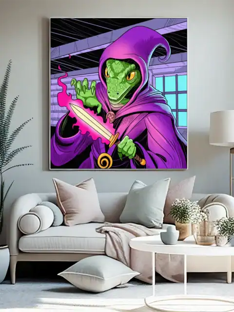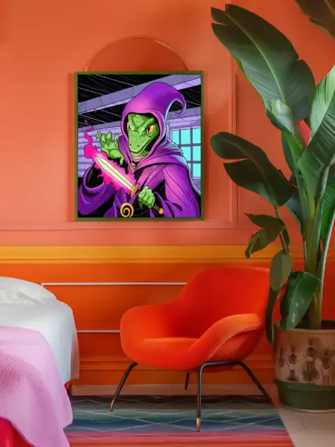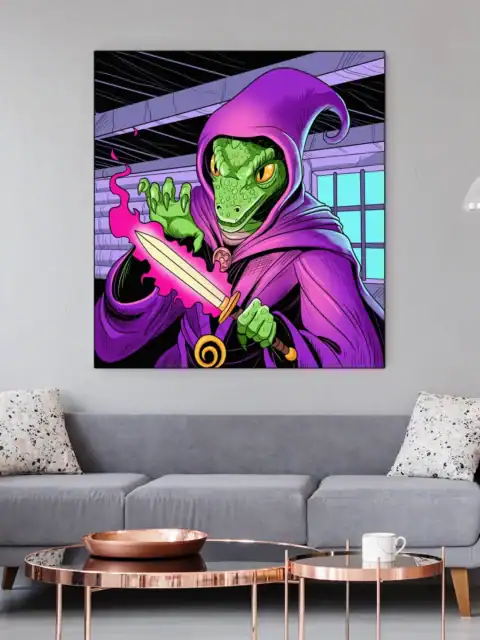A green reptilian sorcerer conjures pink flame from clawed fingertips. This enchantment art trading card canvas print captures Fabricio Vainer’s bold illustration style. Notably, purple wooden beams frame the mystical attic scene.