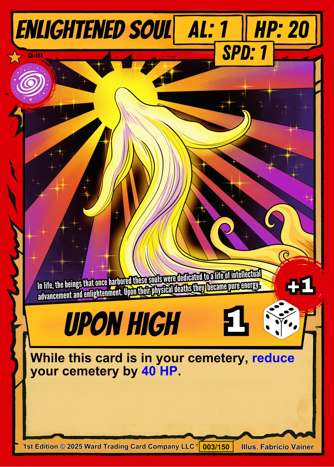 Additionally, the card displays a distressed red border framing a tan inner edge. The orange header banner shows ‘ENLIGHTENED SOUL’ above yellow stat boxes. Stats read AL: 1, HP: 20, and SPD: 1.