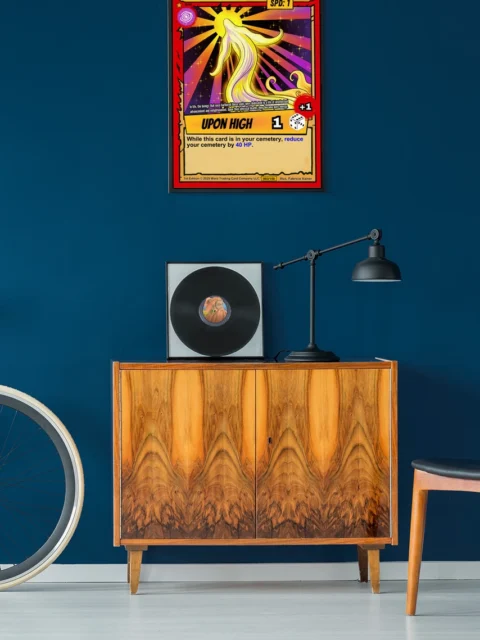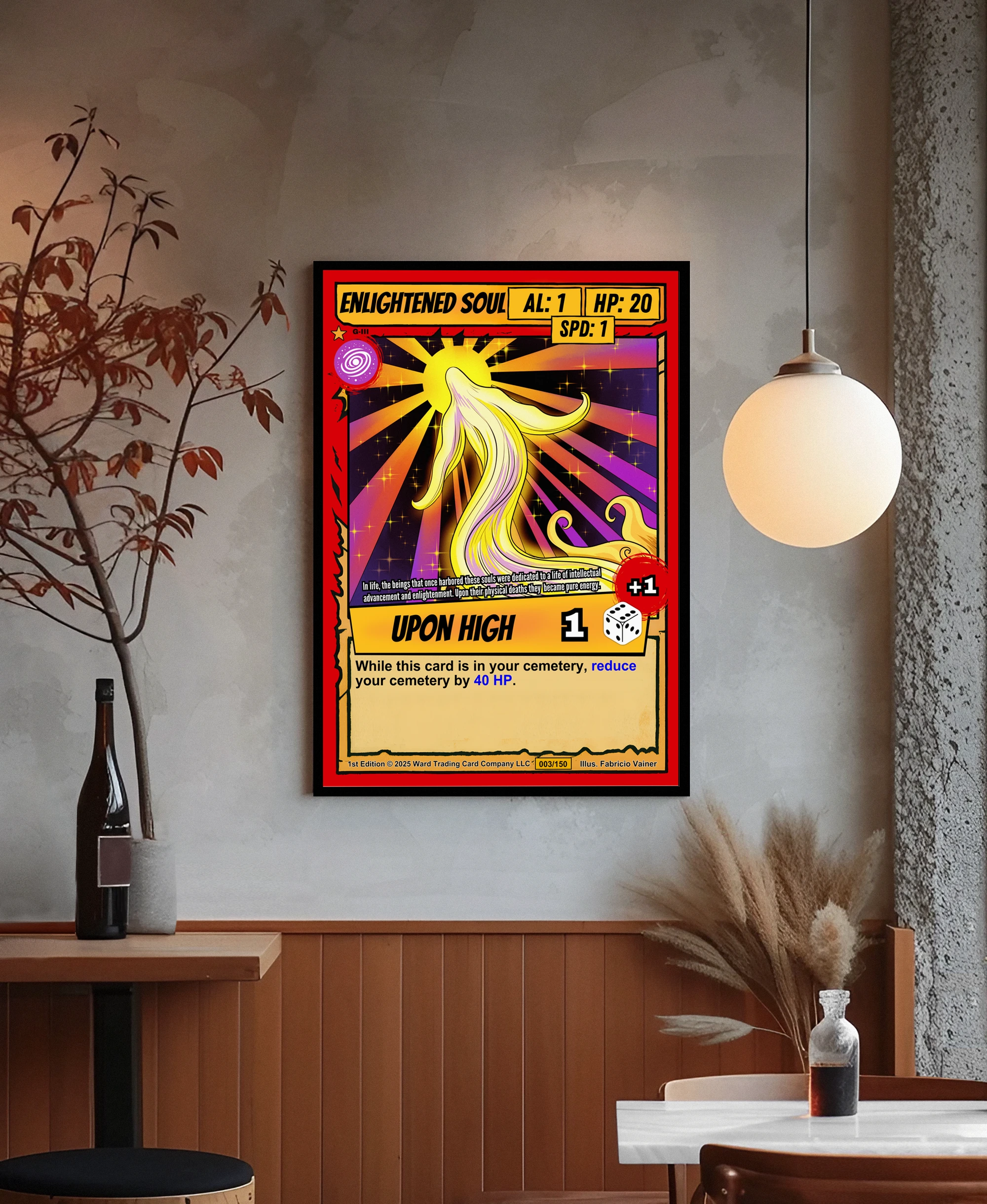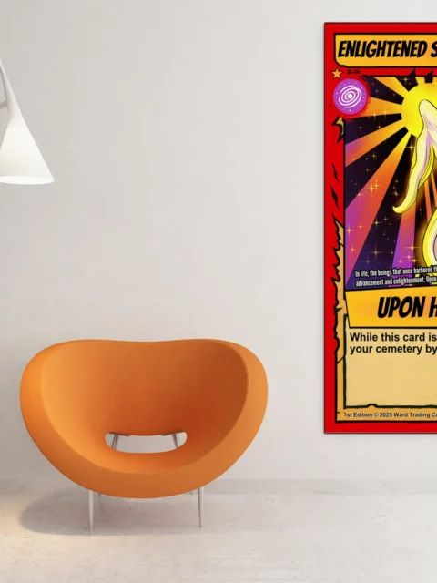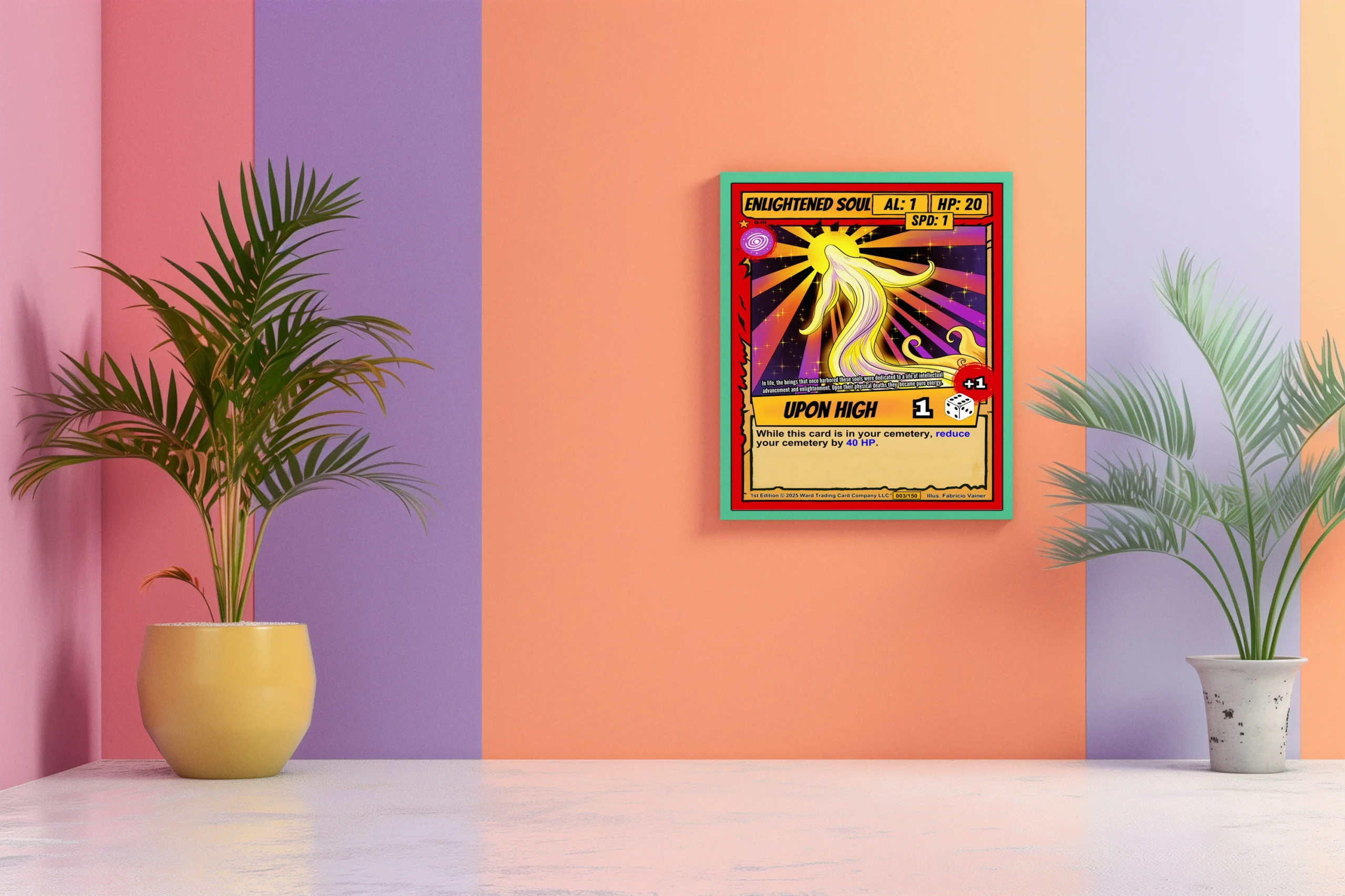 At room scale, the G-III energy symbol and cosmic rays command attention. Ward TCG collectors recognize this as a visual anchor for game rooms. This enlightened soul trading card canvas print works particularly well where the gold-on-purple contrast reads clearly.