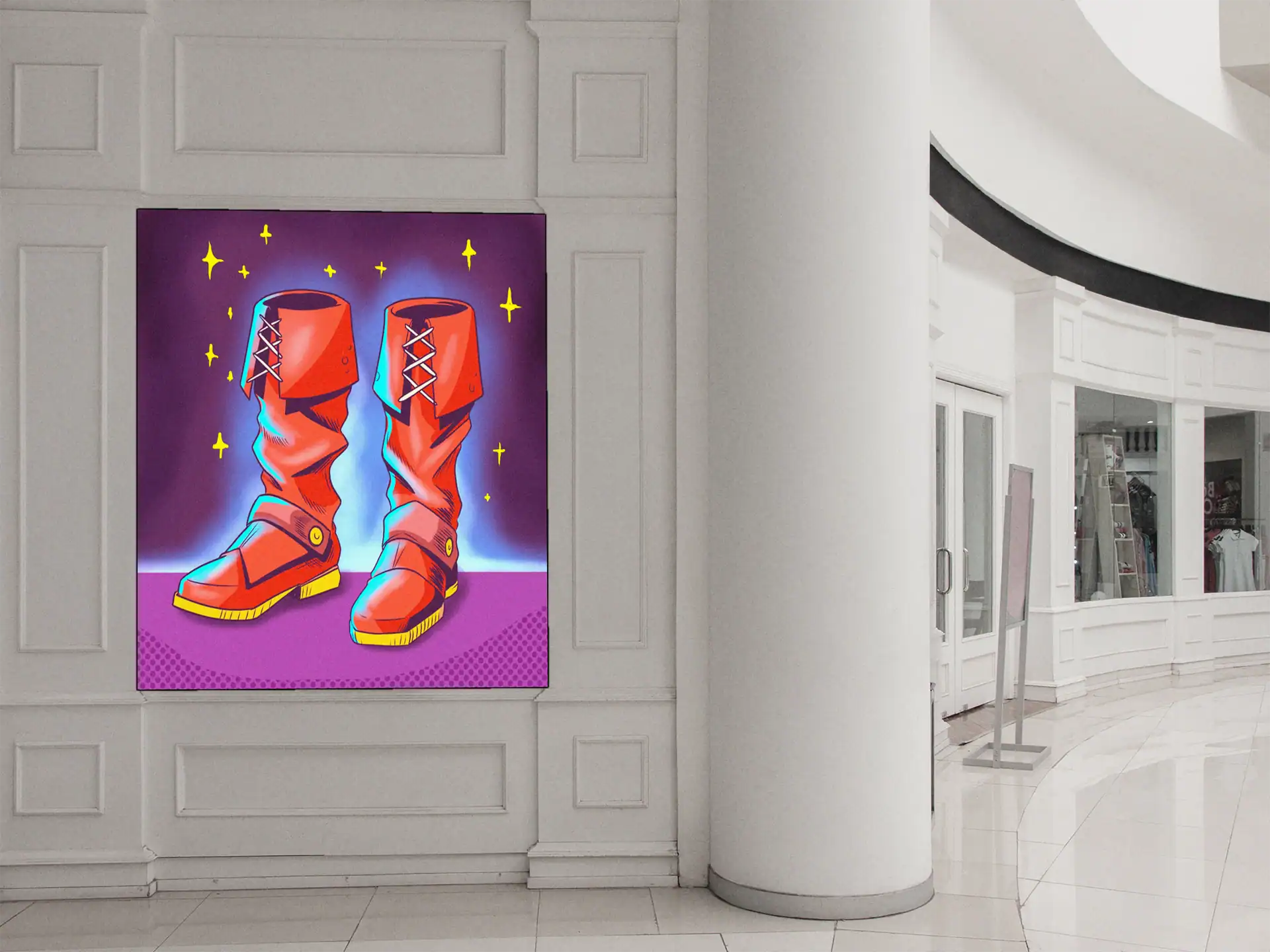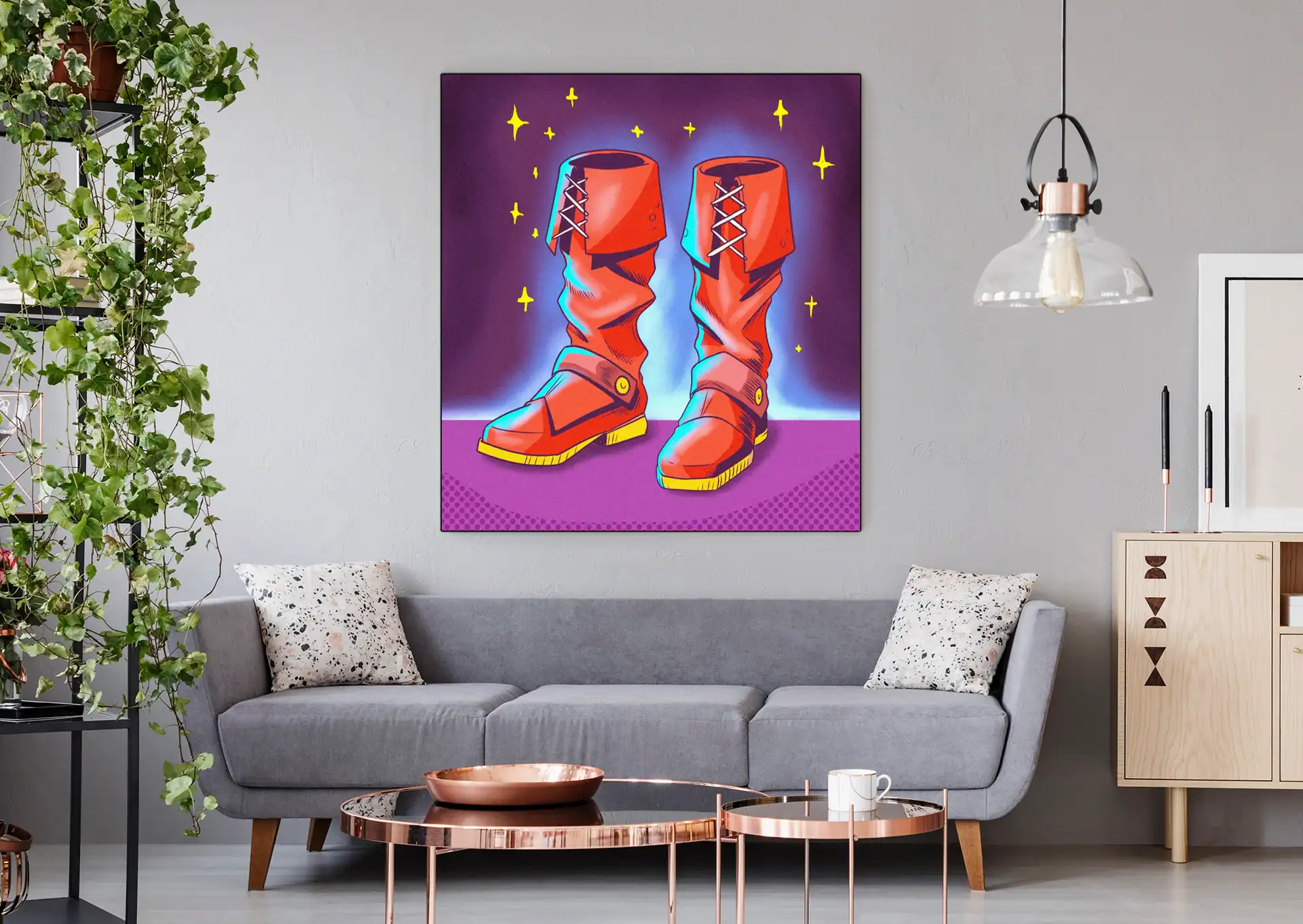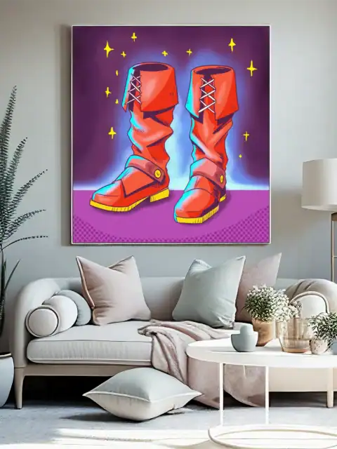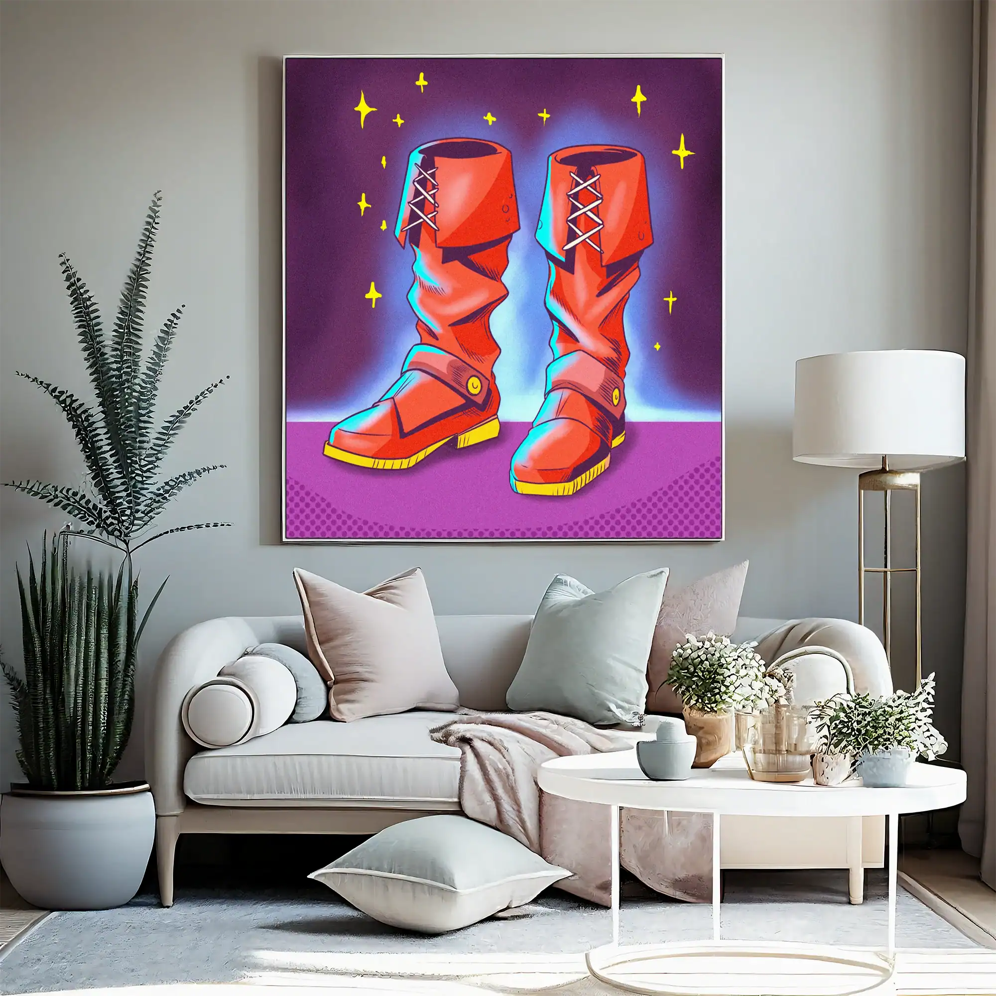 Red fantasy boots dominate the frame with exaggerated proportions and white cross-lacing. This epic boots art trading card canvas print showcases Fabricio Vainer’s retro comic book style. Specifically, cyan highlights rim the edges creating an otherworldly glow effect.