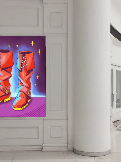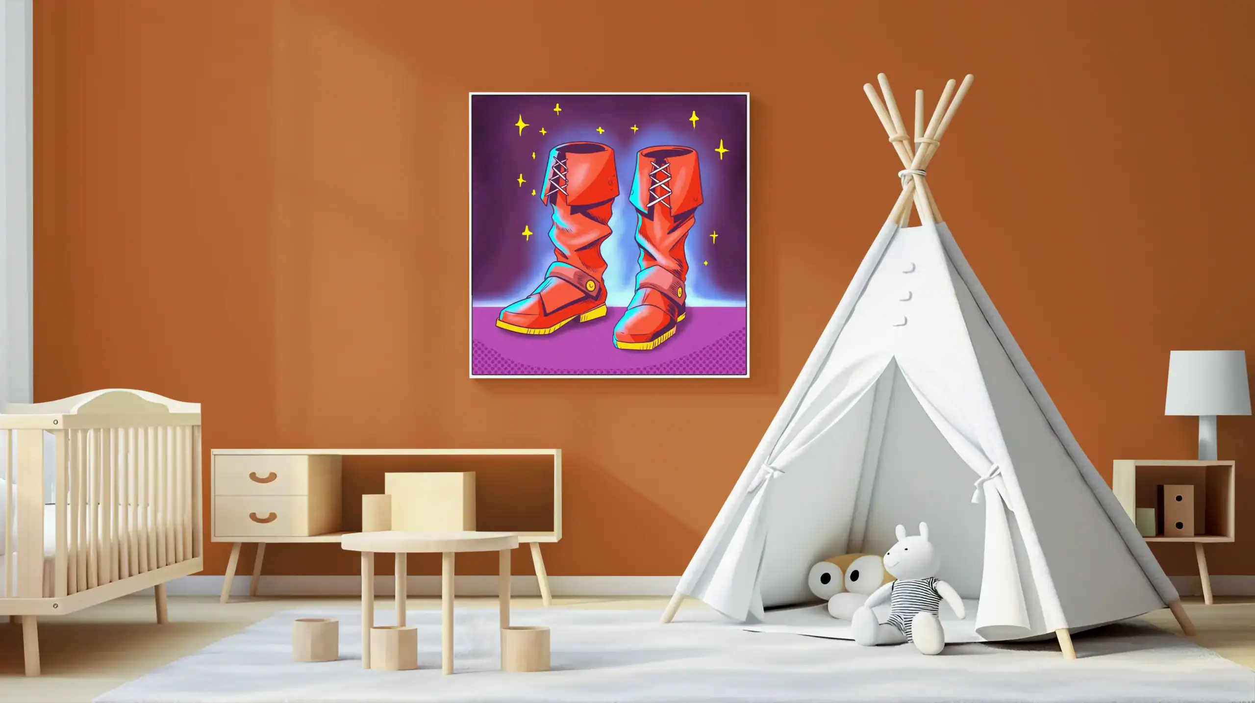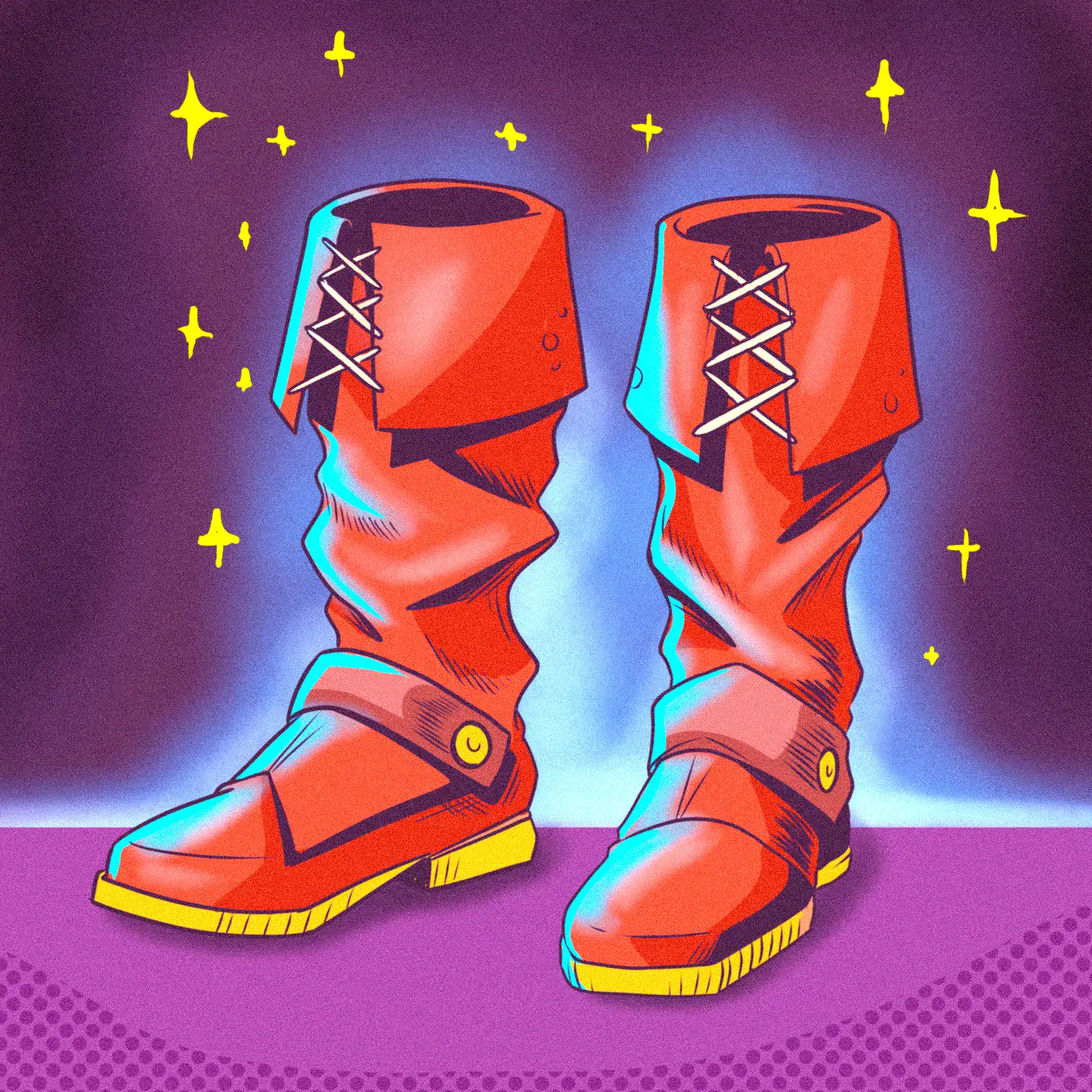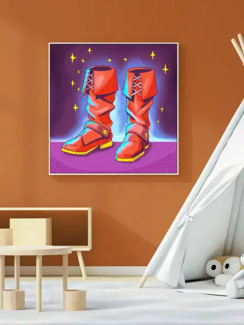 Red fantasy boots dominate the frame with exaggerated proportions and white cross-lacing. This epic boots art trading card canvas print showcases Fabricio Vainer’s retro comic book style. Specifically, cyan highlights rim the edges creating an otherworldly glow effect.