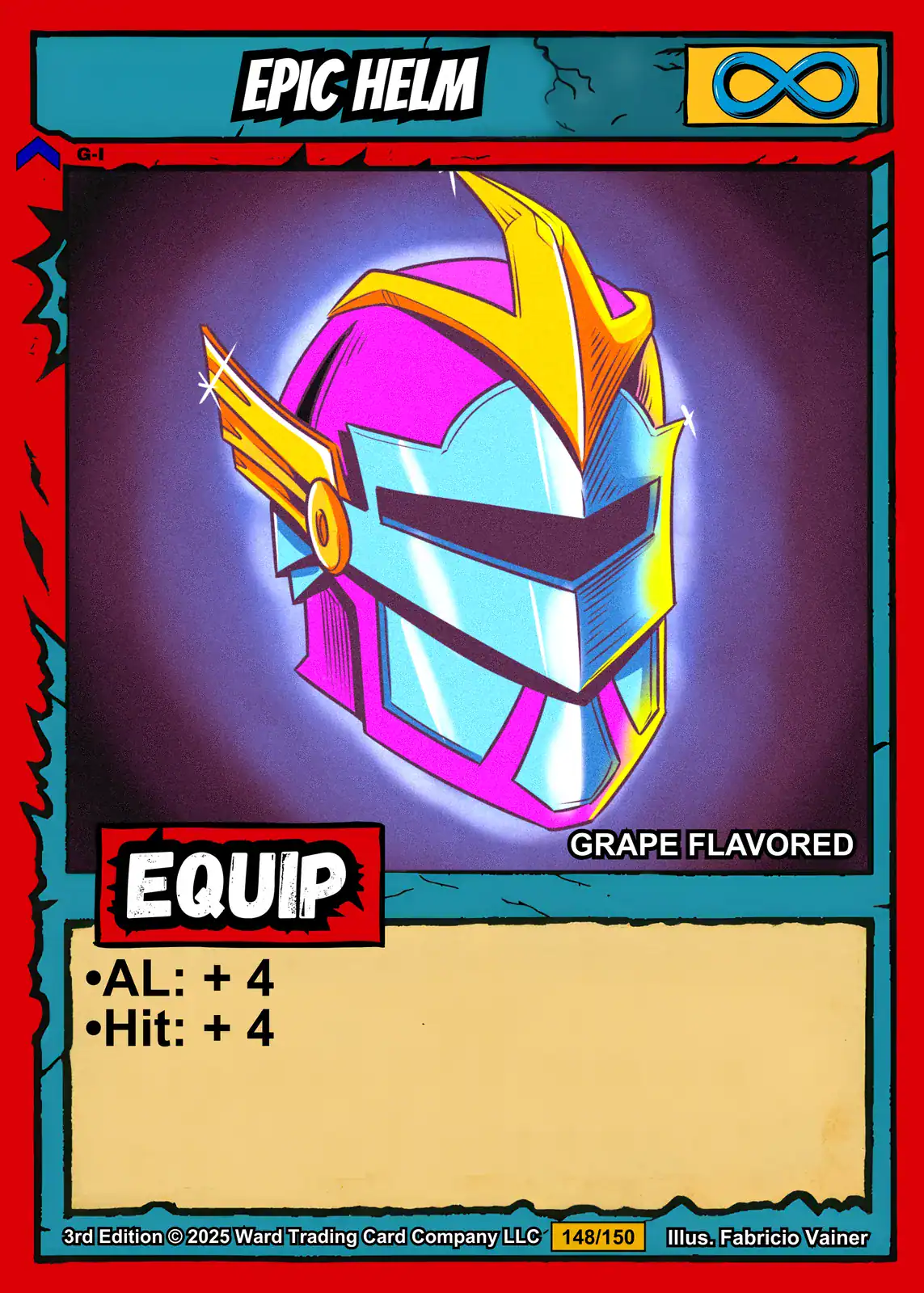 Beyond that, the bright red border anchors cyan frame elements in classic trading card layout. Purple gradient background creates depth behind the floating helmet design. Yellow stat boxes display equipment bonuses in authentic game format.