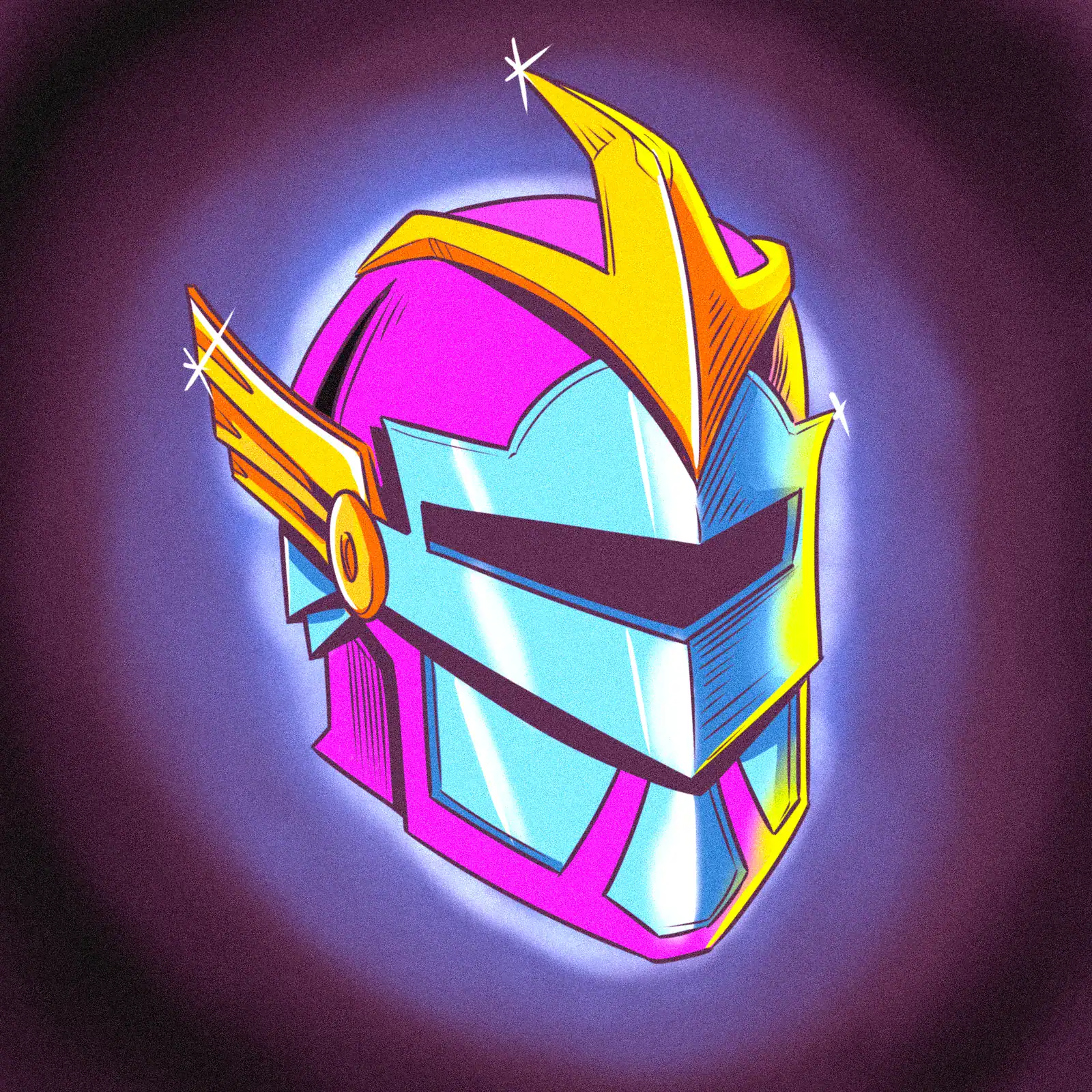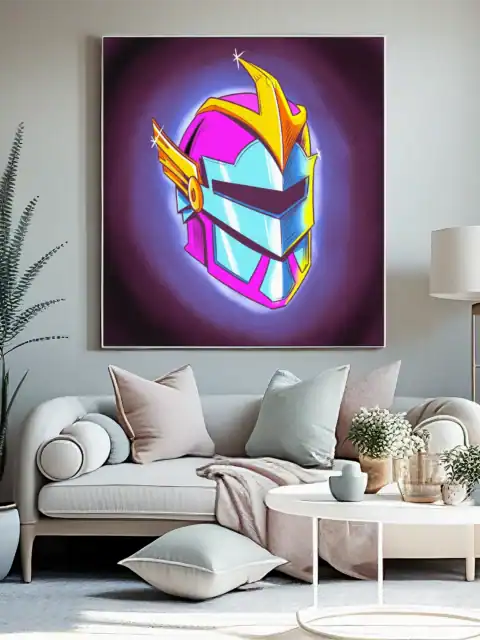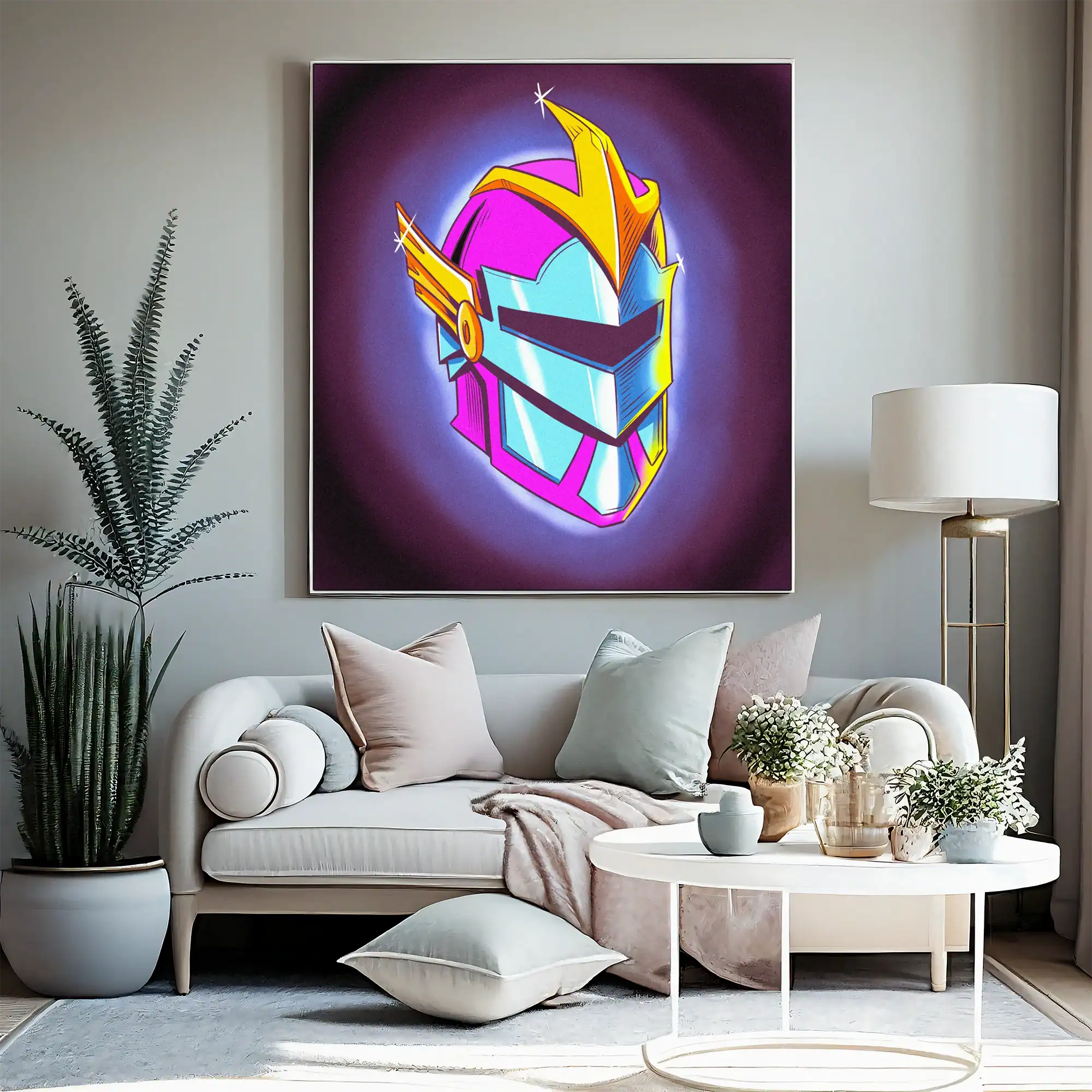 A warrior helmet blazes in neon cyan and hot pink against deep purple. This epic helmet art trading card canvas print captures Fabricio Vainer’s bold comic illustration. Golden horns catch white sparkles, particularly where they pierce the darkness.