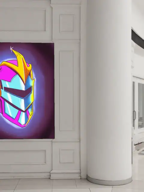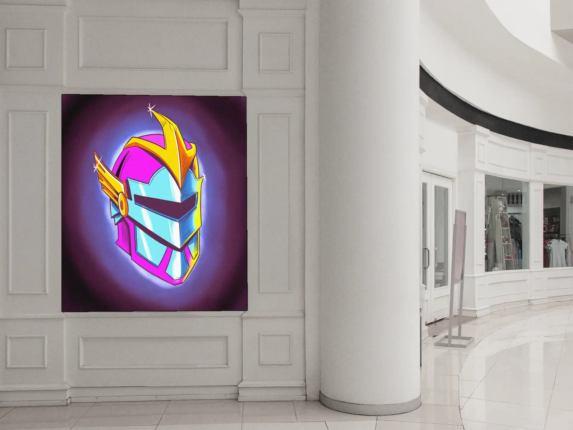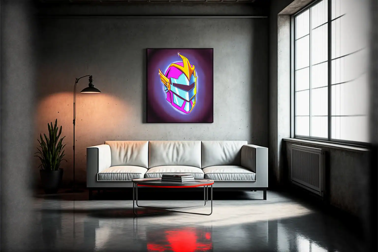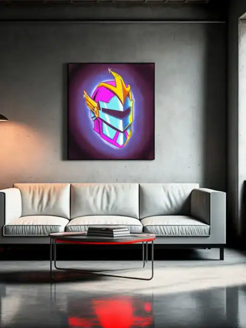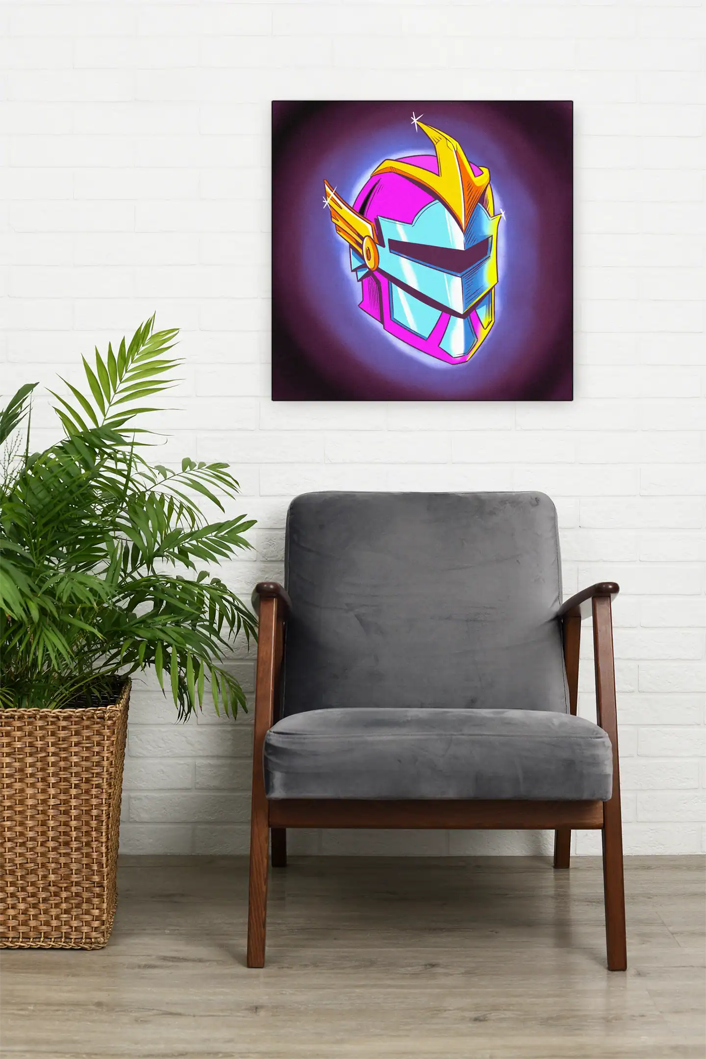 The angular geometry and neon palette mark this as distinctly cyberpunk fantasy. TCG collectors recognize Vainer’s signature style from Ward’s creature designs. Moreover, this epic helmet art trading card canvas print delivers that retro aesthetic.