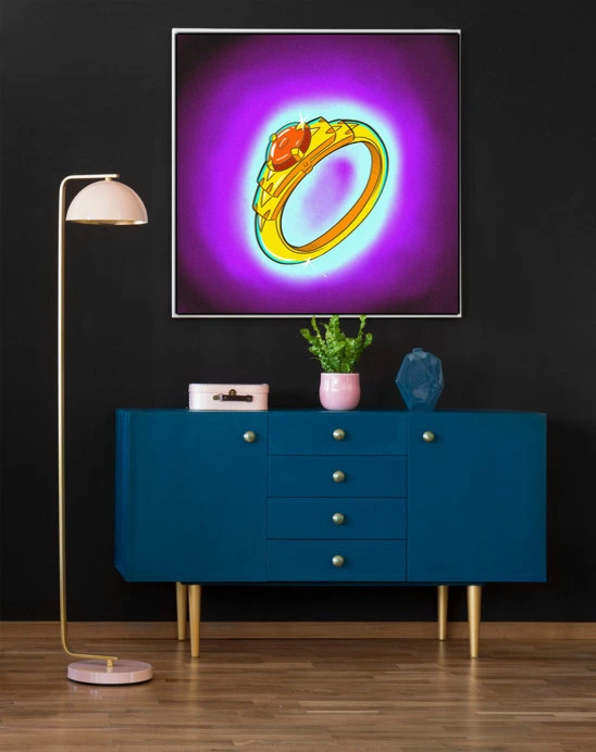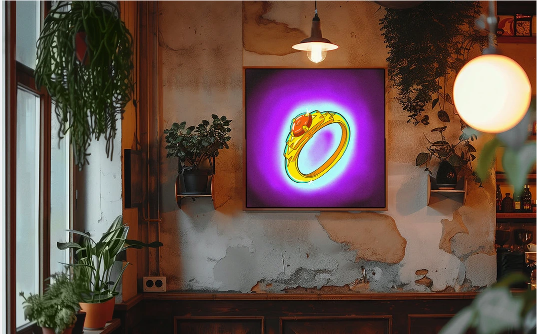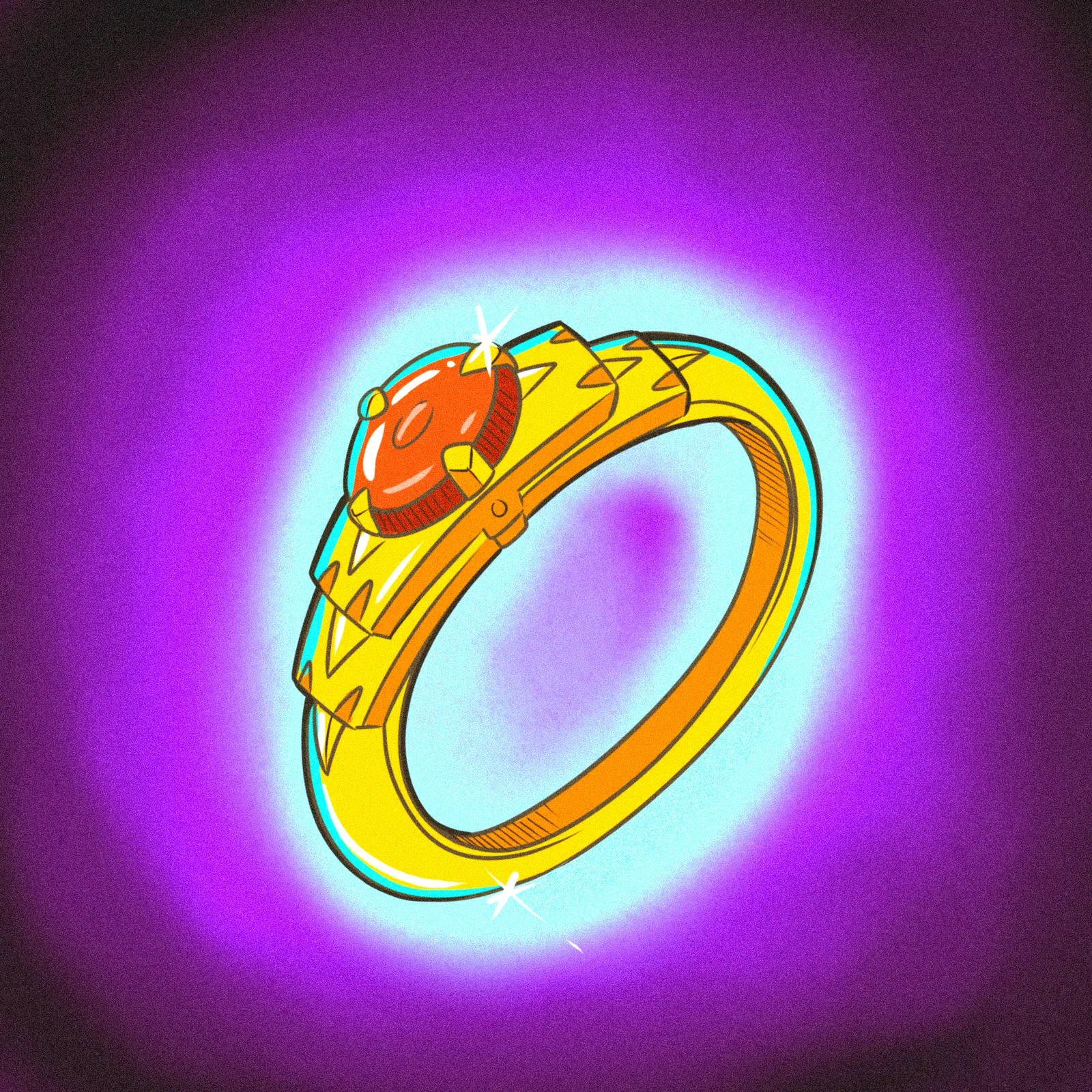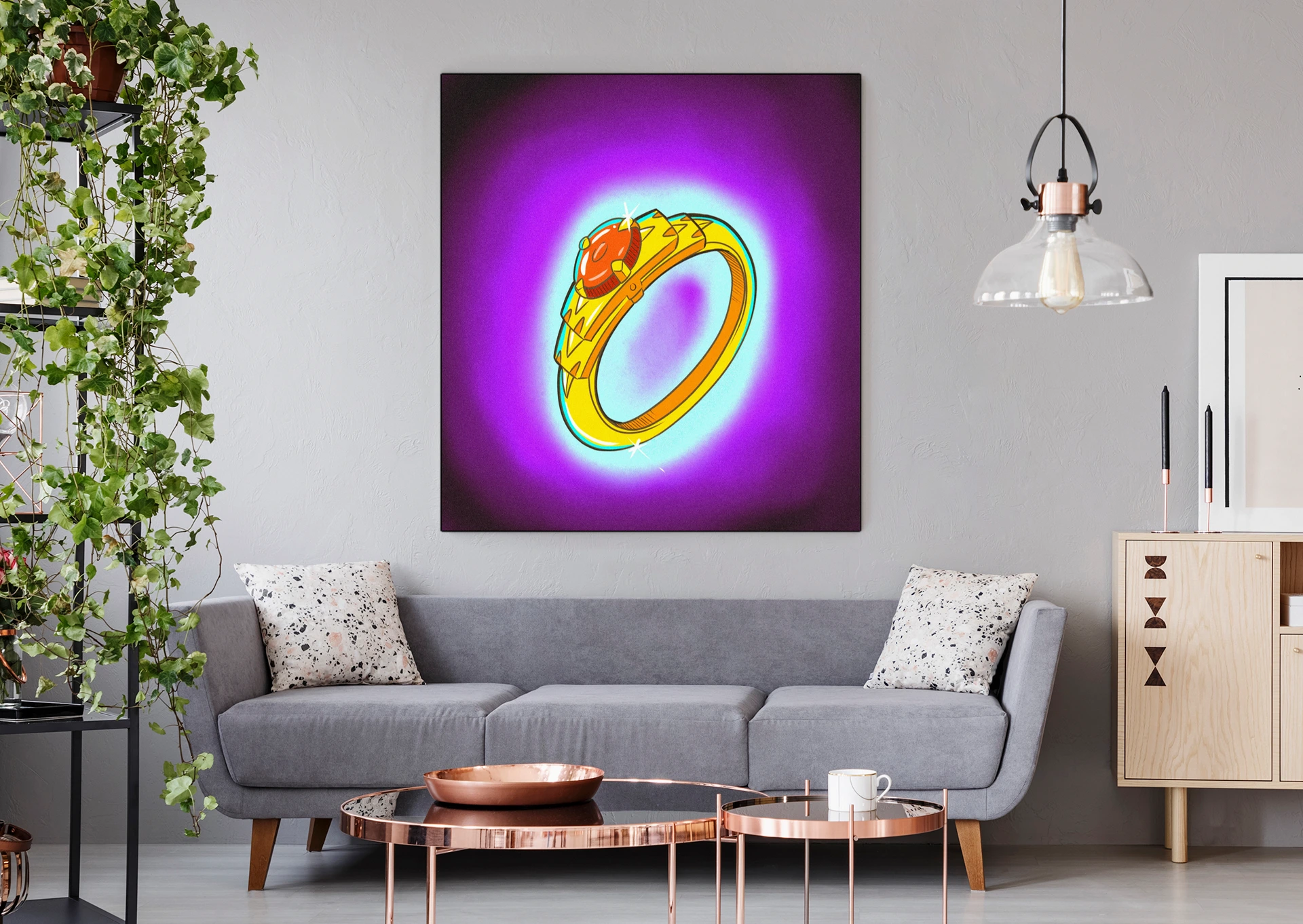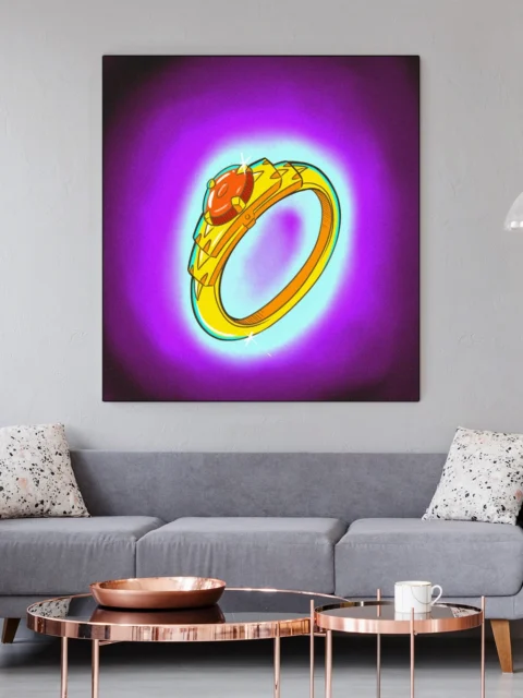 A golden ring with a red-orange gemstone floats against vibrant magenta. This epic ring art trading card art canvas print presents Fabricio Vainer’s bold illustration. Notably, cyan edge highlights trace lightning patterns etched into the gold band.