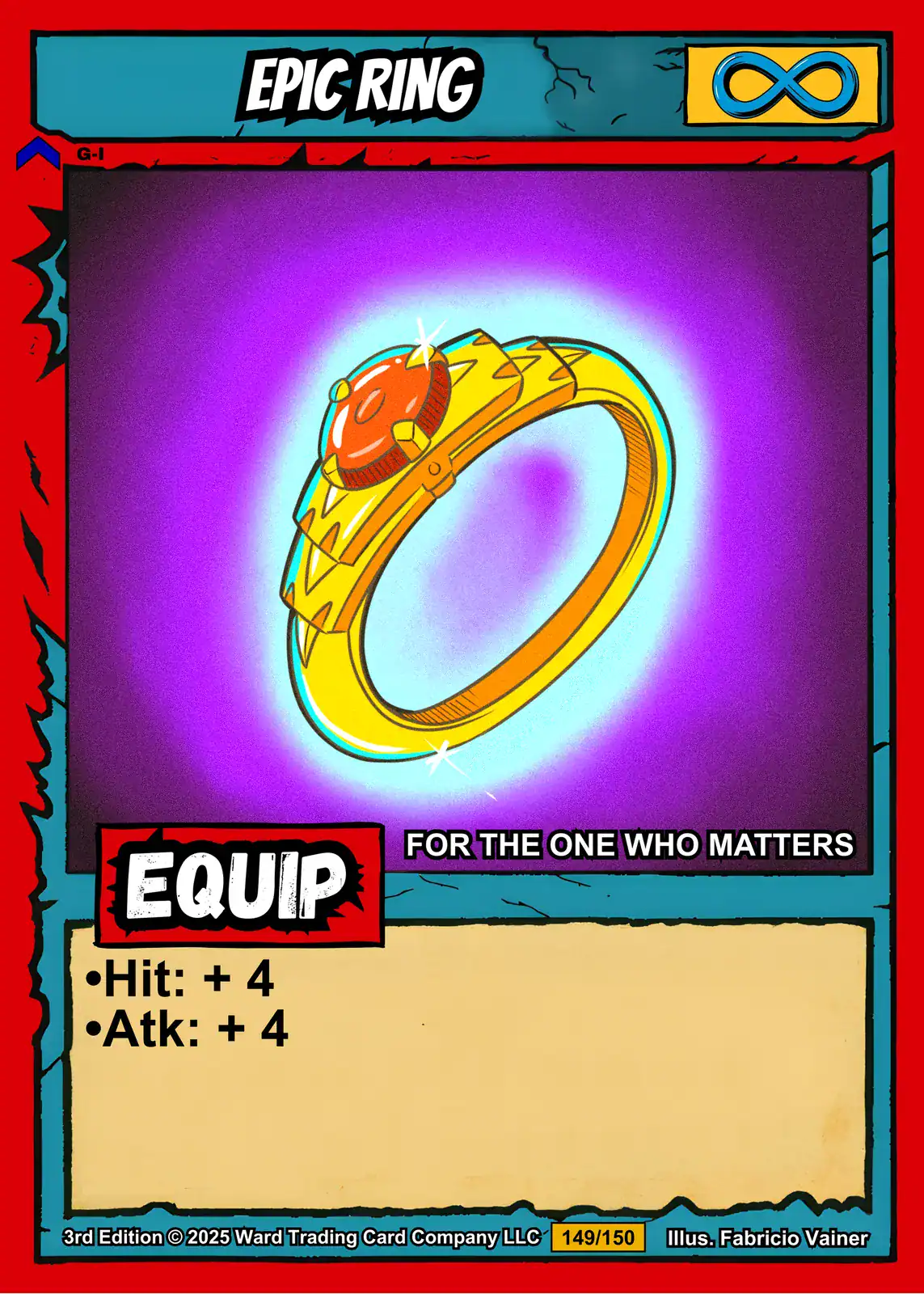 Equally, the red border features lightning bolt patterns that frame the equipment card. The turquoise header displays ‘EPIC RING’ with an infinity symbol corner detail. Meanwhile, tan stat boxes show Hit: +4 and Atk: +4 values.