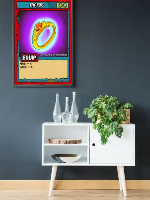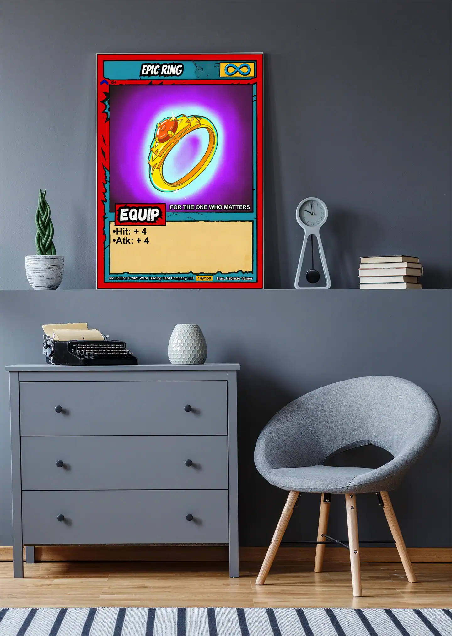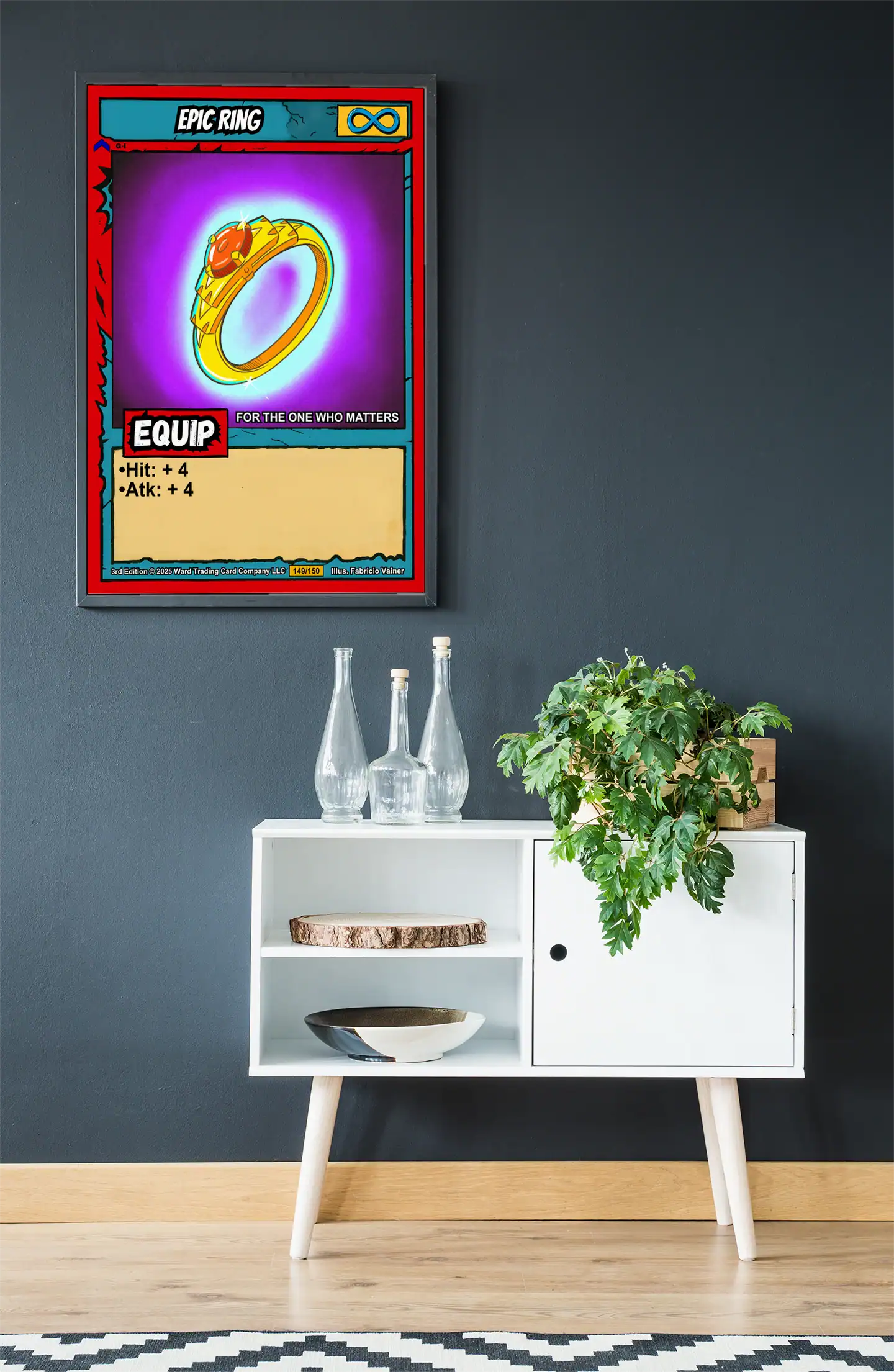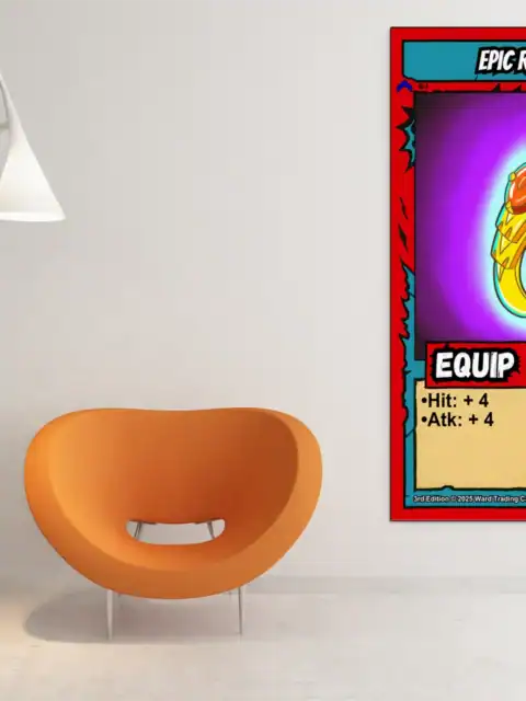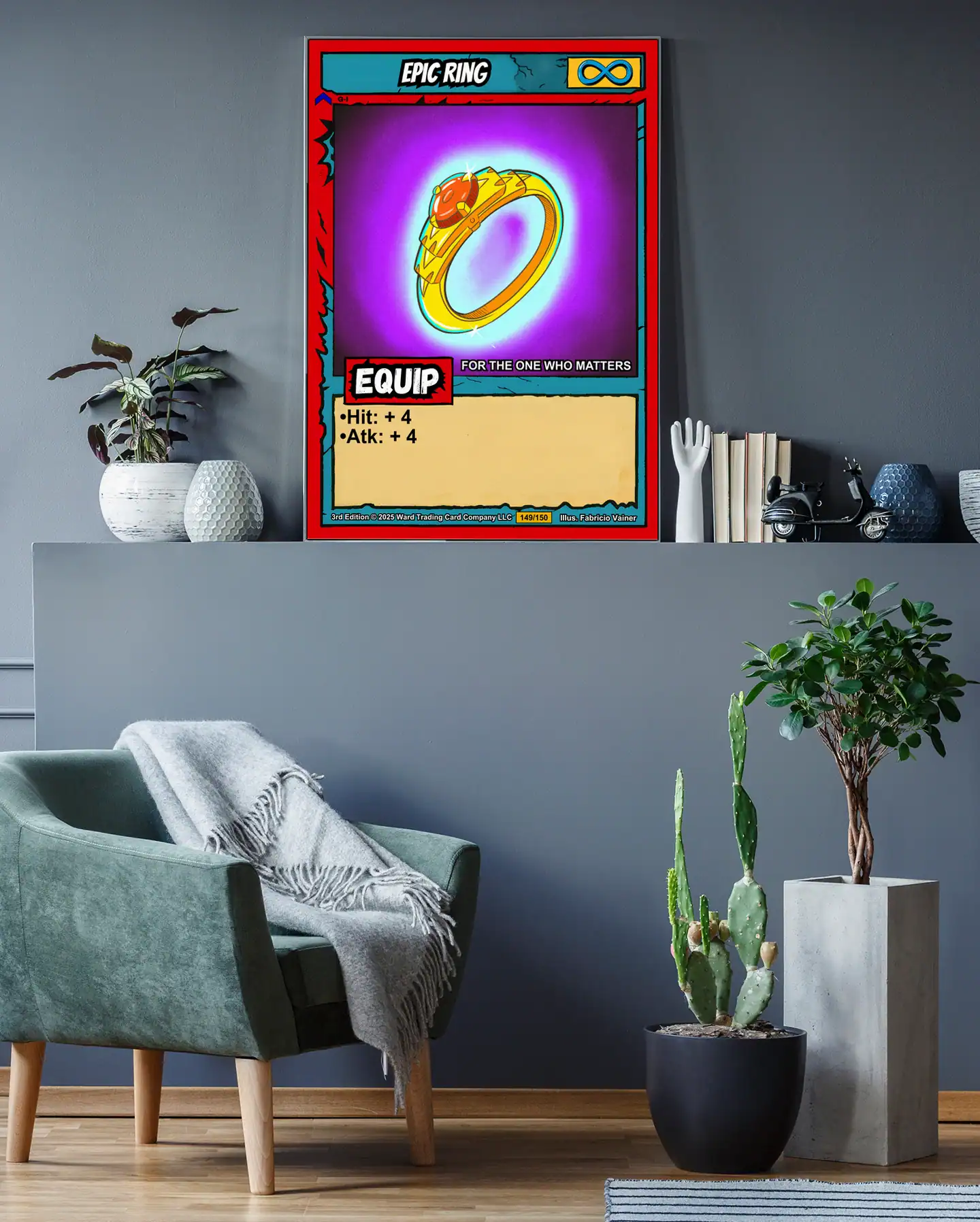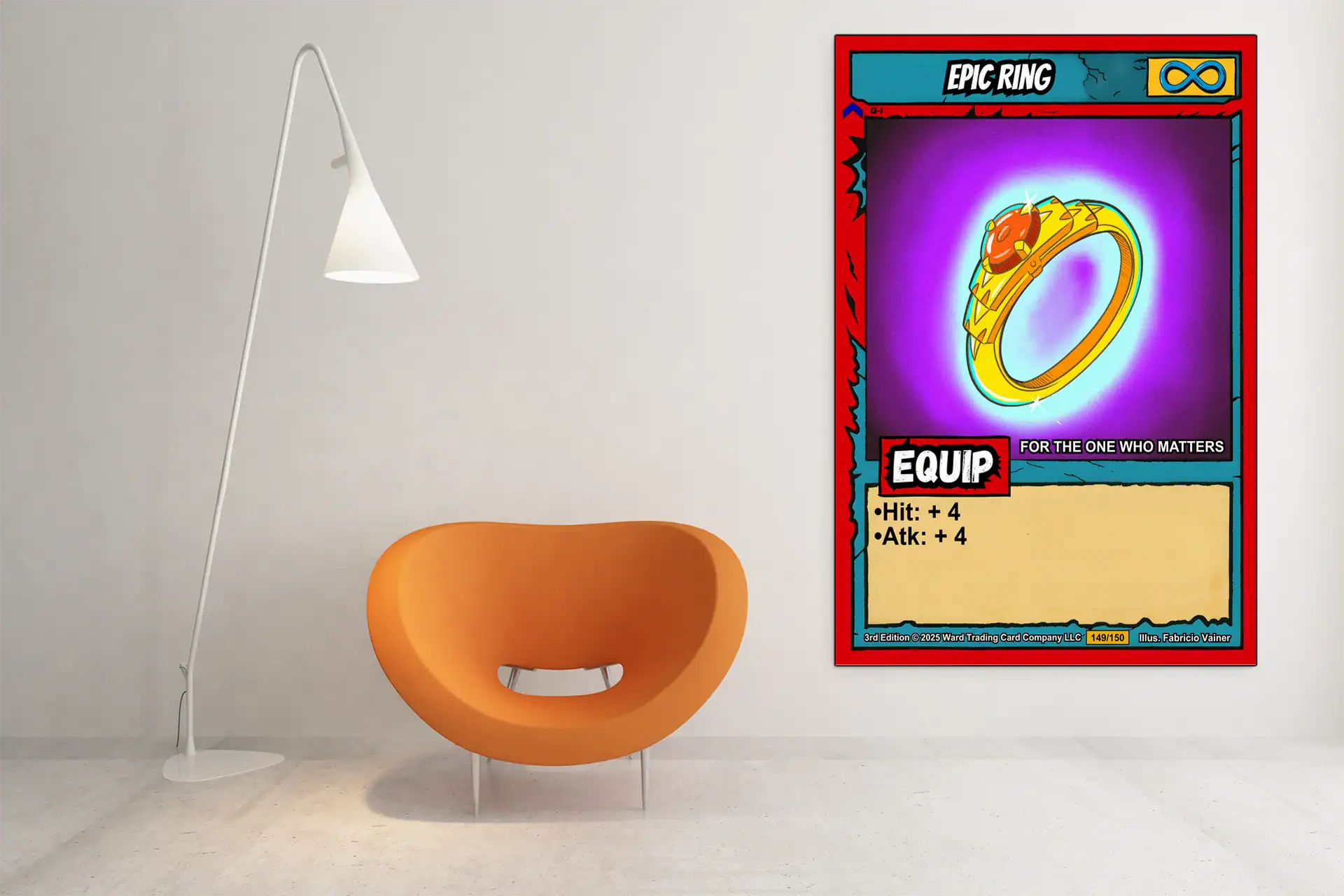 Equipment cards anchor campaign moments when heroes claim legendary artifacts. Collectors who value Ward TCG’s retro aesthetic display meaningful game elements. Moreover, this epic ring trading card canvas print celebrates pivotal character advancement.